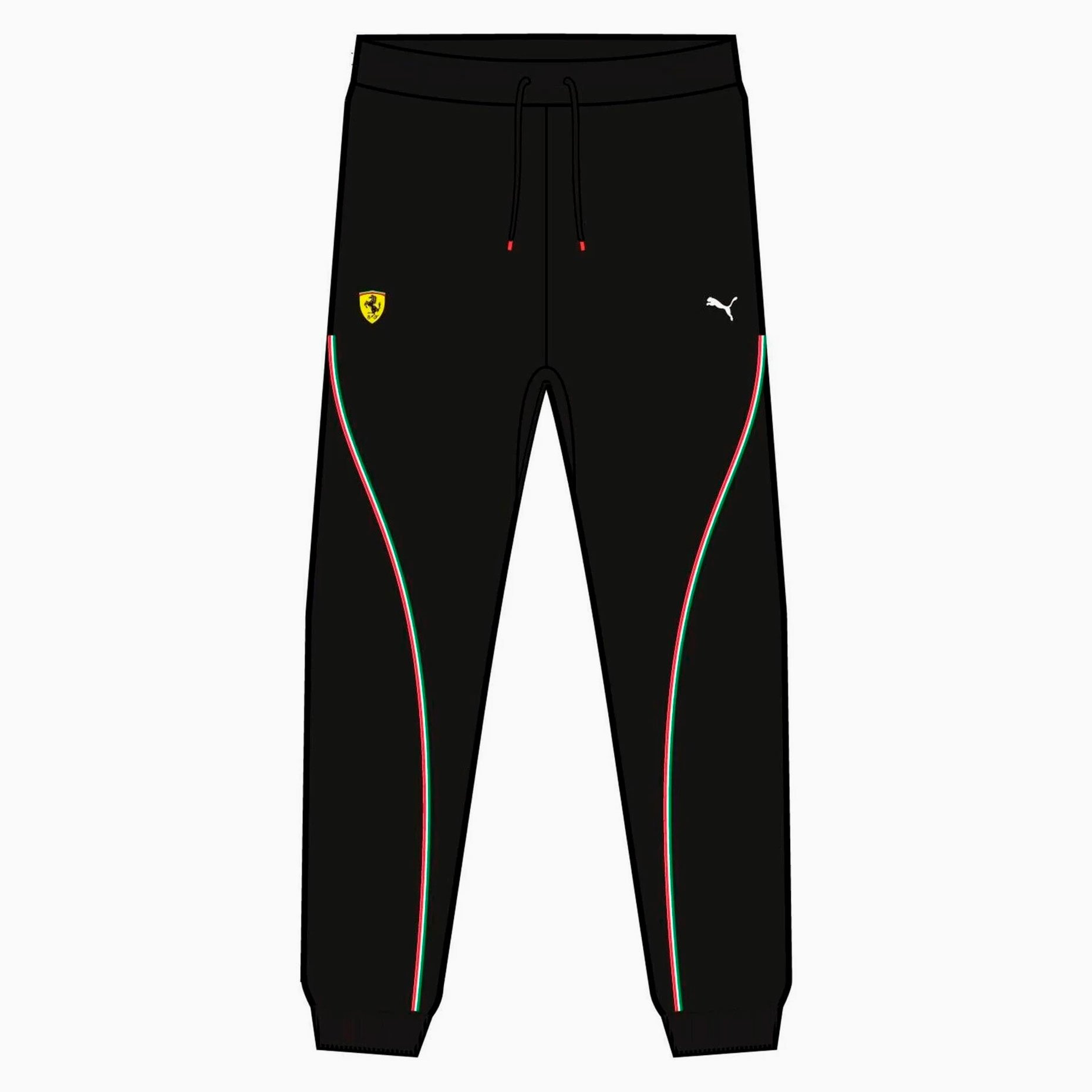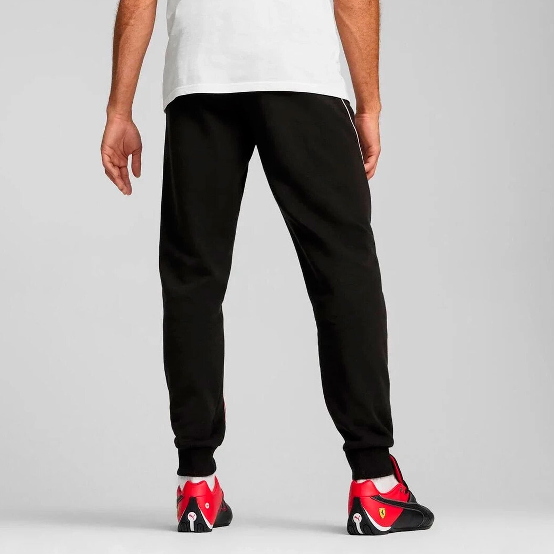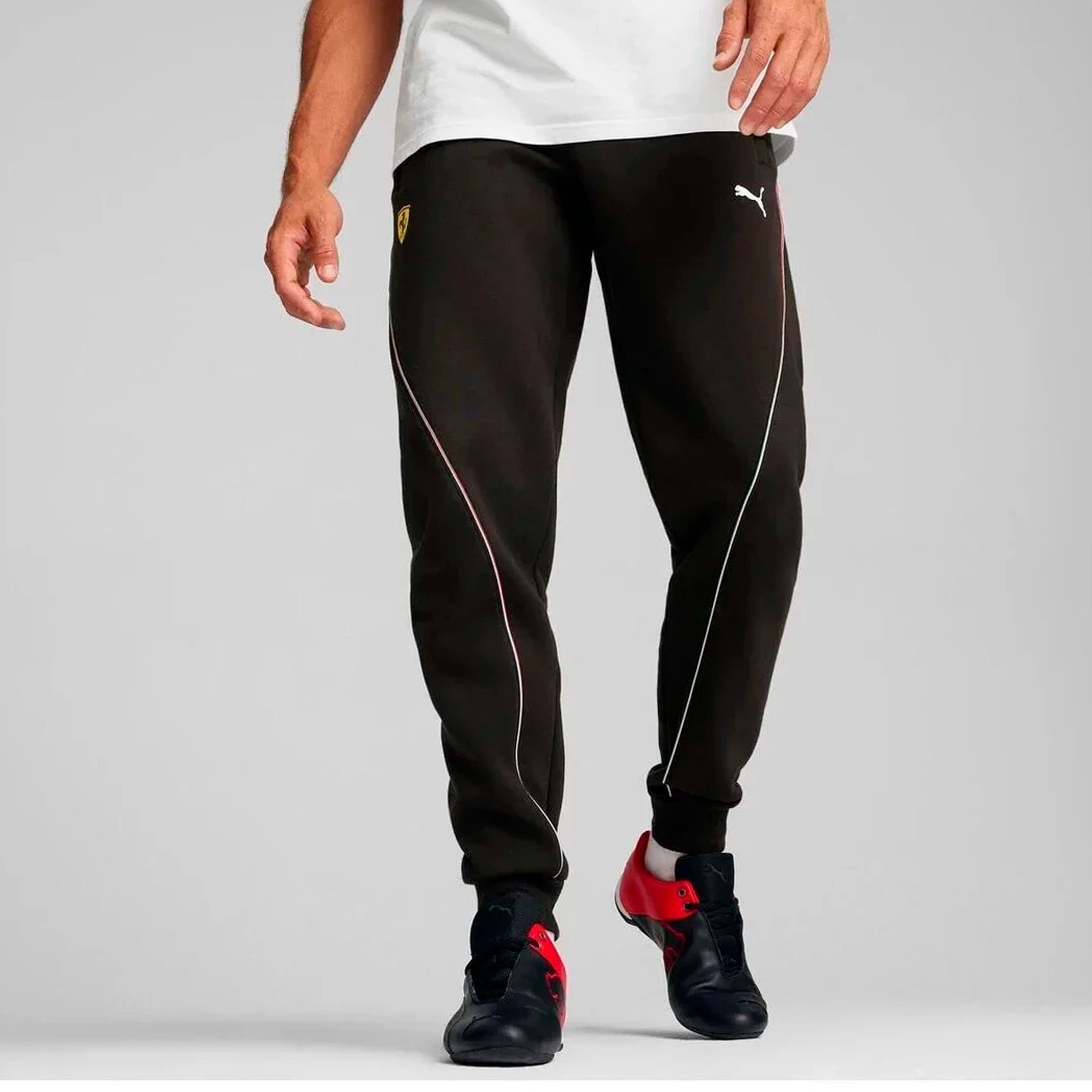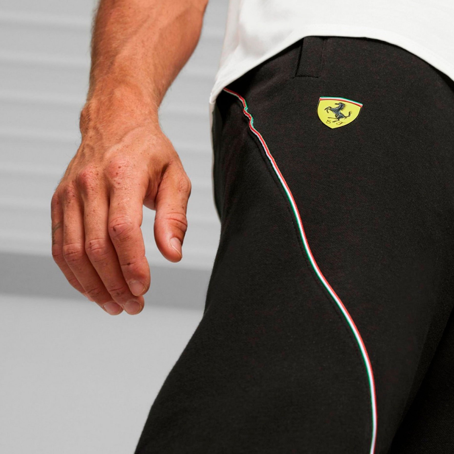 Логотип Ferrari на бедре подчеркивает эксклюзивность модели и делает брюки ярким элементом повседневного стиля, который подойдет как для активного отдыха, так и для расслабленного образа в выходные дни.