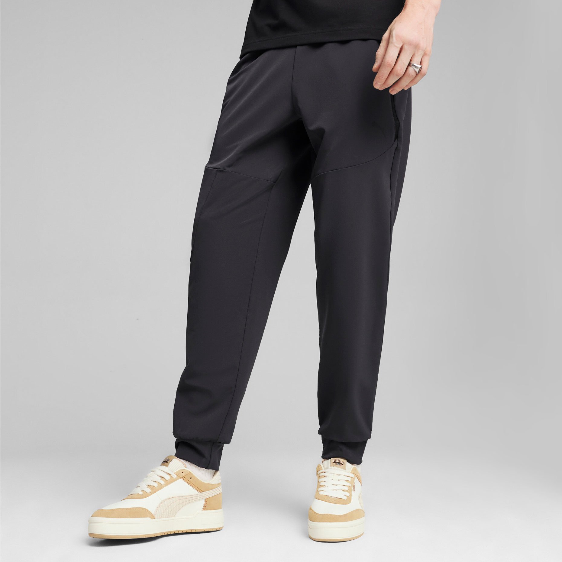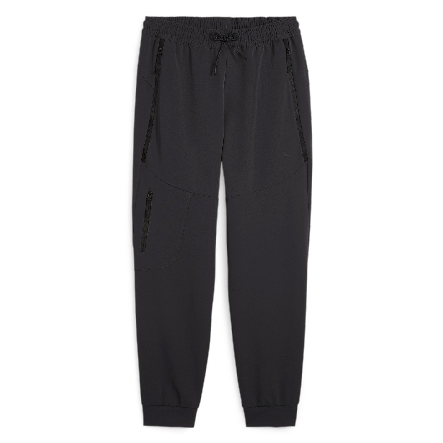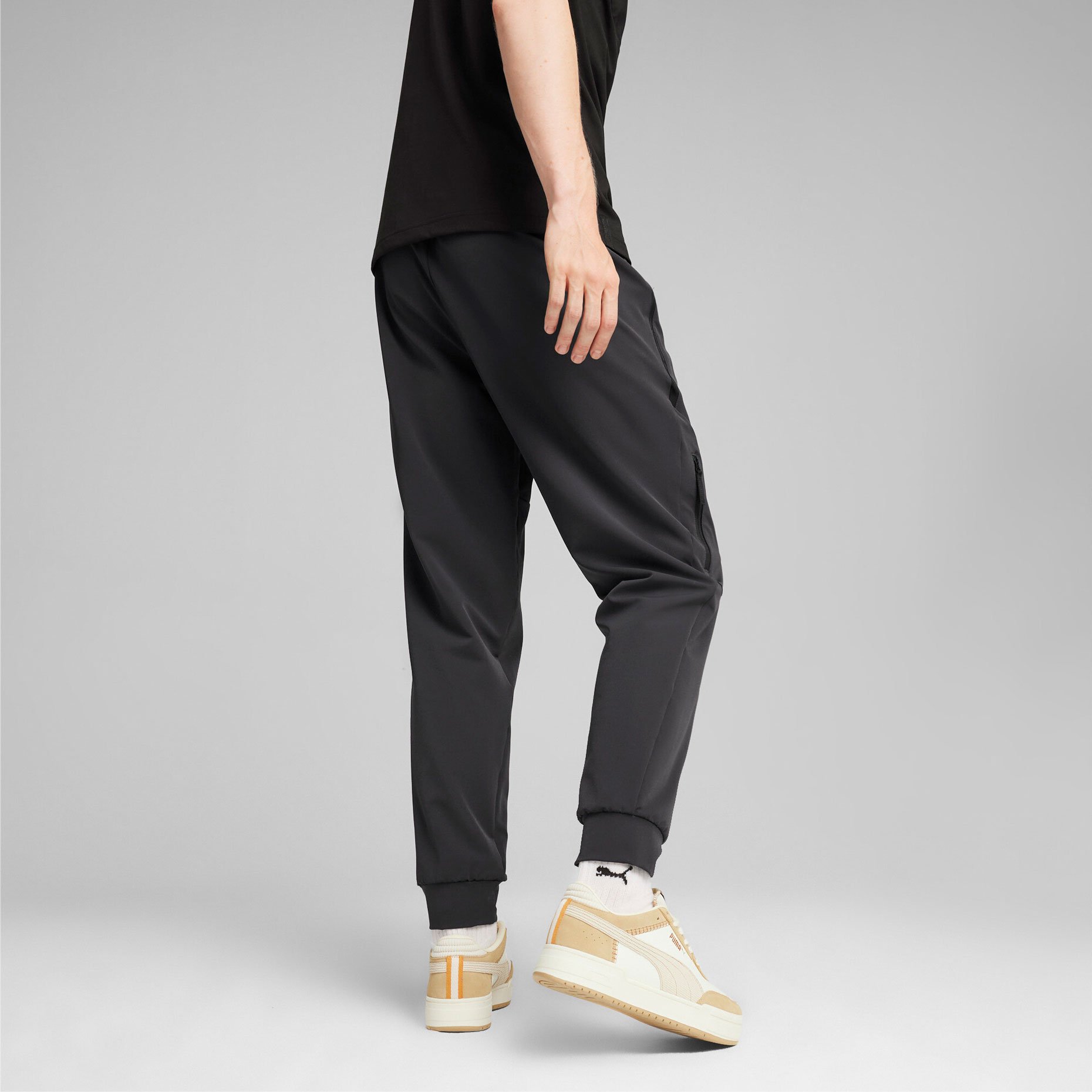 Брюки изготовлены из высококачественной ткани добби с уникальным мелким рисунком, которая приятна на ощупь и создает особый визуальный эффект. Технология dryCELL обеспечивает эффективное отведение влаги от тела, поддерживая комфорт даже во время интенсивных тренировок. Практичность модели подчеркивают эластичные элементы: пояс со шнурком для индивидуальной посадки, боковые карманы с обратными молниями и накладной карман на молнии для хранения необходимых мелочей. Декоративные элементы включают оригинальные детали из ленты линии PUMATECH и вышитый логотип PUMA Cat на левой штанине.