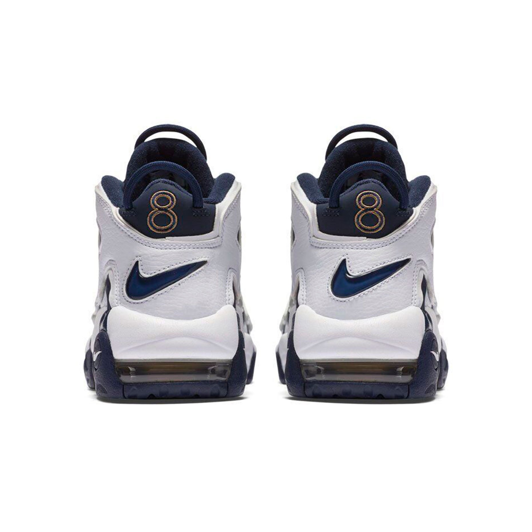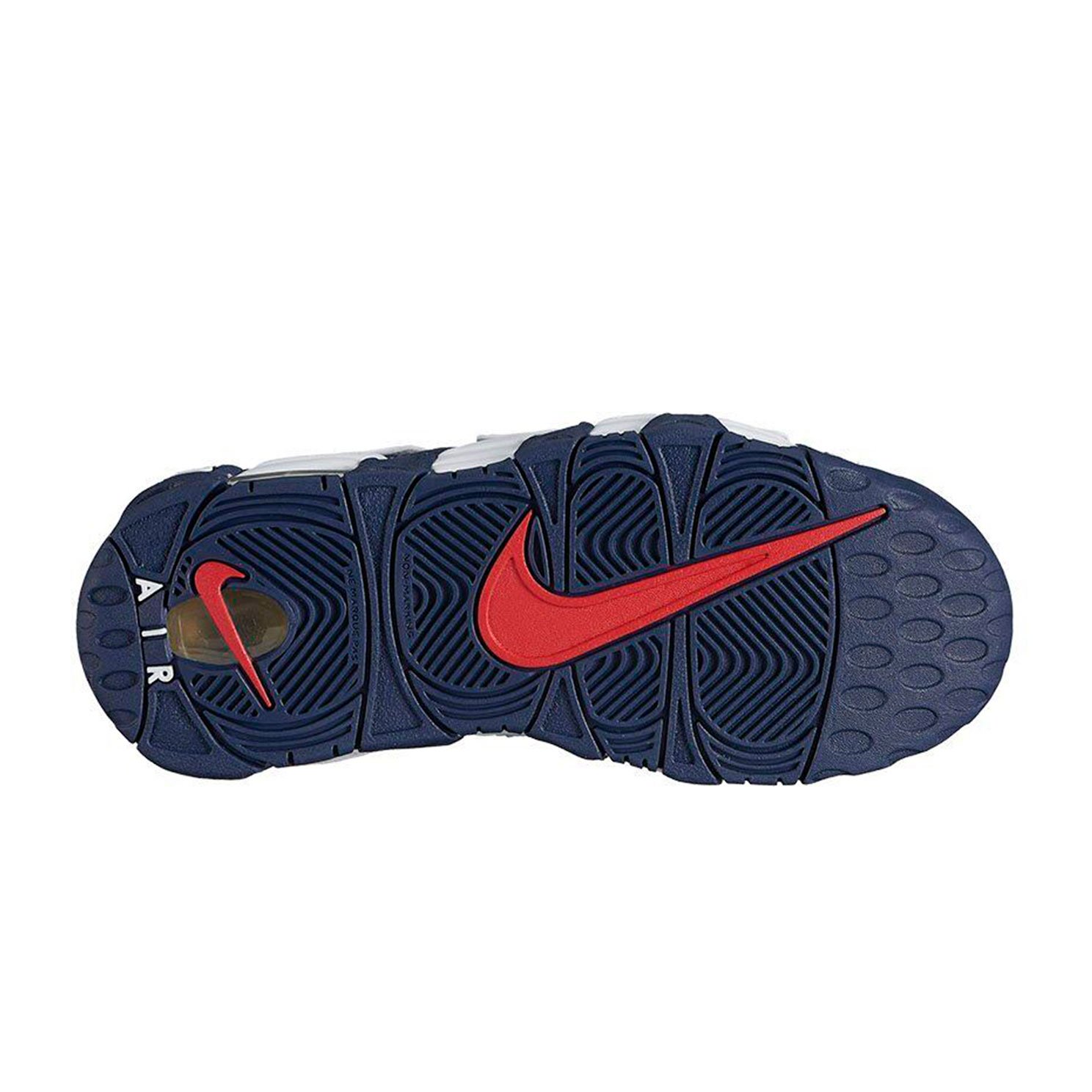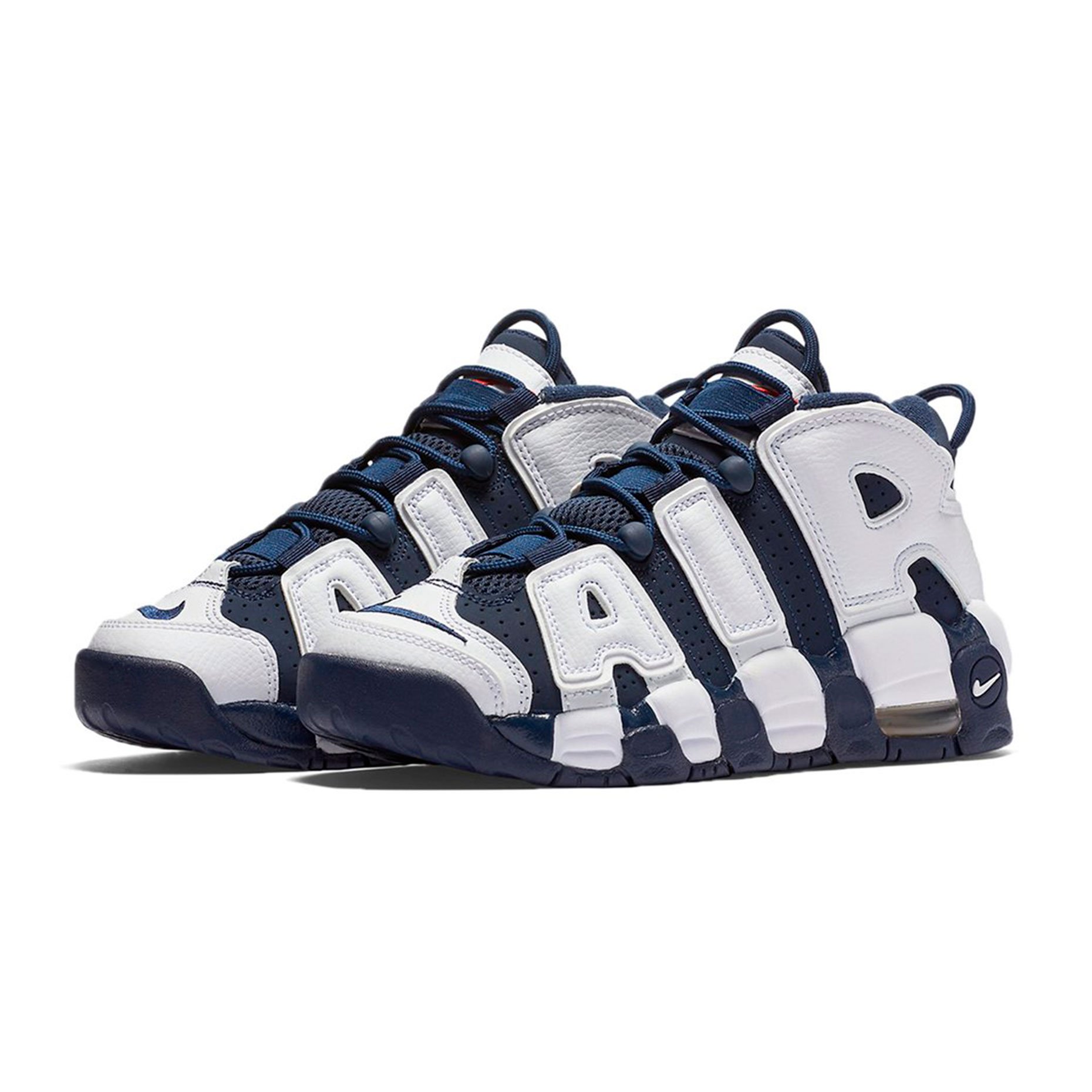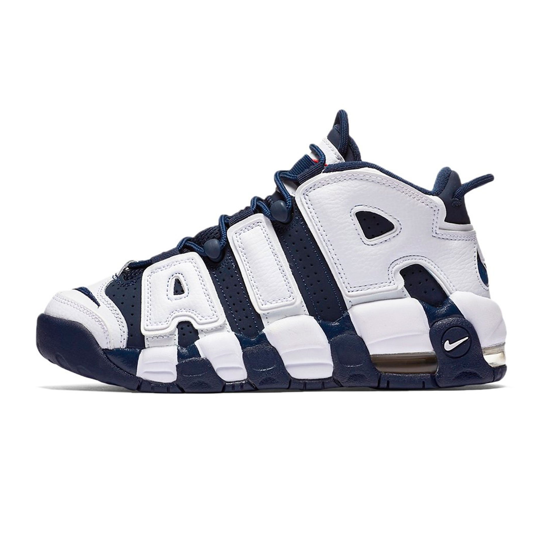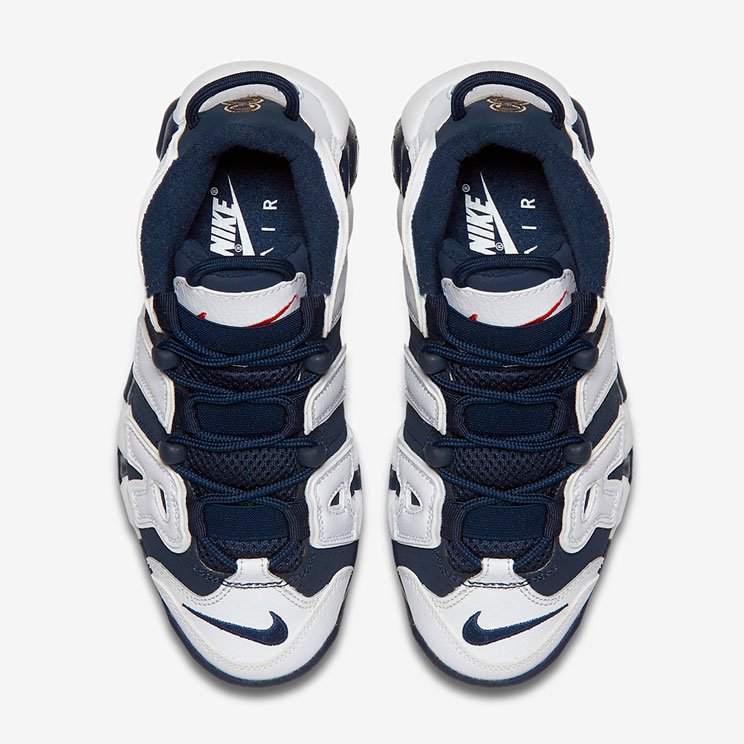 Яркие запоминающиеся кроссовки Nike Air More Uptempo Olympic сине-белого цвета со вставками из натуральной кожи.