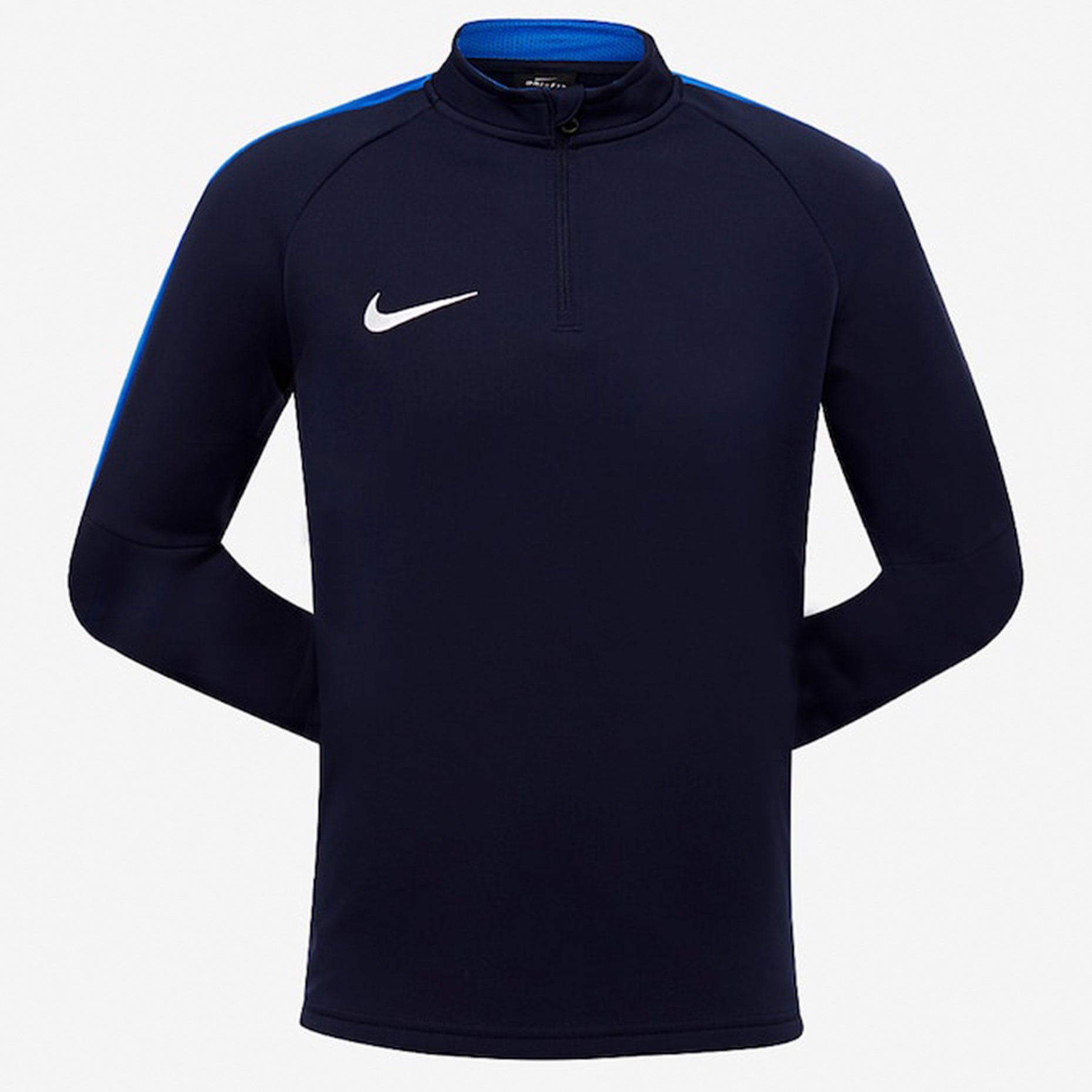 Детский джемпер для футбола Найк приталенного кроя с длинными рукавами не сковывает движений. Воротник-стойка обеспечивает дополнительную защиту от холода. Молния длиной в ¼ предназначена для более удобного переодевания и регулирования вентиляции.