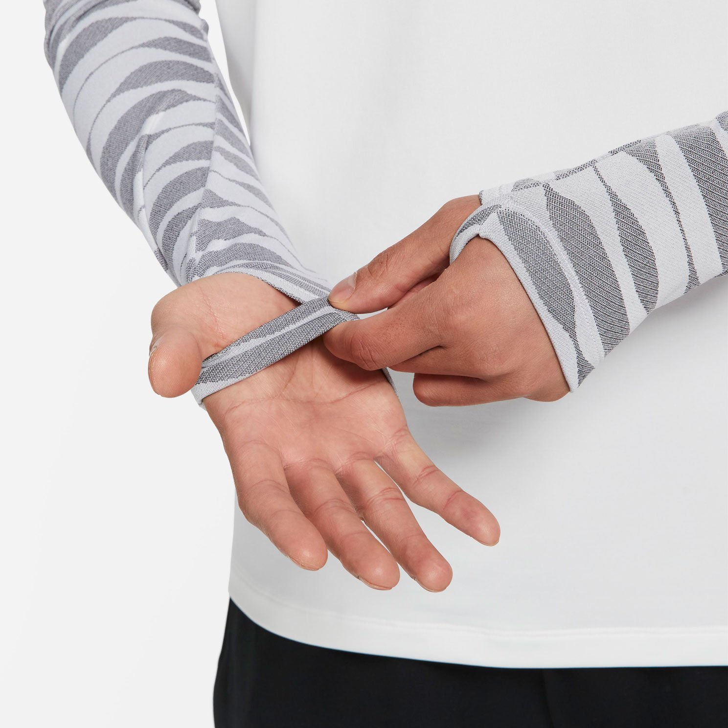 • Манжеты из эластичной ткани с невидимыми отверстиями для больших пальцев фиксируют рукава, при этом отверстия остаются полностью.