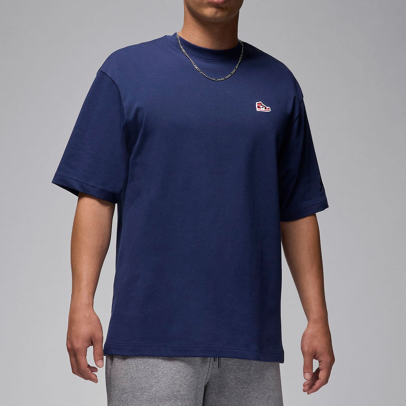 Эта футболка станет отличным дополнением к вашему повседневному образу. Хлопок обеспечивает комфорт и удобство в носке, а вышитая нашивка кроссовка AirJordan1 добавляет изюминку в ваш стиль. Носите ее в сочетании с классическими кроссовками для создания стильного спортивного лука.