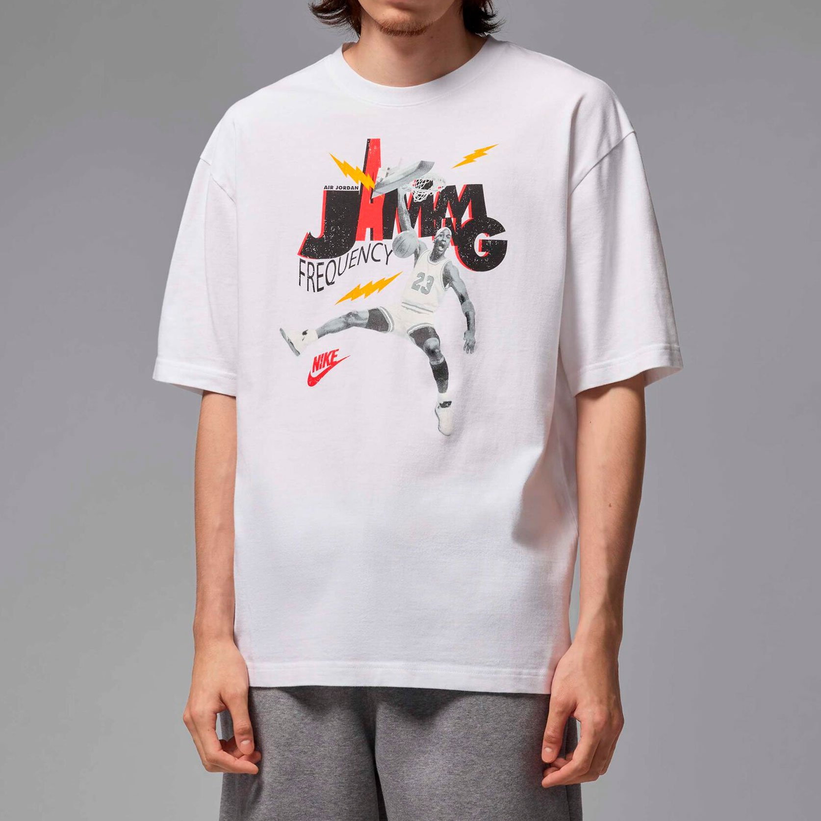 Футболка Jordan Jam 85 Tee — это стильное и динамичное воплощение баскетбольной культуры с изображением легендарного Майкла Джордана. На передней части футболки красочно изображен прыжок Короля баскетбола, окруженный молниями, что создает эффектный и энергичный образ. Над изображением расположена надпись “JAMM”, которая добавляет особый характер дизайну. Завершает композицию логотип Nike в красном цвете, расположенный в нижней части.