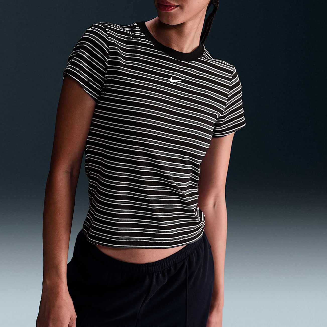 Футболка Nike Sportswear Chill Knit Slim Striped Tee представляет собой современную интерпретацию классической полосатой модели. Укороченный приталенный силуэт придает изделию стильный вид, а высококачественный трикотаж делает еe невероятно комфортной для ежедневной носки.