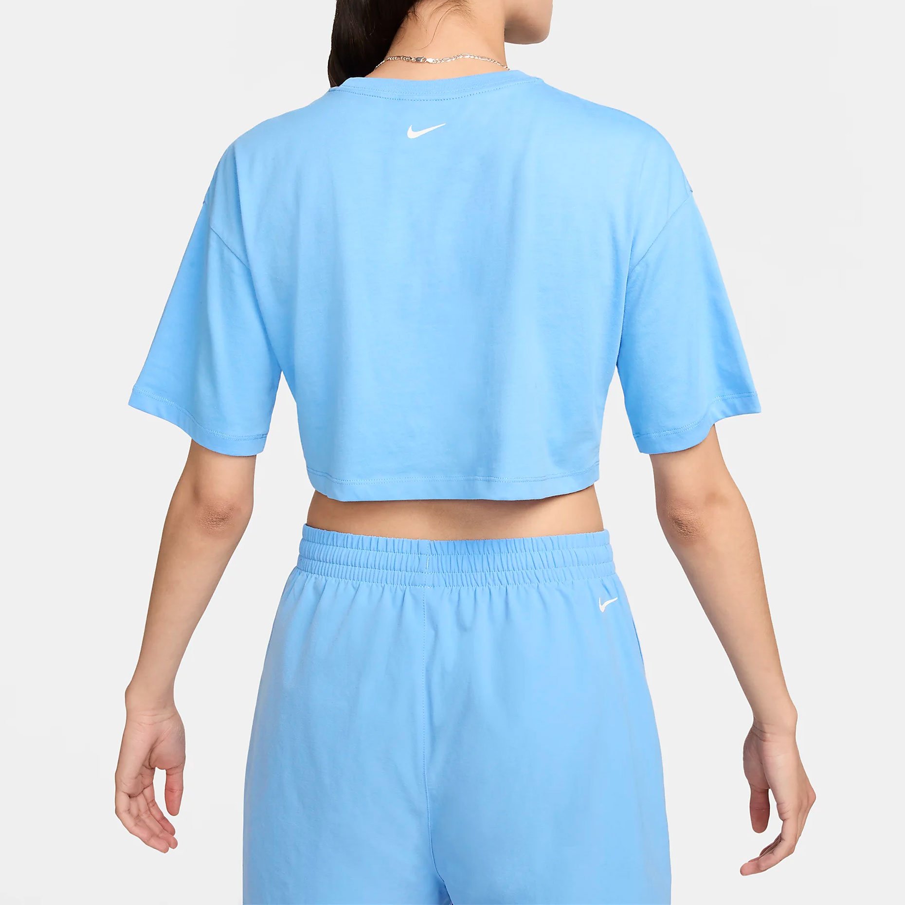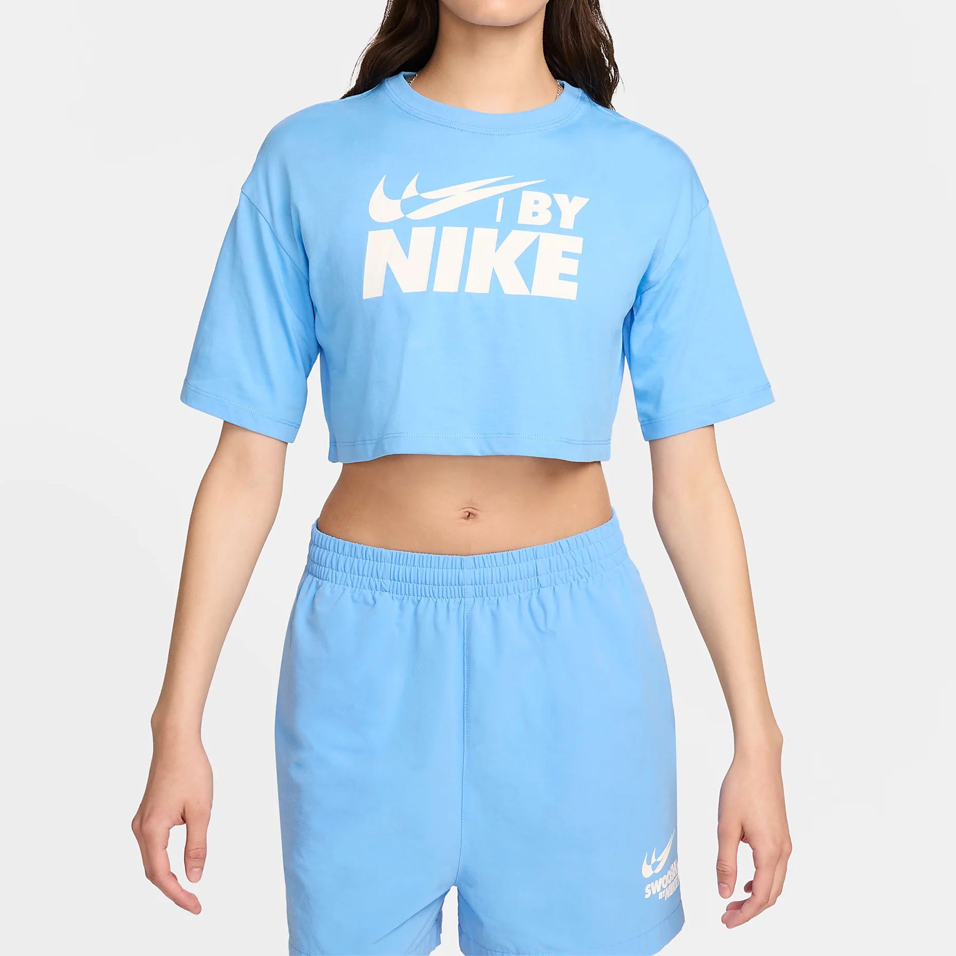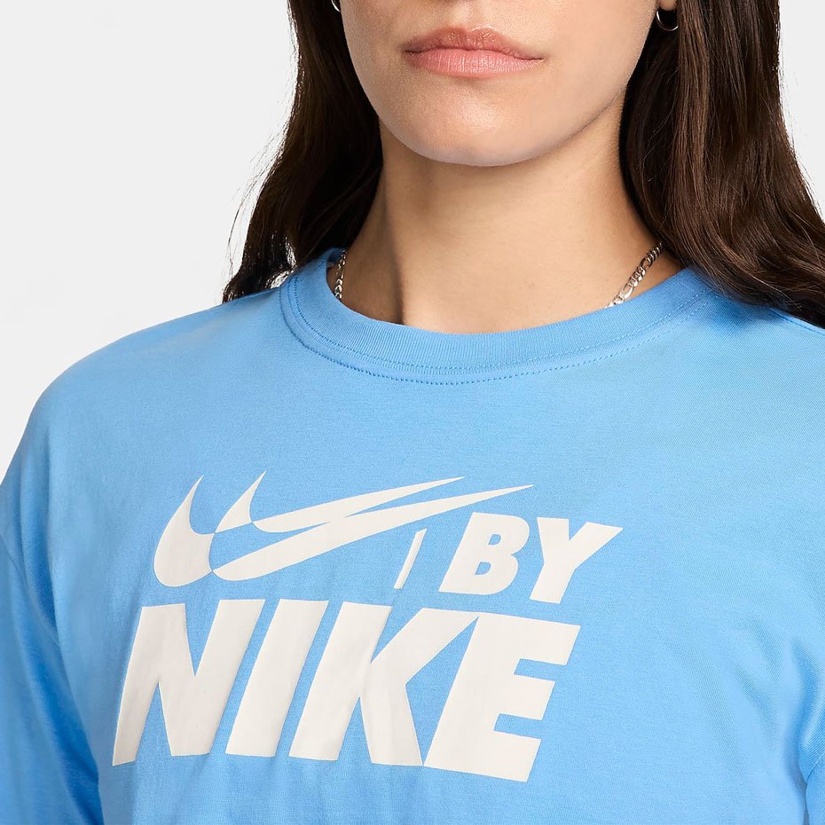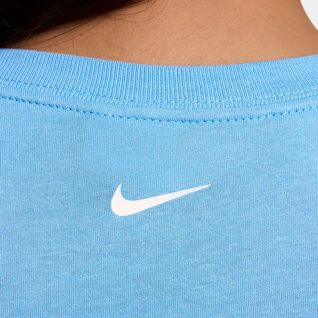 Футболка имеет свободный крой, что придаёт ей расслабленный и стильный вид. На груди расположена узнаваемая эмблема Swoosh, которая подчёркивает принадлежность к бренду Nike. Укороченный дизайн подчёркивает фигуру, не сковывая движений, что делает её отличным выбором для тренировок или активного отдыха.