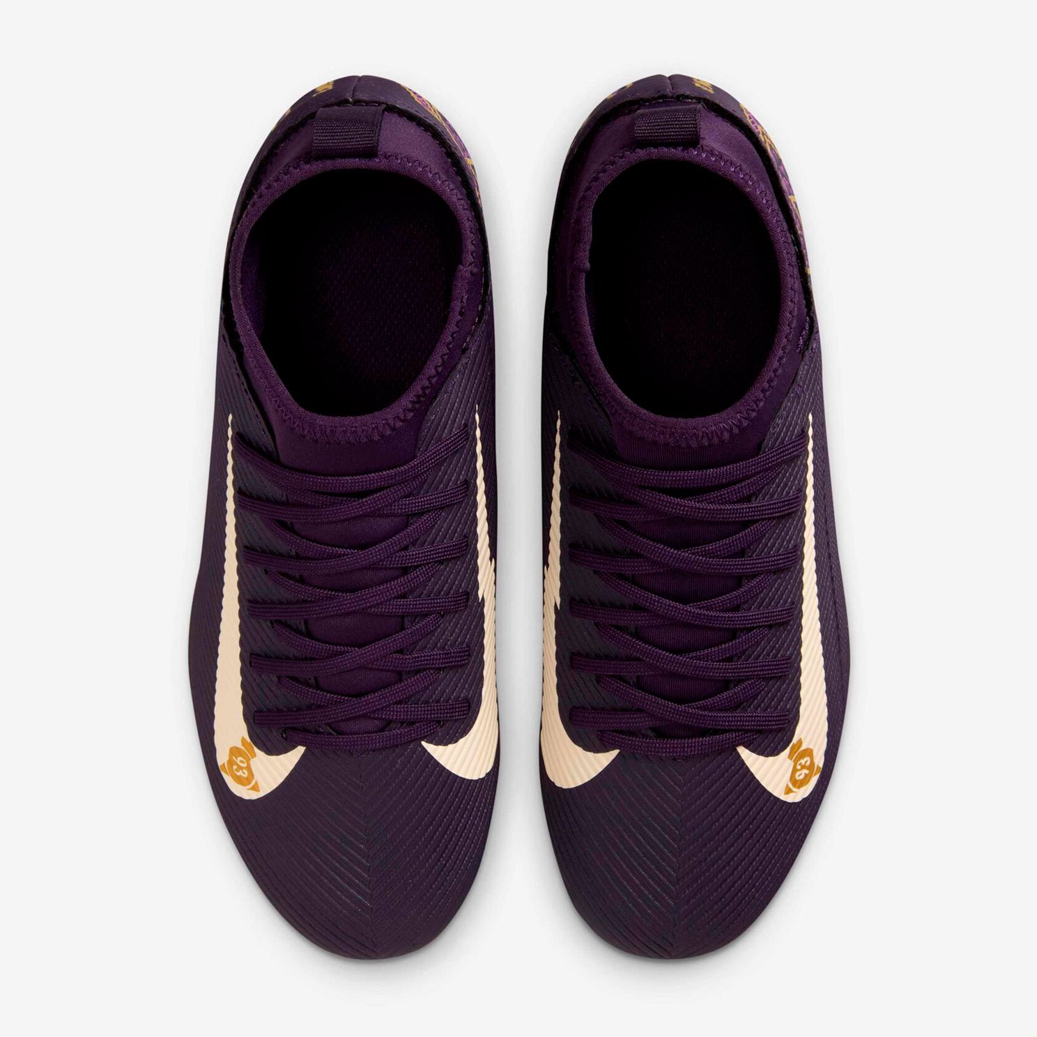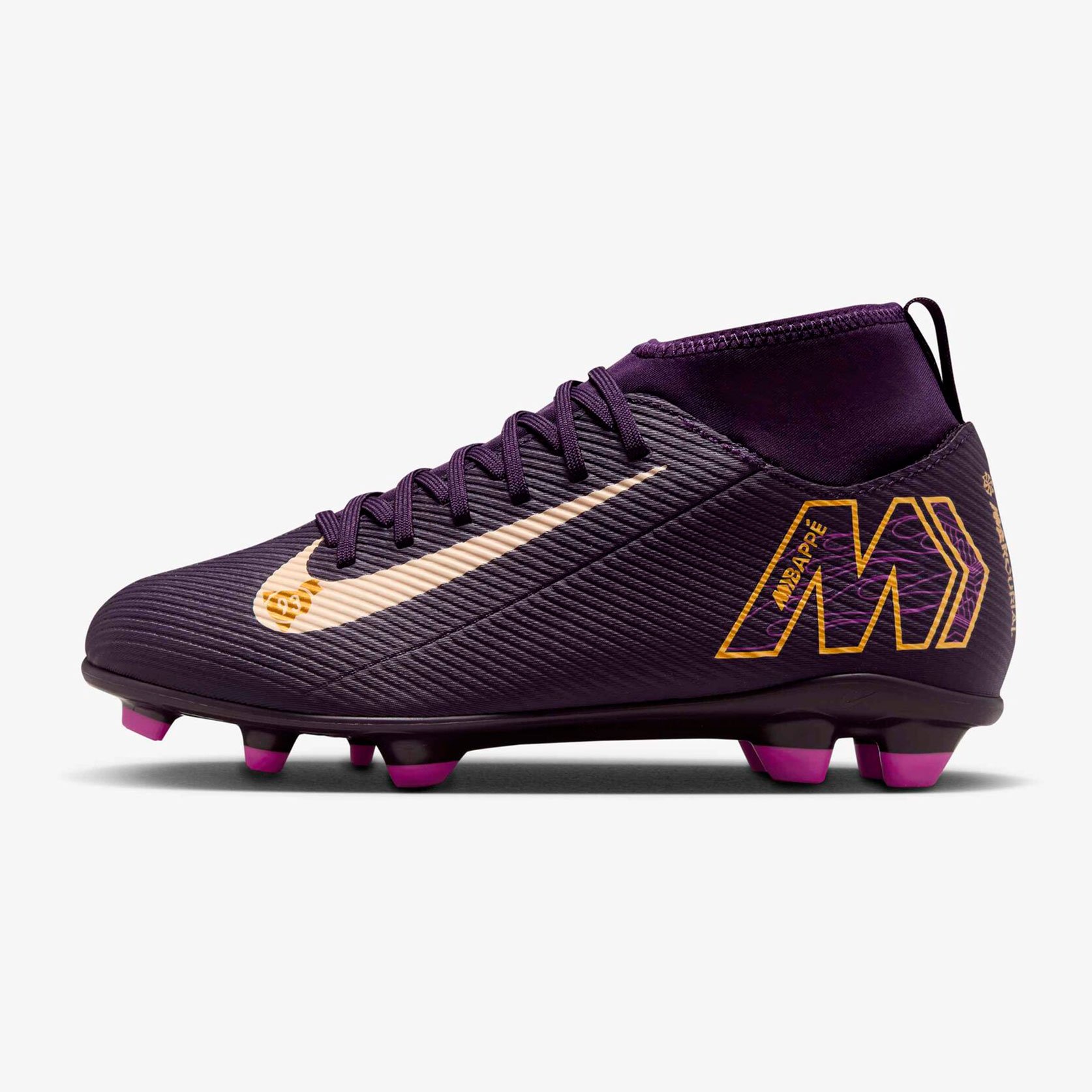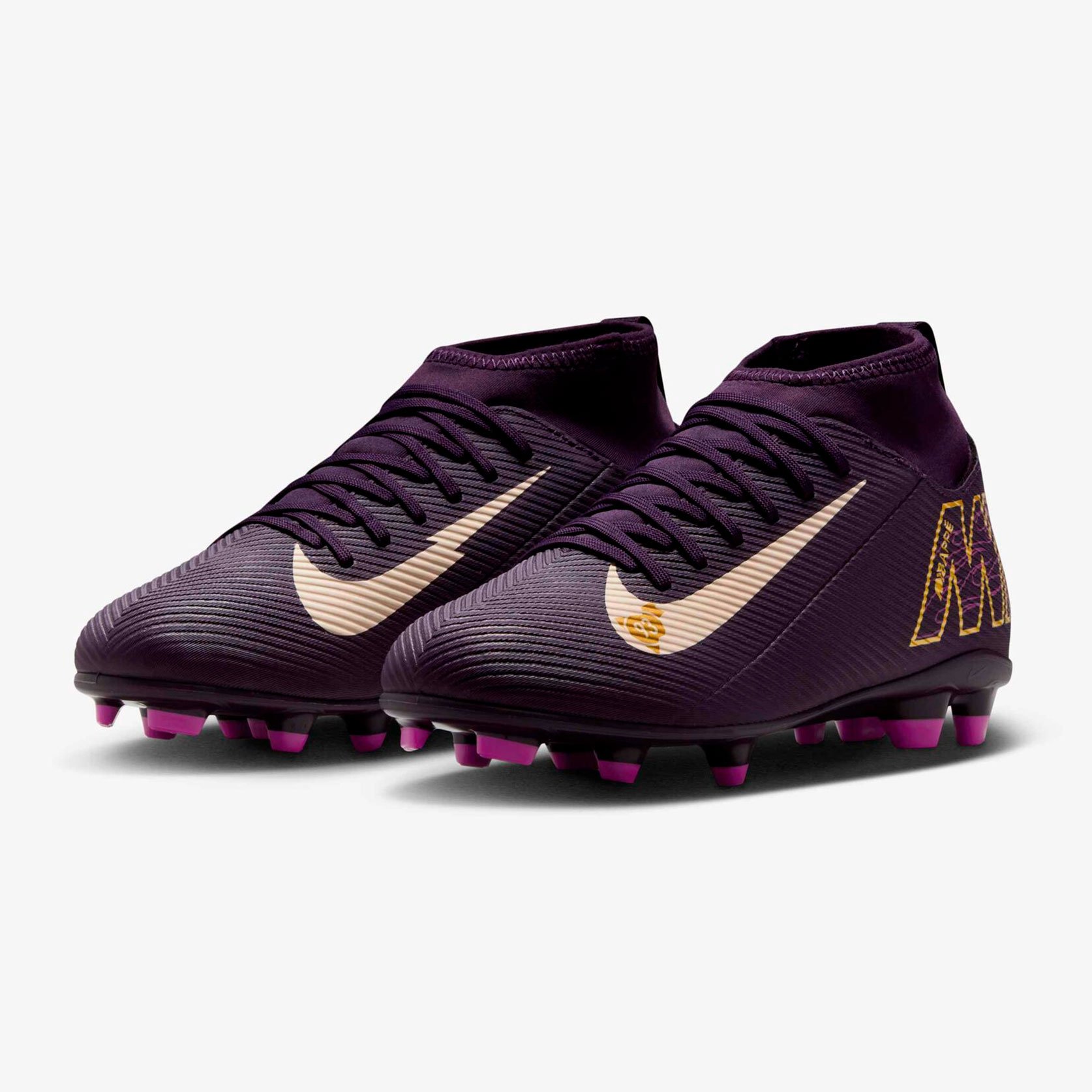 Детские бутсы Nike Mercurial Superfly 10 Club KM - это стильные детские бутсы сочетают в себе элементы различных эпох, воплощая дух знаменитого футболиста. Модель выполнена в эффектной цветовой гамме: фиолетовом цвете с элементами «слоновой кости» и золотой отделкой, украшенной символикой Rising Fire и отсылками к Bondy Dreams. Бутсы созданы специально для начинающих игроков и подходят для игры на жестких полях с натуральным или искусственным покрытием.
