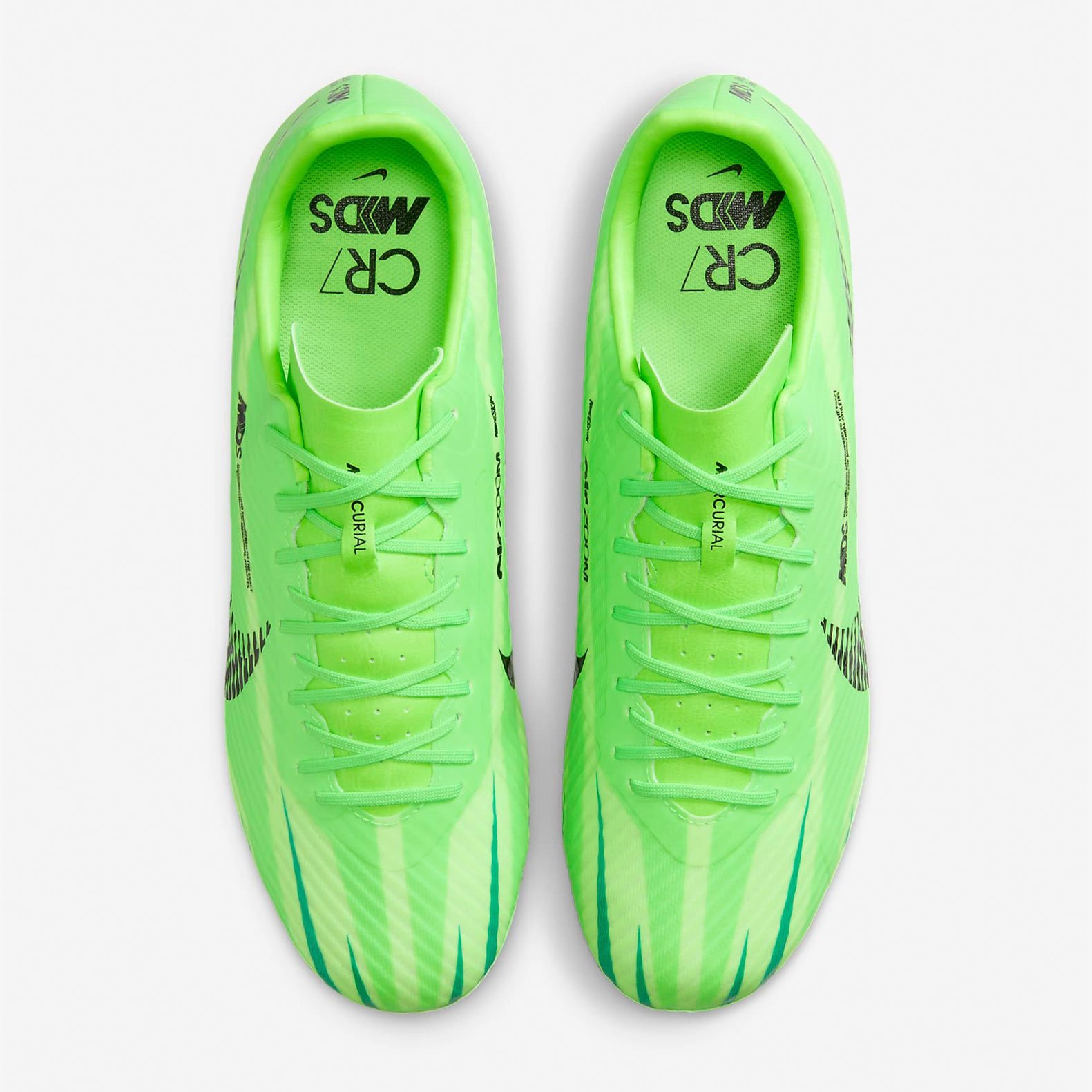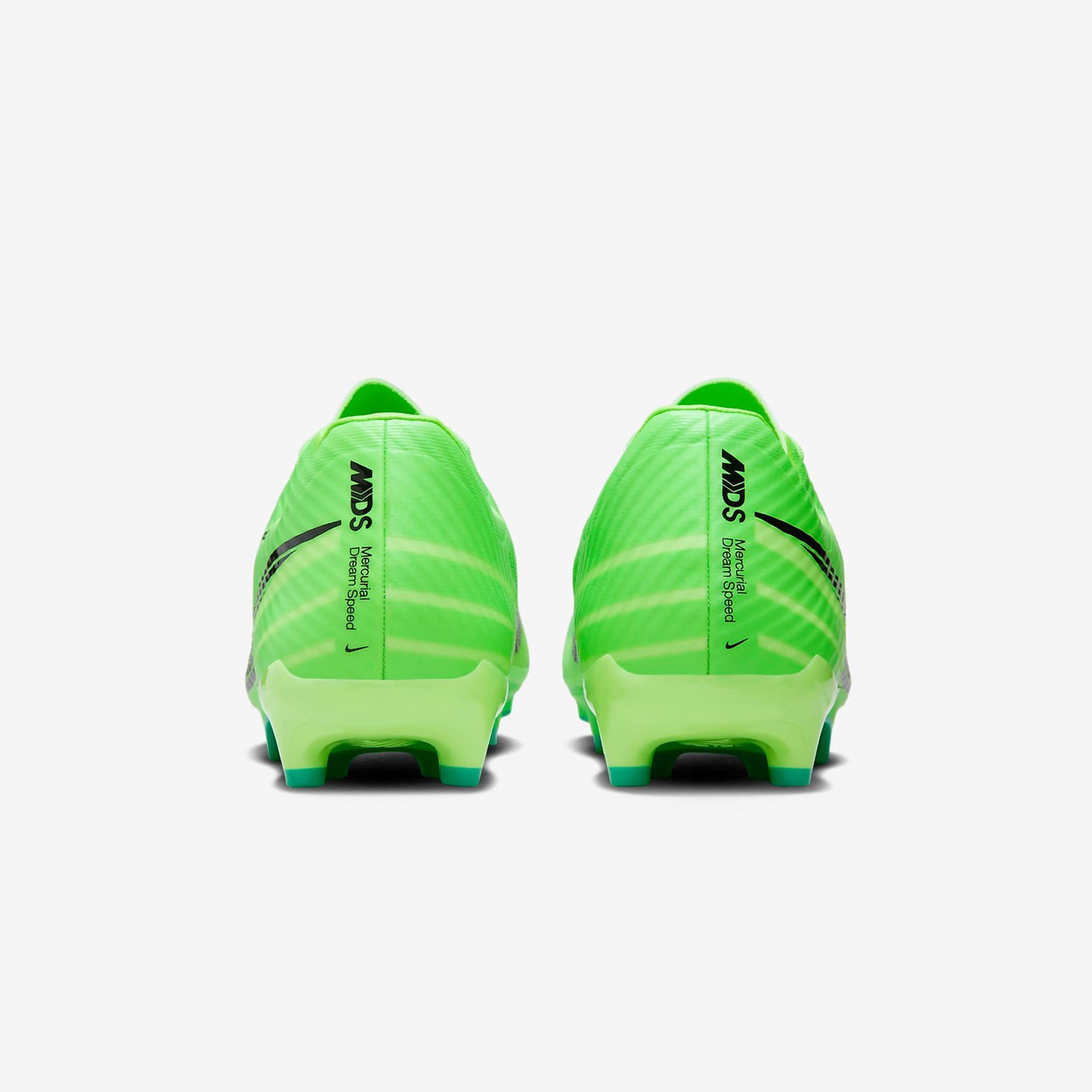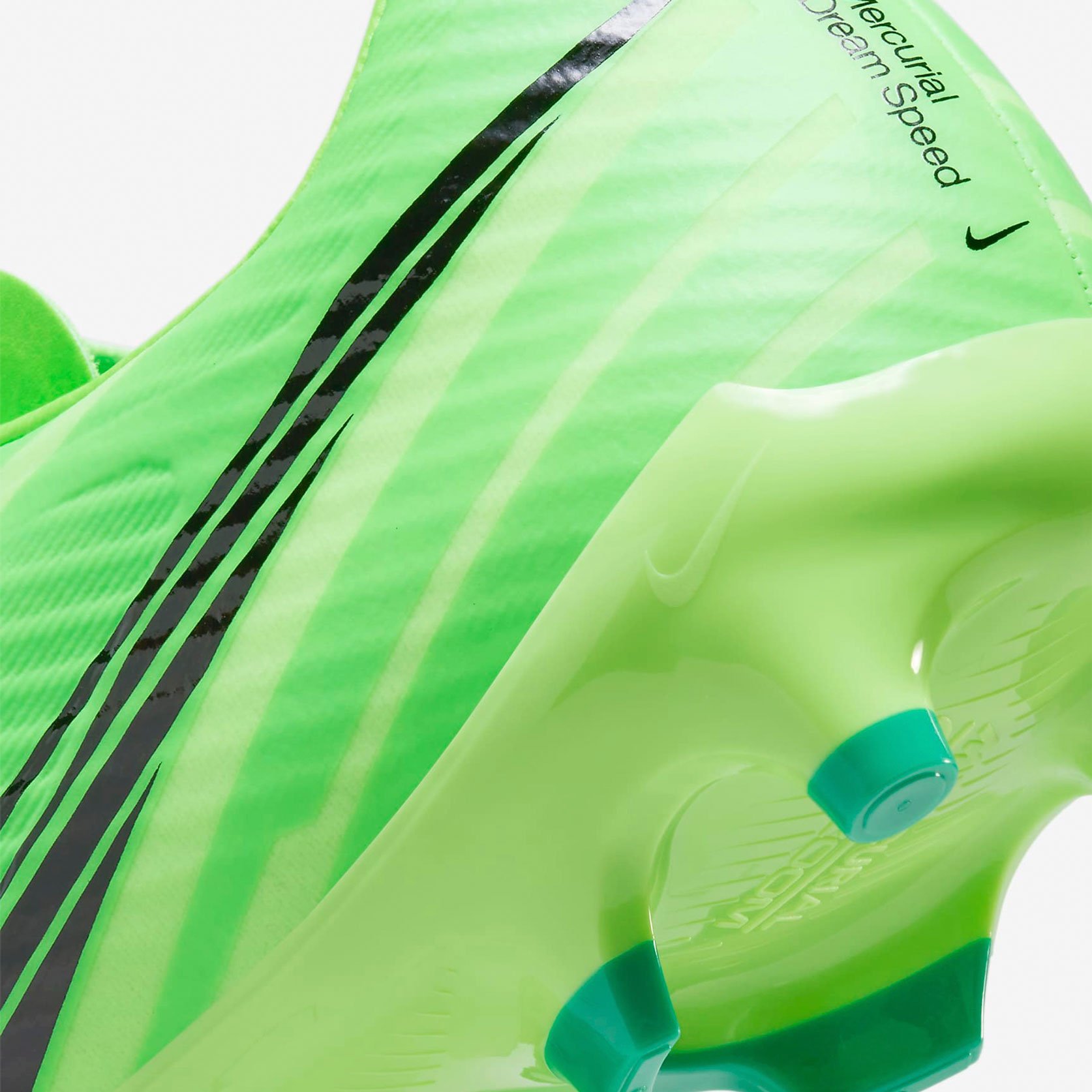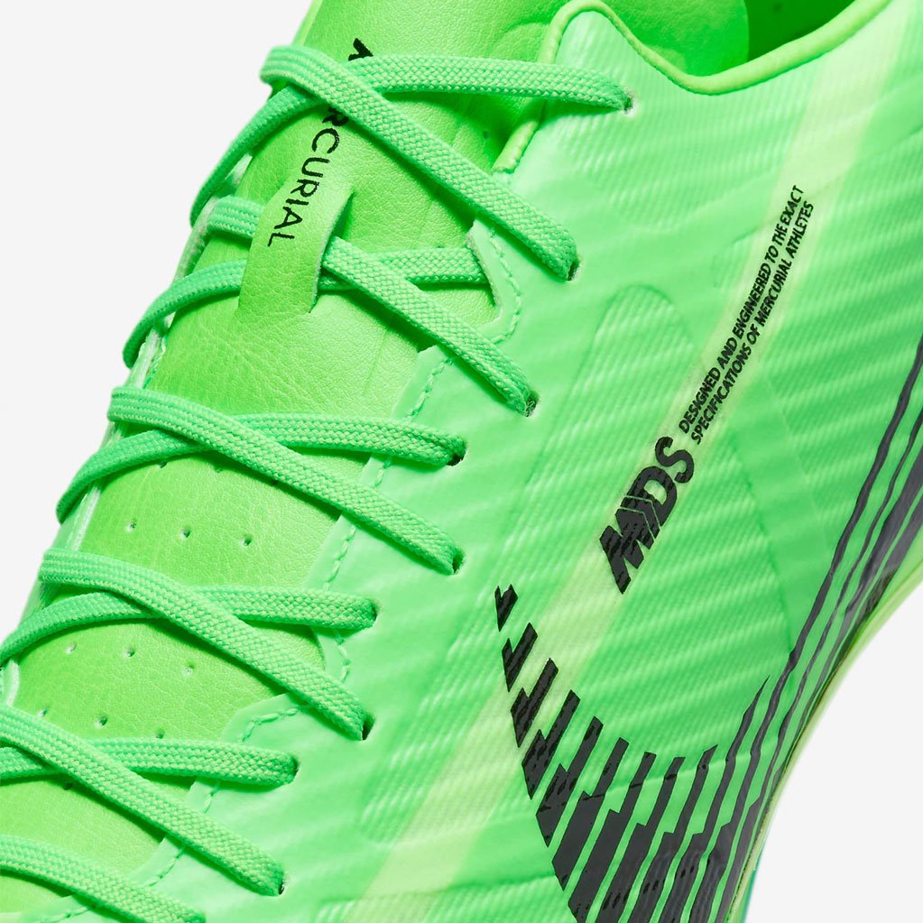 В психологии цвета зеленый символизирует энергию, позитив и видимость. На зеленую основу наложен черный брендинг, который выделяется большим текстурированным графическим изображением Swoosh, сходящимся по боковой стороне. Дополнительные зеленые оттенки используются для создания рисунка, исходящего от пальцев ног, создавая ощущение скорости и движения.