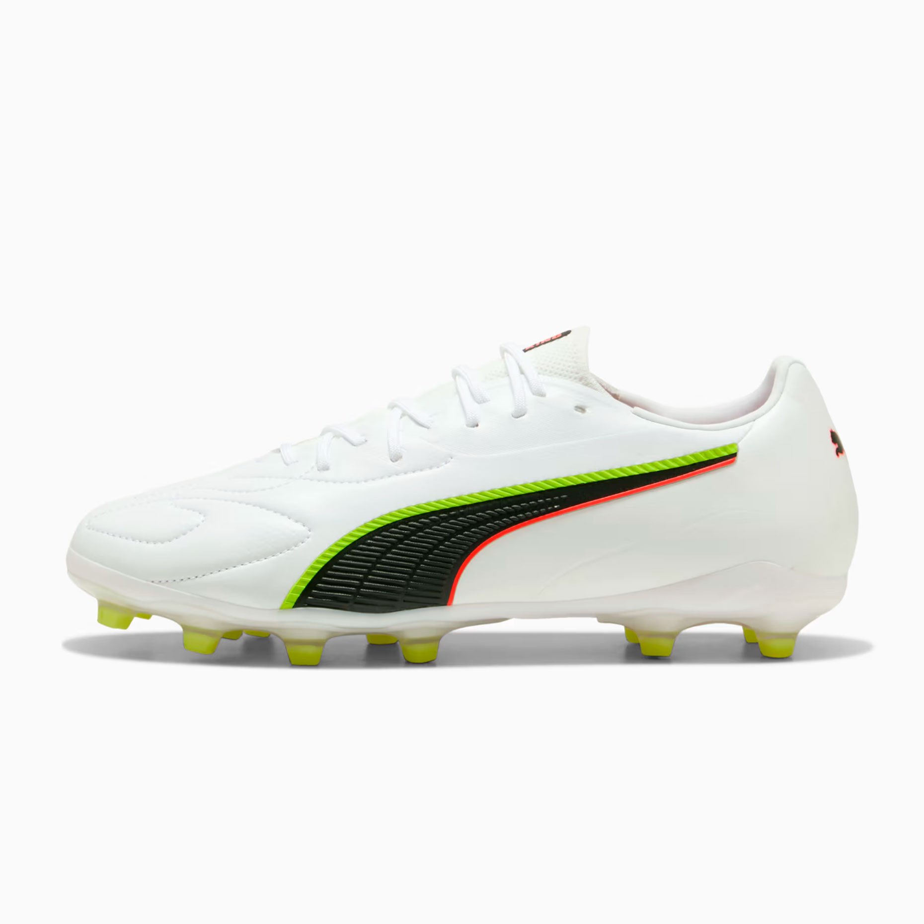 Лёгкая подошва FG/AG разработана специально для искусственной и натуральной травы, обеспечивая полный контроль над движениями так же, как и над мячом, с отличной манёвренностью и стабильностью. Зоны сцепления, вырезанные лазером, и 3D-текстура усиливают владение мячом при дриблинге, передачах и ударах, а мягкая пяточная подкладка со временем принимает индивидуальную форму стопы. Верхняя часть обуви изготовлена как минимум на 20% из переработанных материалов, сочетая легендарную классику Puma King с современным экологичным подходом.