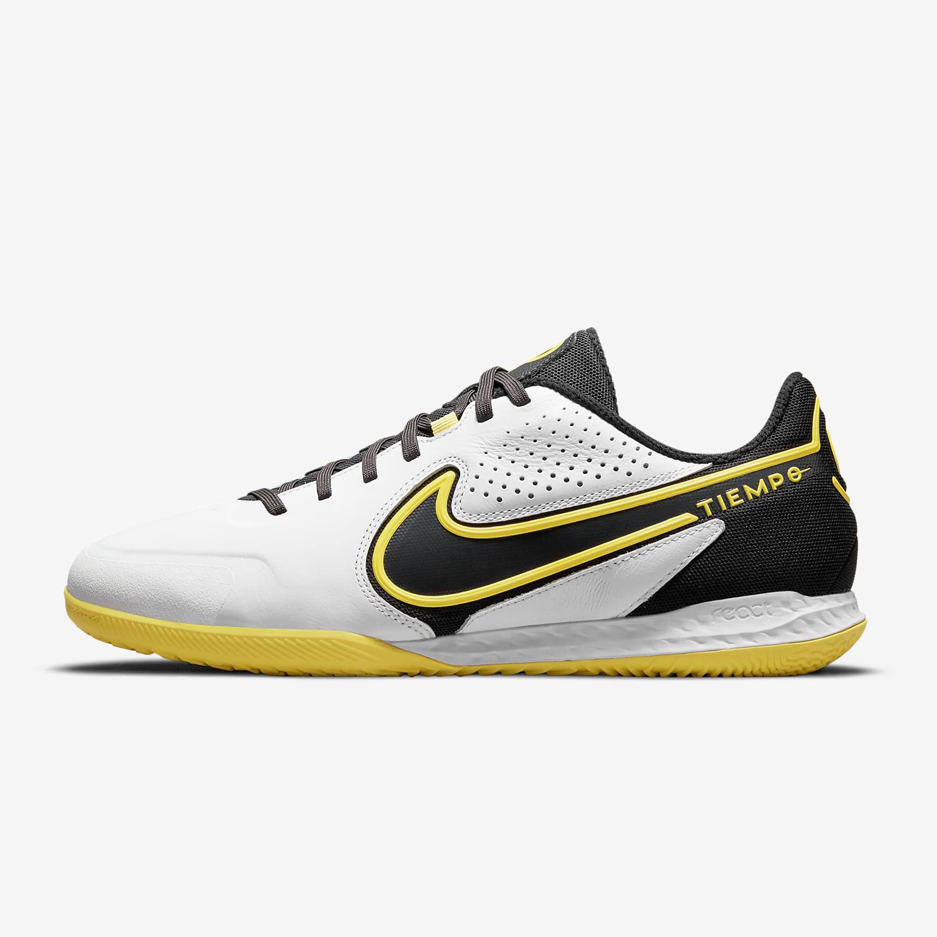 Футбольная обувь для зала Nike React Tiempo Legend 9 Pro — одна из самых легких на сегодняшний день моделей линейки Tiempo. Благодаря мягкой коже они быстро принимают форму стопы, обеспечивая комфорт и плотную посадку. Верх с рельефной текстурой дополнен мягкими подушечками из пеноматериала для точного дриблинга, передач и ударов, промежуточная подошва с технологией React, придает необходимую упругость и мягкость при игре в зале.