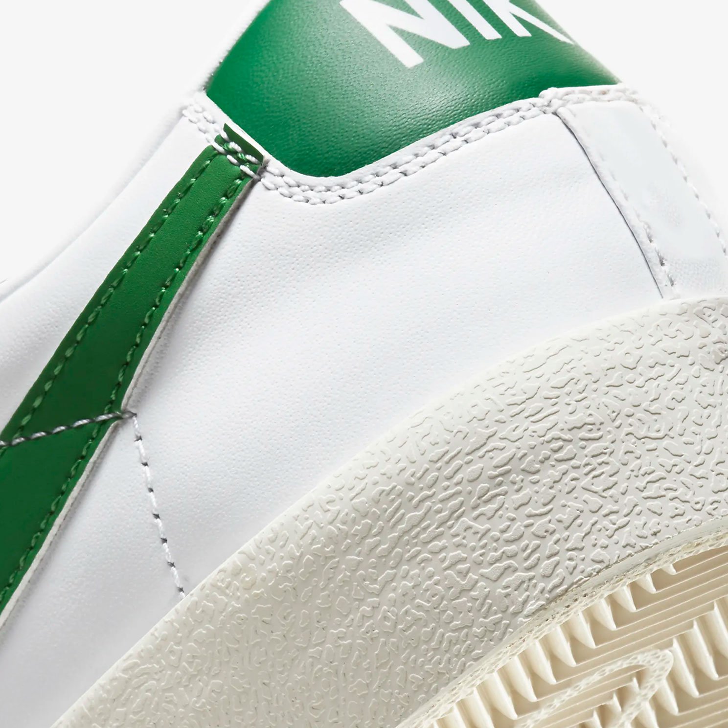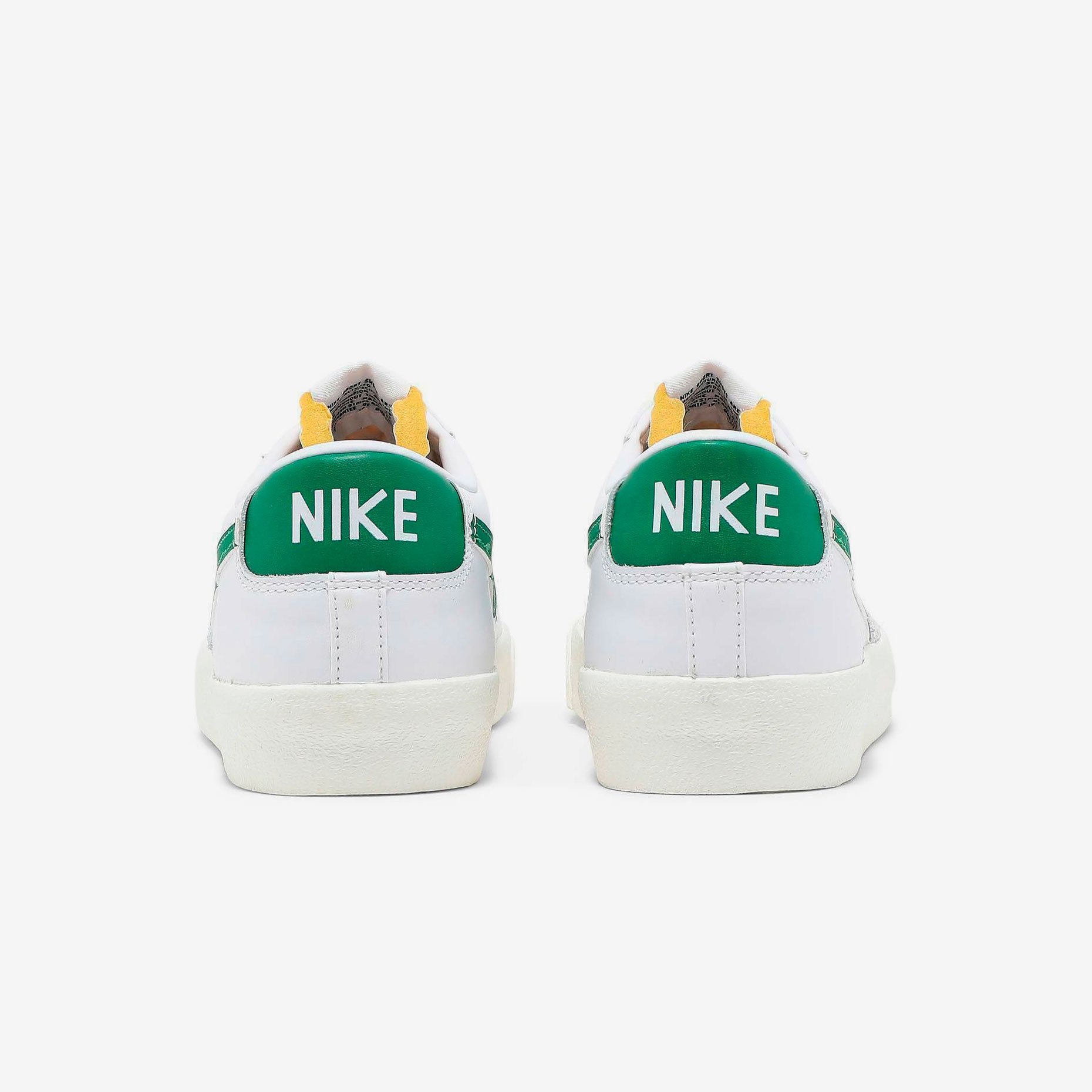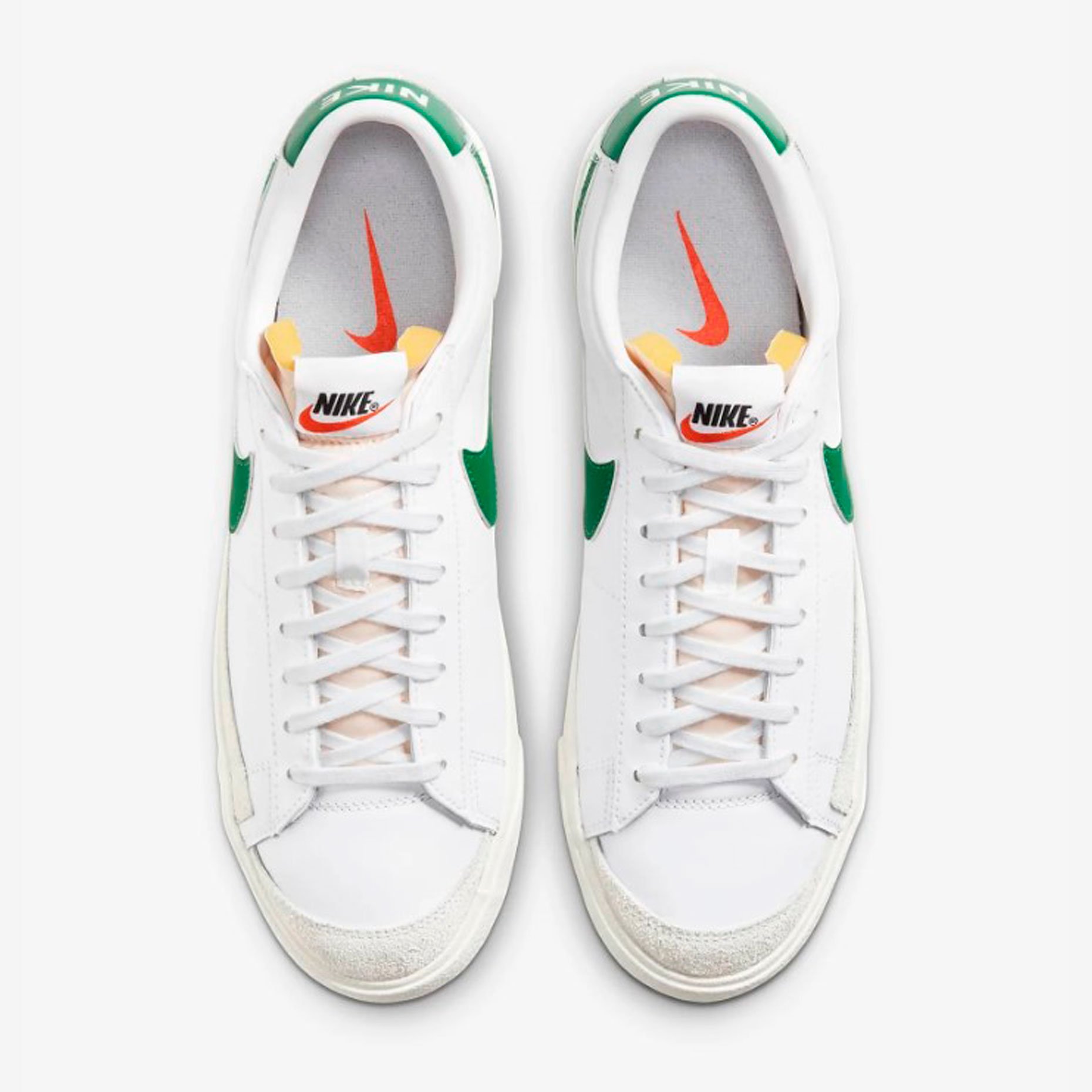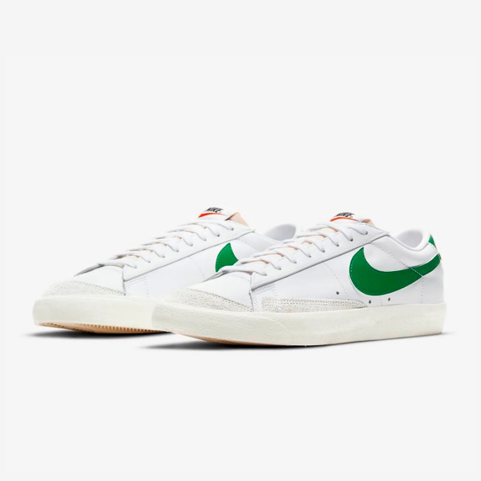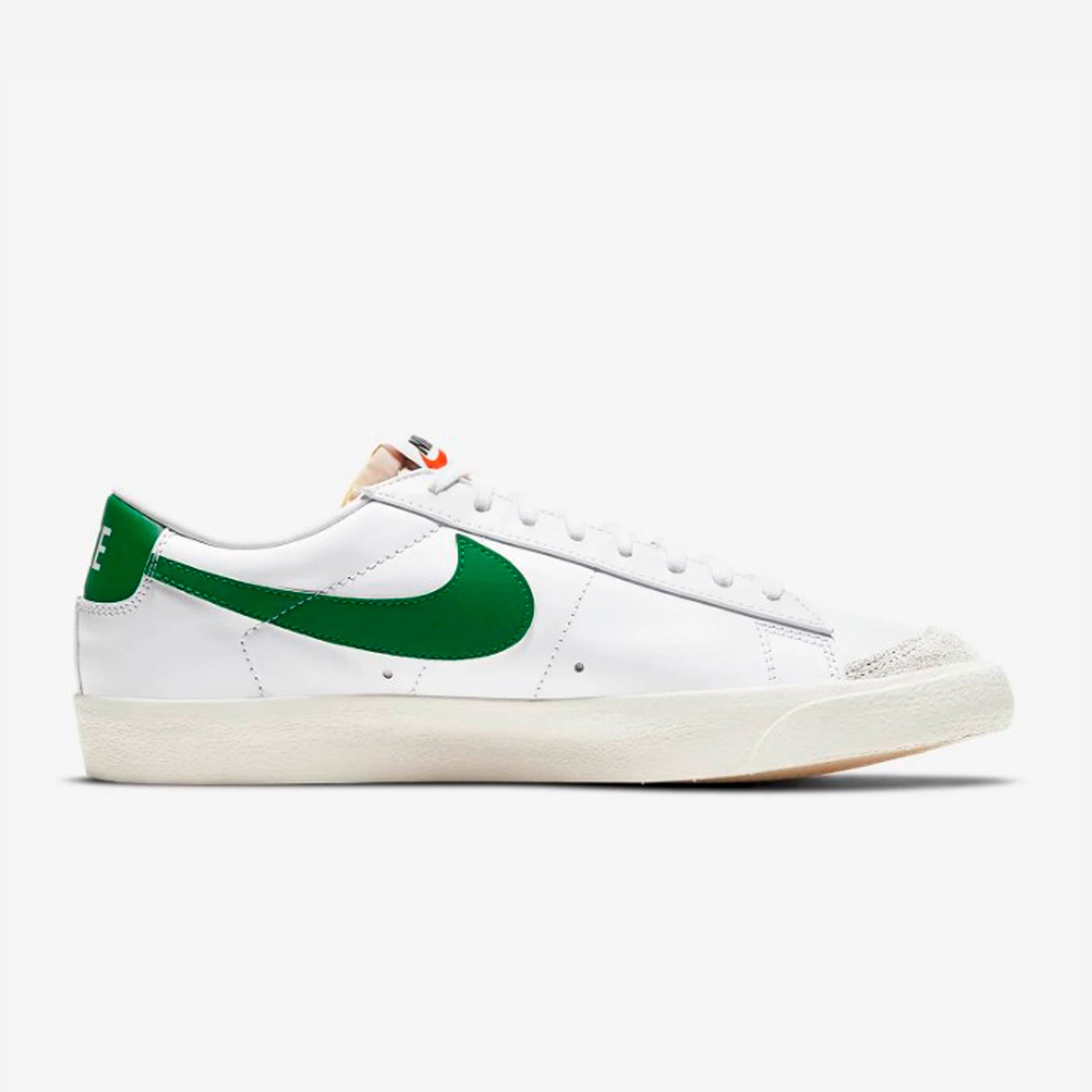 Кеды Nike Blazer Low '77 Vintage 'Pine Green' имеют заниженный профиль, верх выполнен из кожи и украшен яркими вставками из замши.