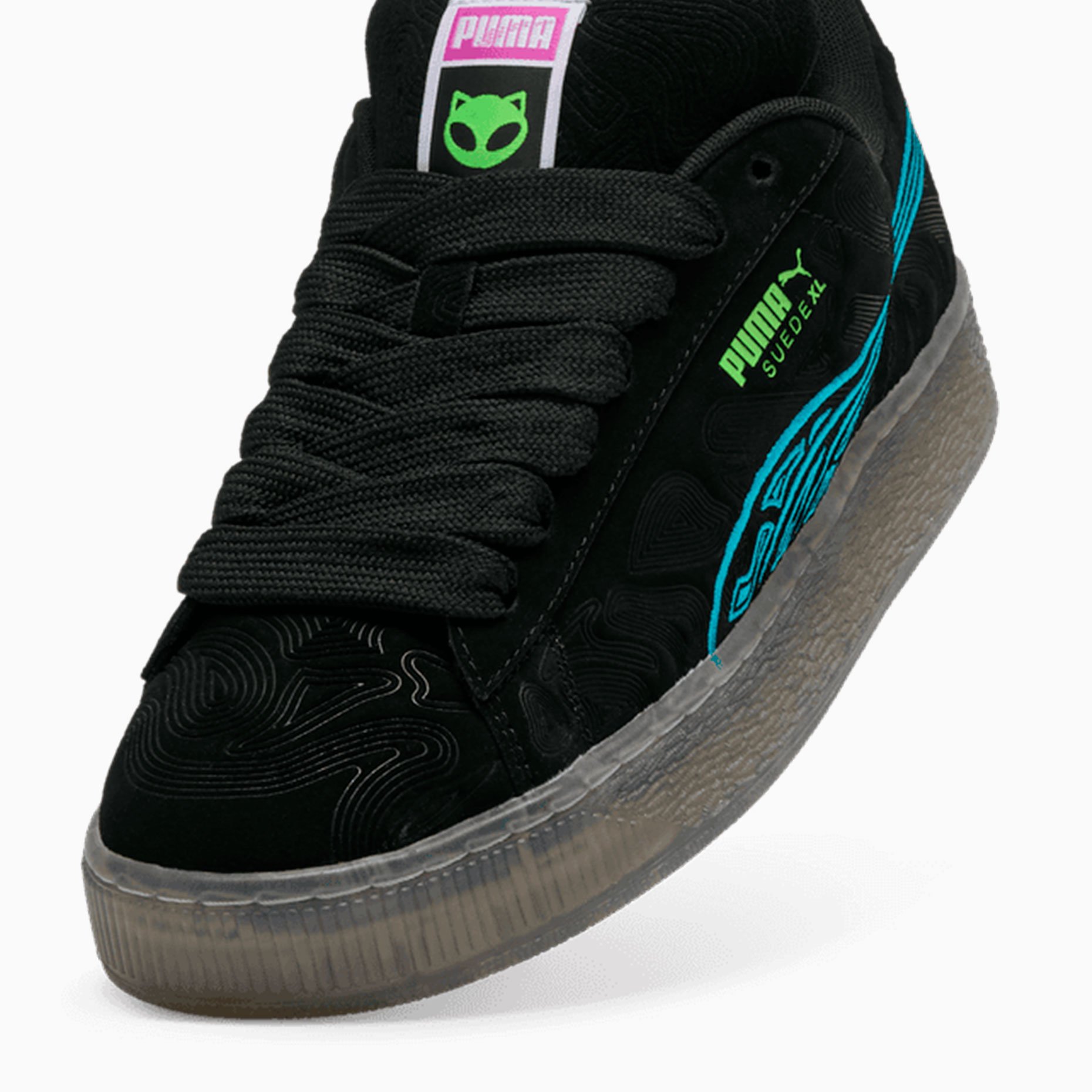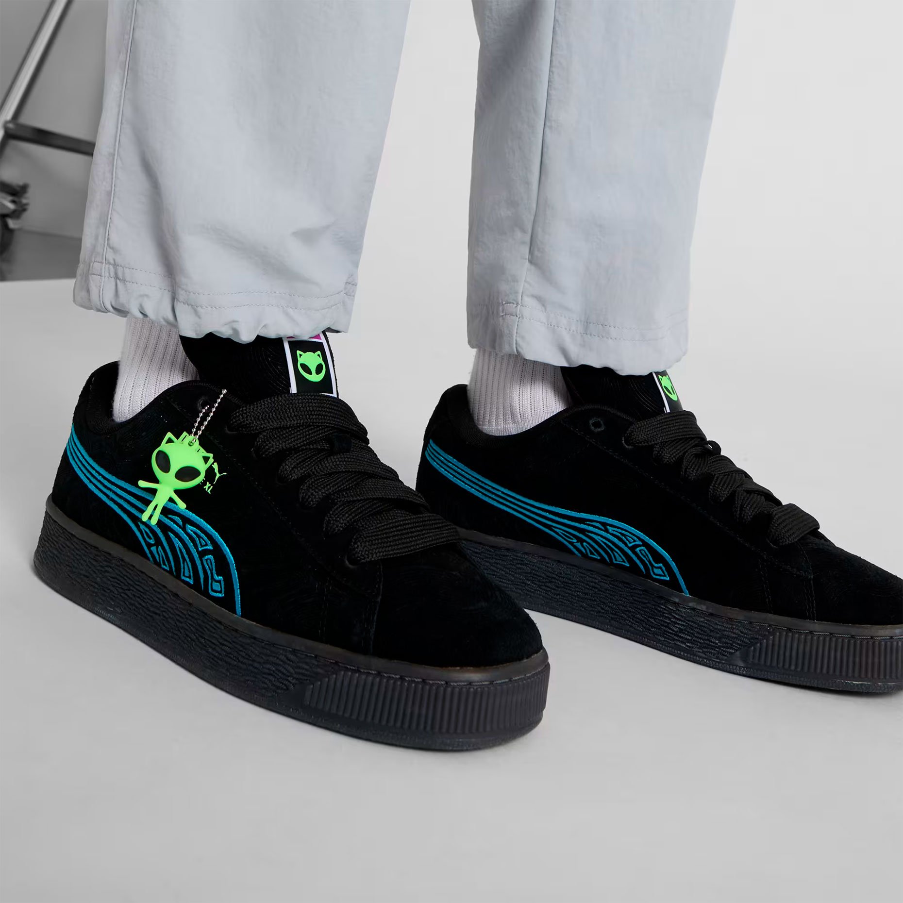 Кеды Puma Suede XL ‘Alien’ — это креативная интерпретация культовой модели Suede XL, которая сочетает в себе классический дизайн и современные уличные тренды. Модель выделяется уникальными деталями: замшевая основа с тисненым рисунком, вышитые Formstrip в ярком синем цвете и декоративный брелок в виде инопланетянина, который придает кроссовкам особый характер и индивидуальность.