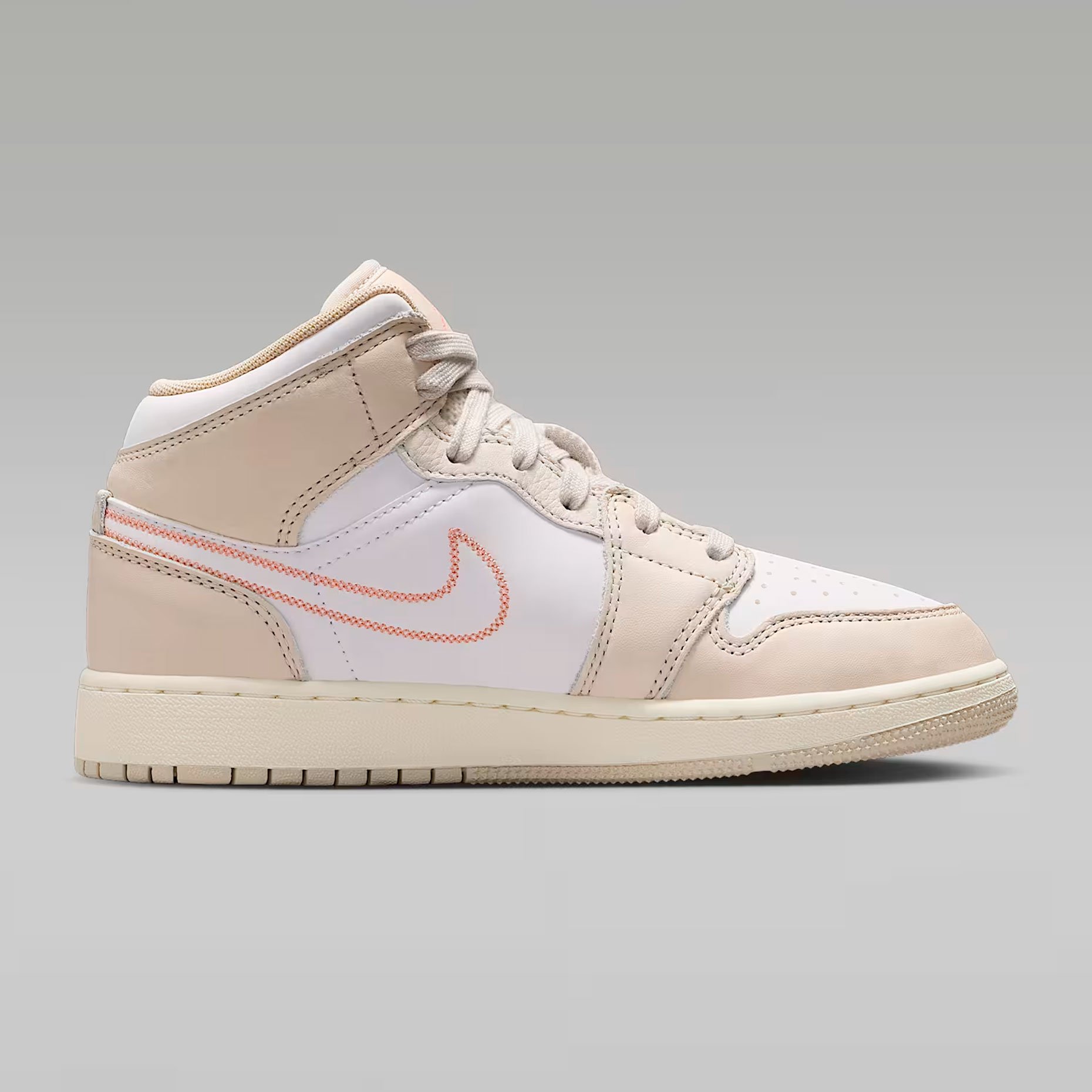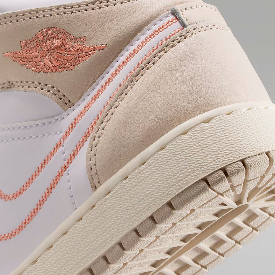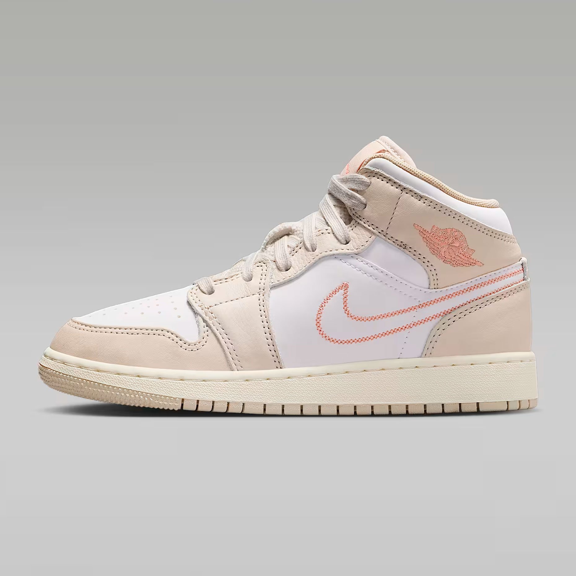 Детские кроссовки Nike Air Jordan 1 Mid SE 'Light Orewood Brown' — стильная модель из ограниченной серии, которая сочетает классику и современные детали. Верх выполнен из гладкой белой кожи с накладками светло‑бежевого оттенка, что придаёт обуви выразительную текстуру. Вышитый логотип Swoosh и этикетка с Jumpman на язычке подчёркивают принадлежность к культовой линейке, а логотип Wings на воротнике добавляет узнаваемости образу. Дизайн балансирует между нейтральностью и яркой индивидуальностью, доказывая: классика не бывает скучной.