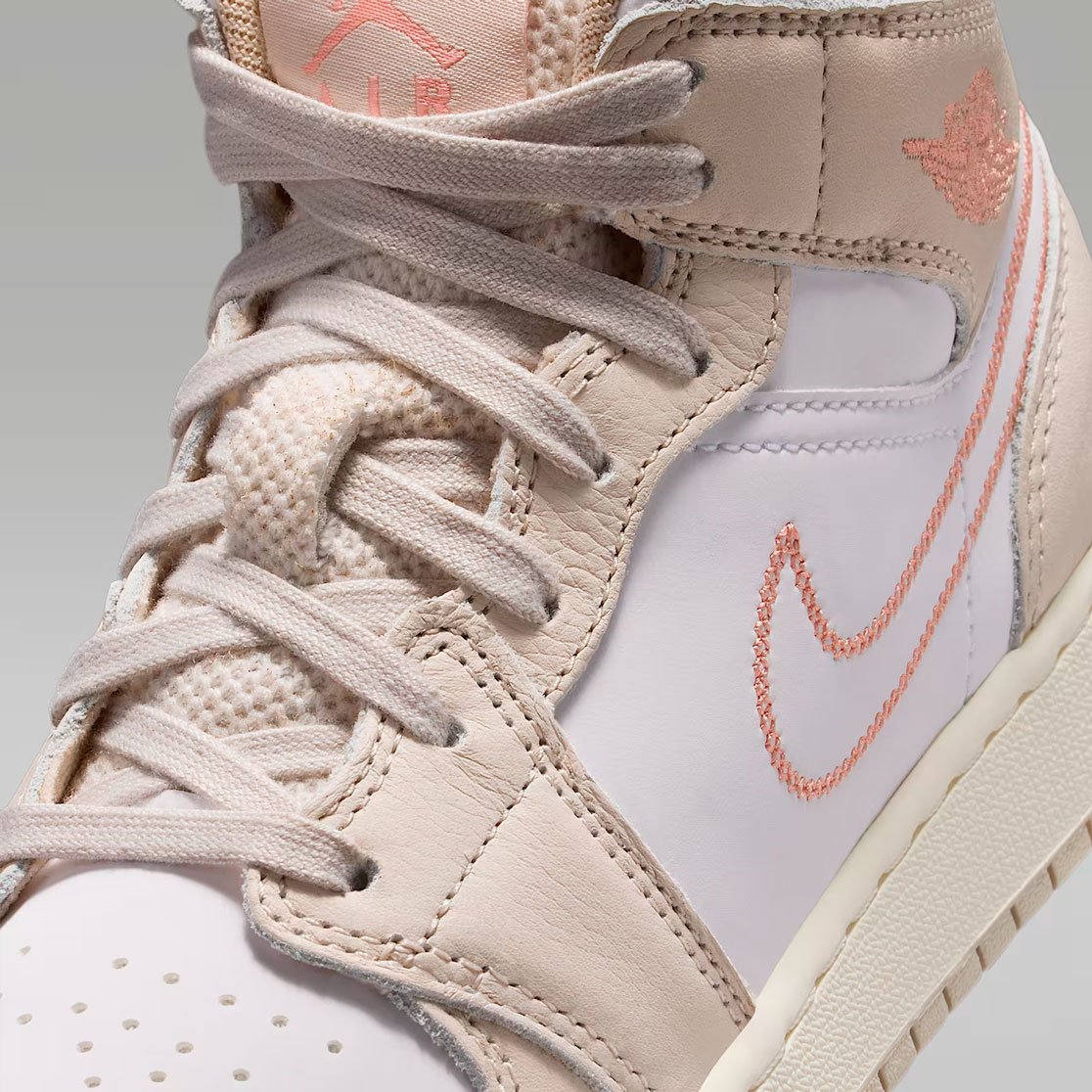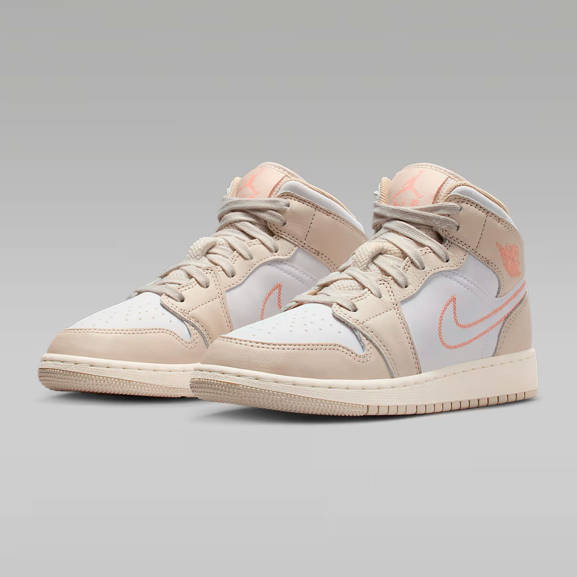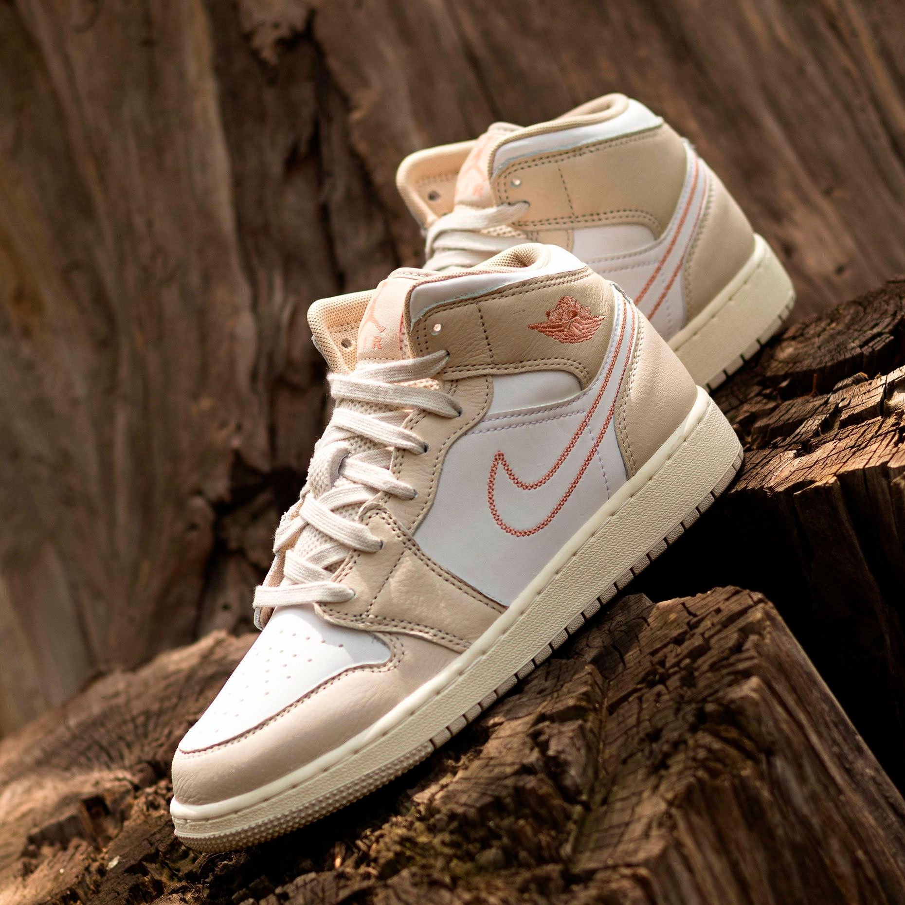 Детские кроссовки Nike Air Jordan 1 Mid SE 'Light Orewood Brown' — стильная модель из ограниченной серии, которая сочетает классику и современные детали. Верх выполнен из гладкой белой кожи с накладками светло‑бежевого оттенка, что придаёт обуви выразительную текстуру. Вышитый логотип Swoosh и этикетка с Jumpman на язычке подчёркивают принадлежность к культовой линейке, а логотип Wings на воротнике добавляет узнаваемости образу. Дизайн балансирует между нейтральностью и яркой индивидуальностью, доказывая: классика не бывает скучной.