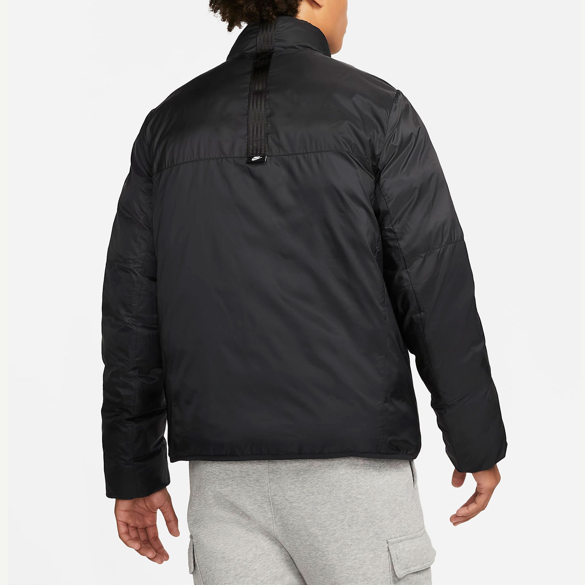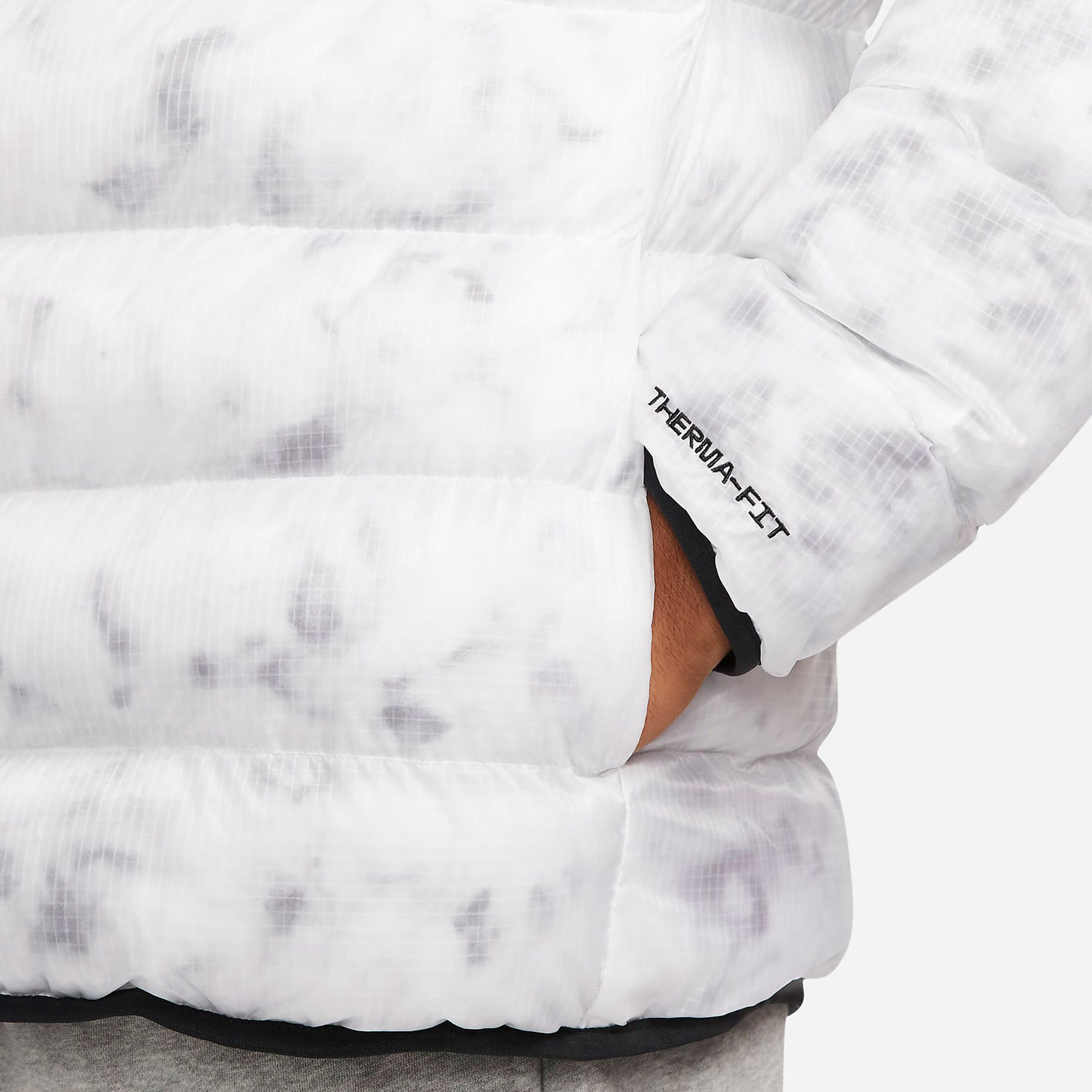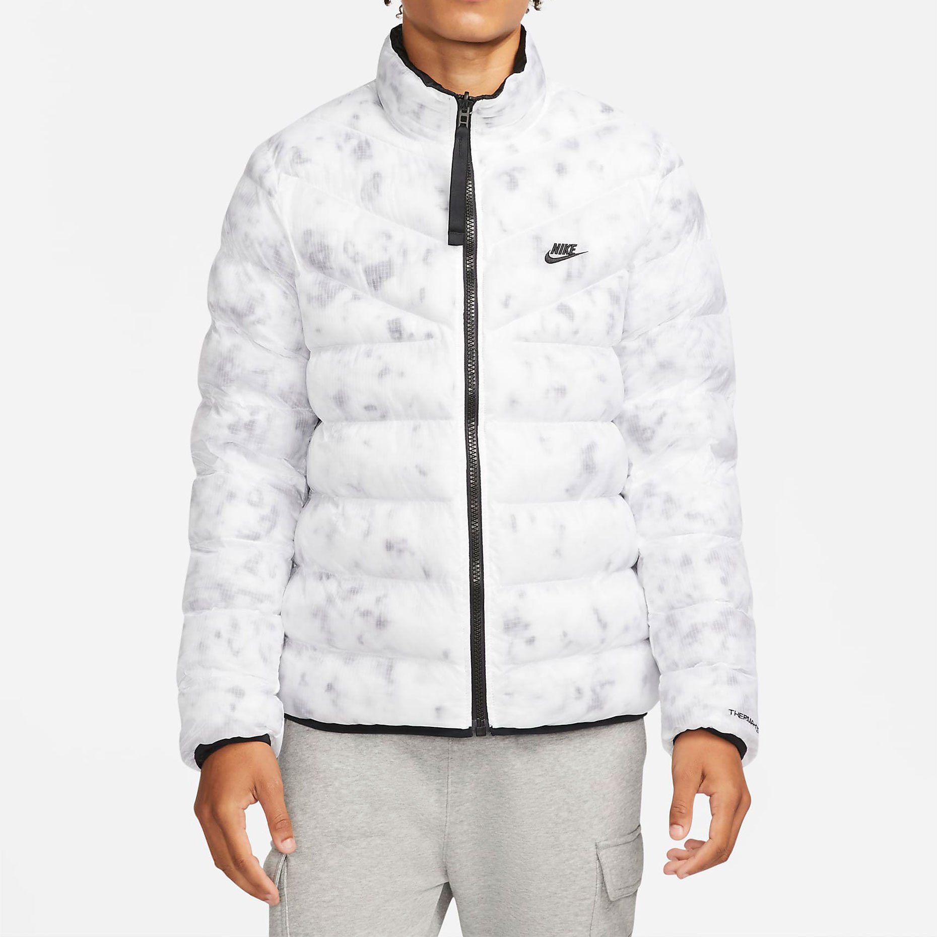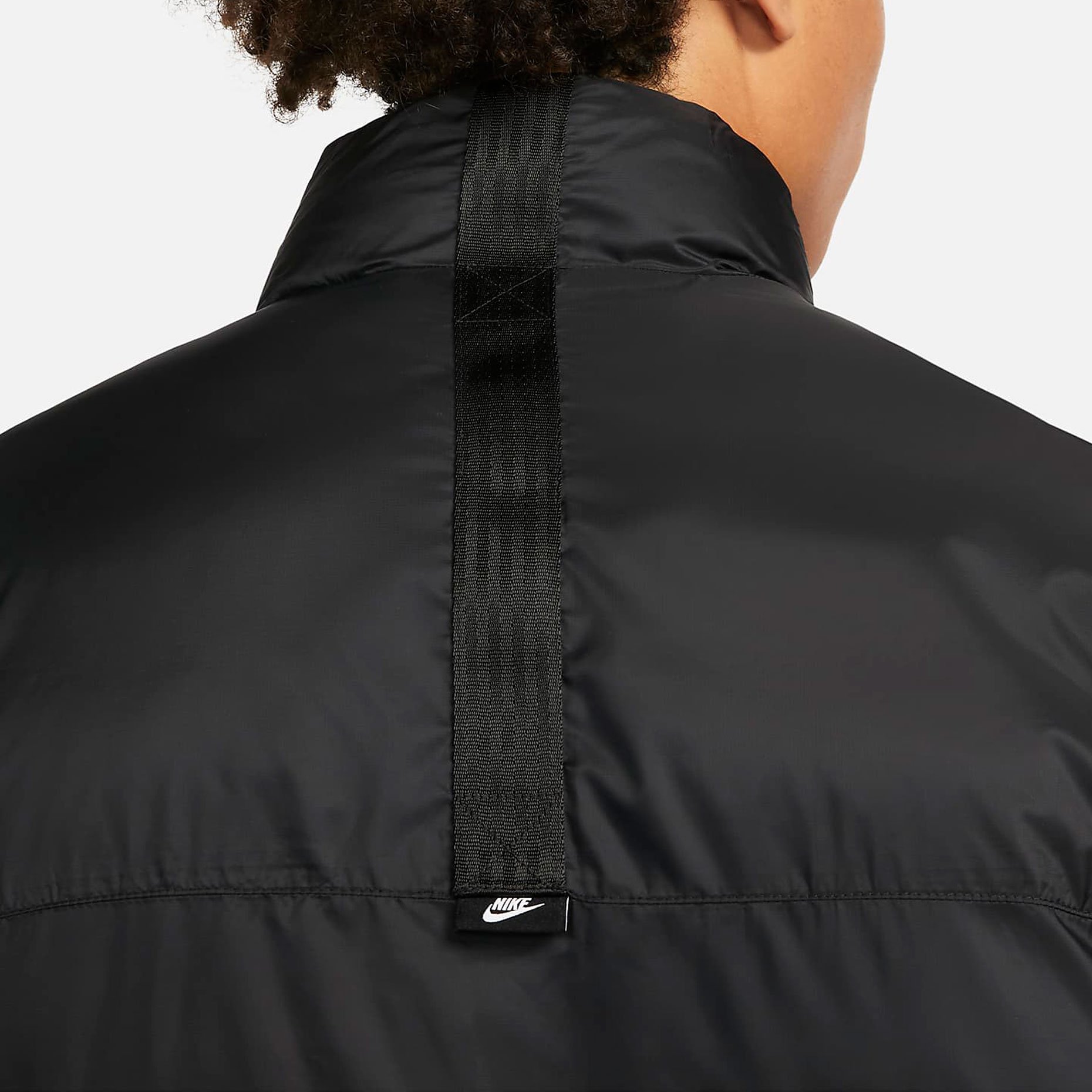 Сторона 1 выполнена из гладкой ткани на основе переработанных материалов и дополнена большими карманами на молнии для важных мелочей. Сторона 2 состоит из горизонтальных перегородок с прозрачным внешним слоем из ткани, через который виден мраморный утеплитель EcoDown. Обе стороны не пропускают влагу и украшены тканым кантом, графикой Futura и тканой этикеткой с флагом на задней вставке для создания классического образа Nike.