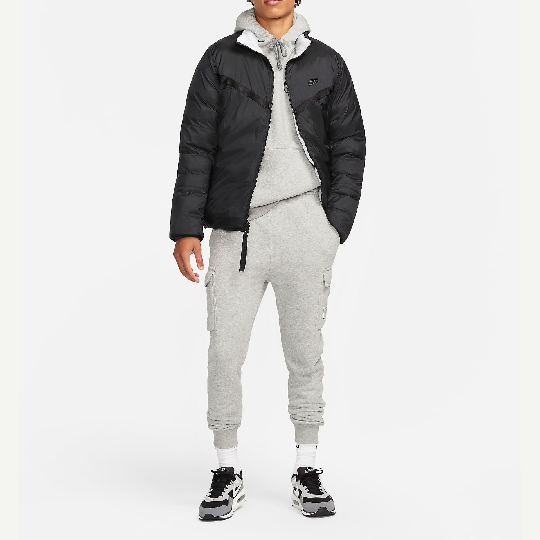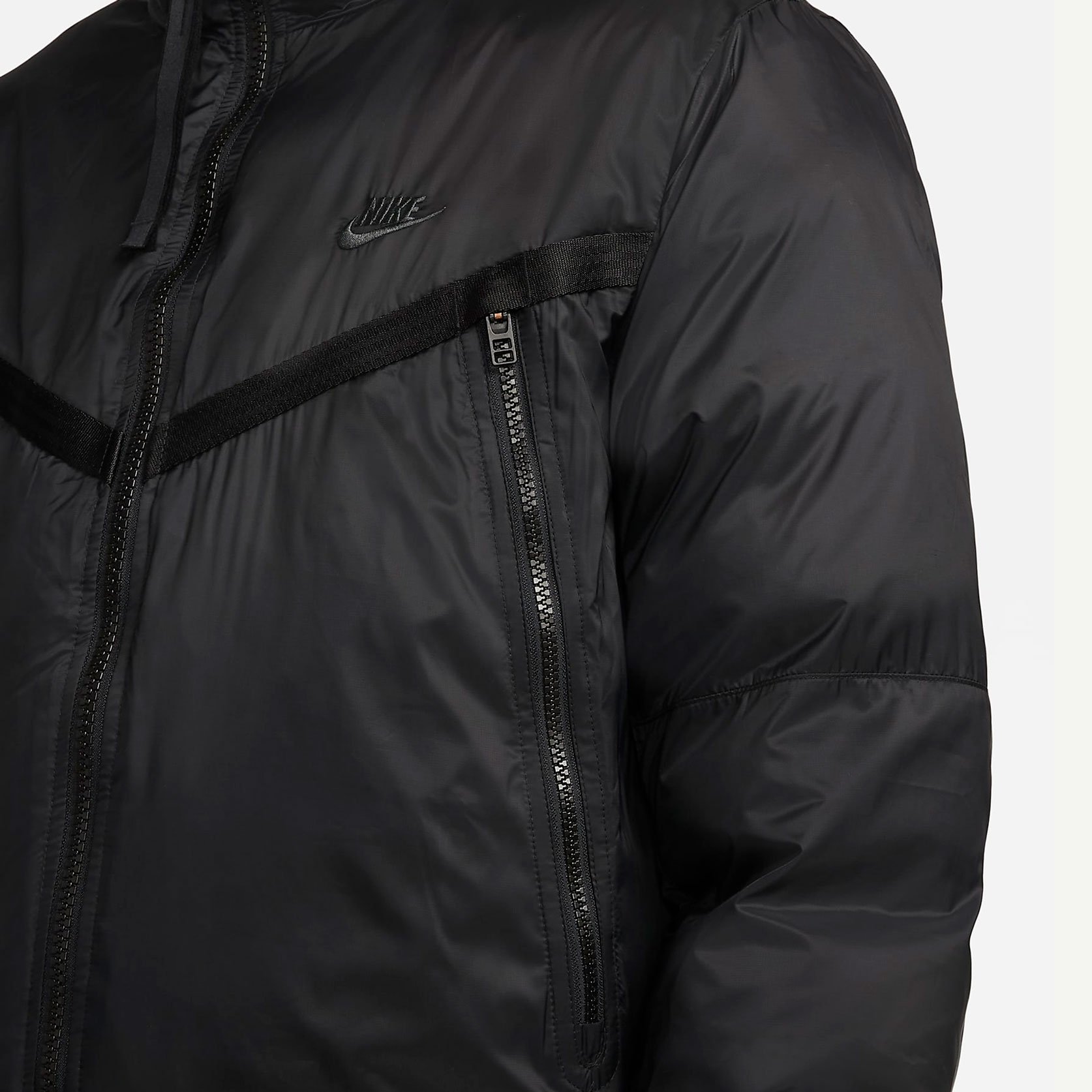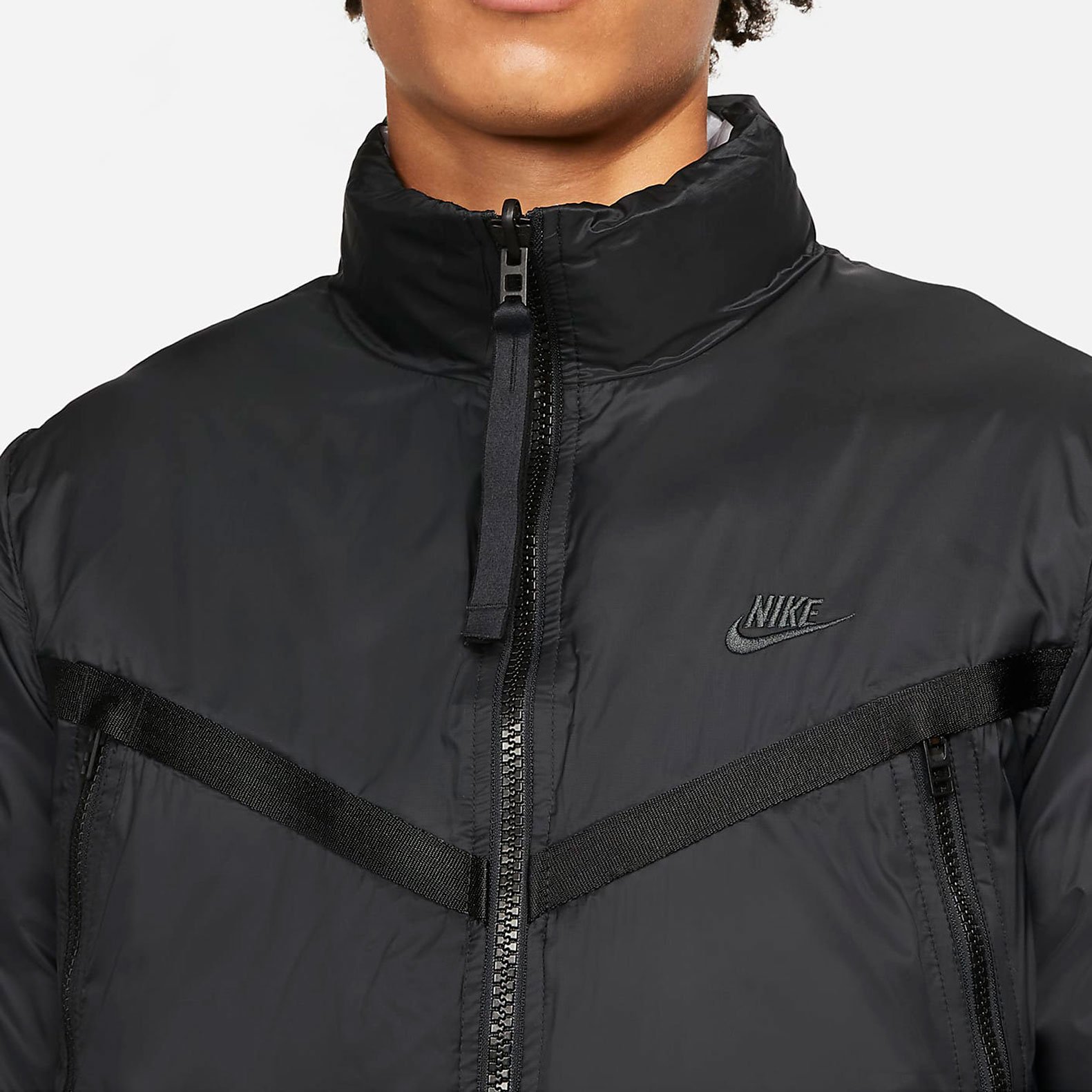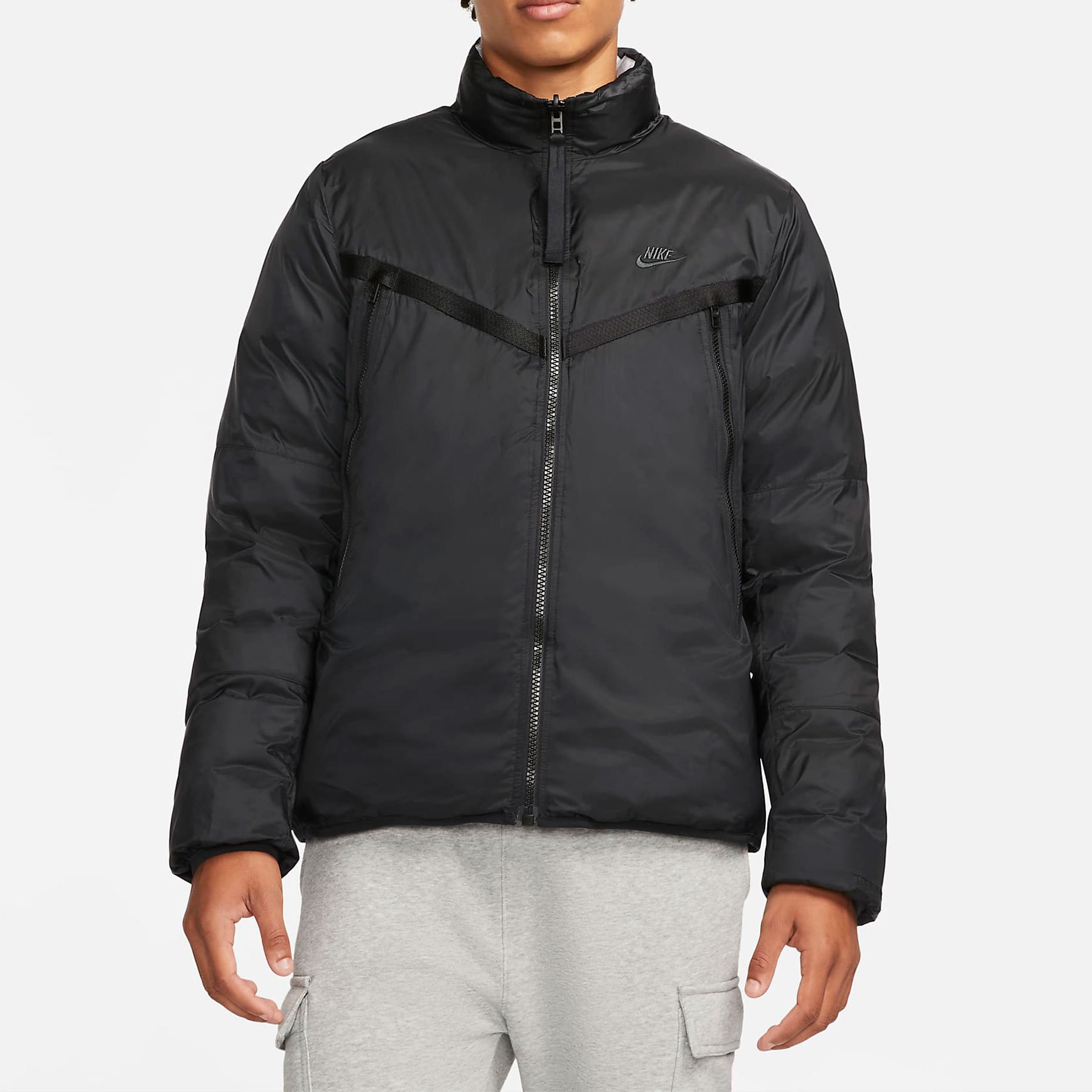 Сторона 1 выполнена из гладкой ткани на основе переработанных материалов и дополнена большими карманами на молнии для важных мелочей. Сторона 2 состоит из горизонтальных перегородок с прозрачным внешним слоем из ткани, через который виден мраморный утеплитель EcoDown. Обе стороны не пропускают влагу и украшены тканым кантом, графикой Futura и тканой этикеткой с флагом на задней вставке для создания классического образа Nike.