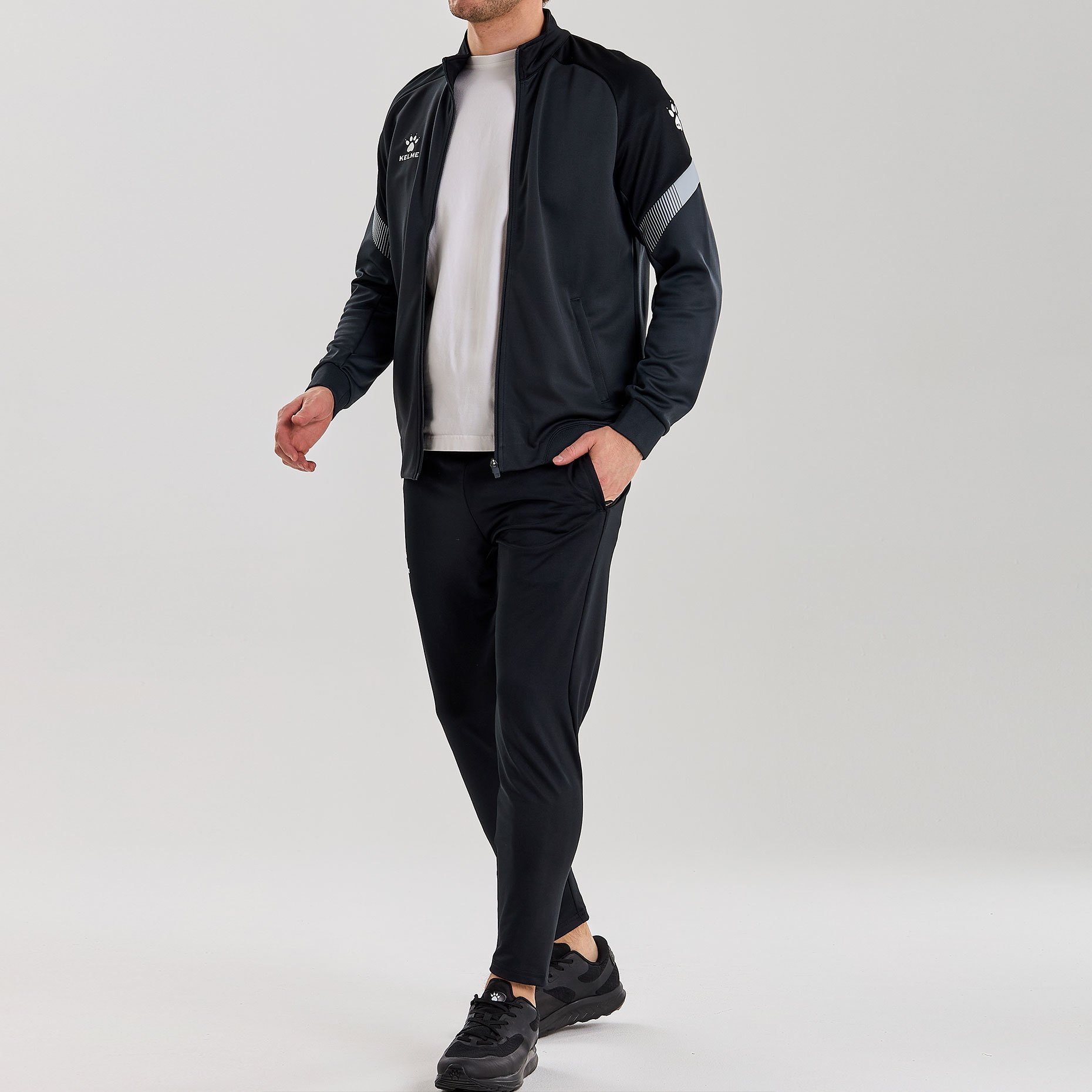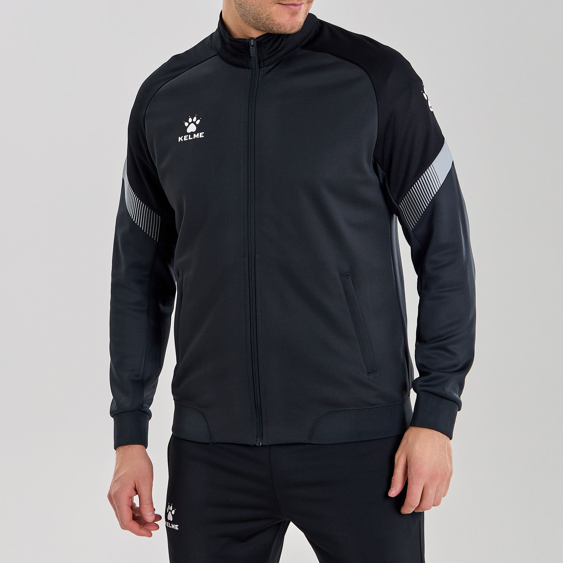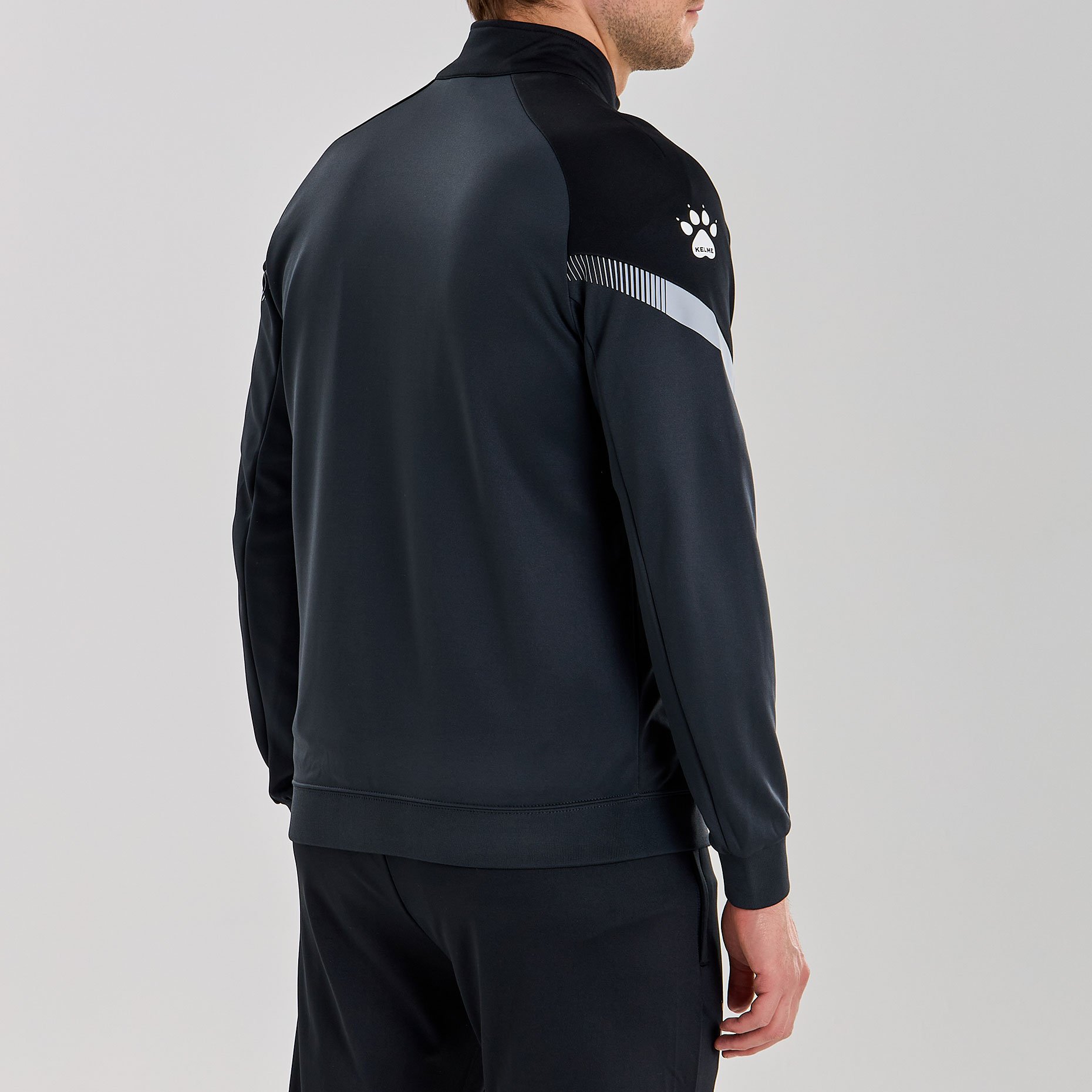 Куртка выполнена из мягкой синтетической ткани, которая обеспечивает комфорт и тепло в прохладную погоду. Ее современный дизайн включает в себя контрастные вставки на рукавах и логотип бренда Kelme на груди, что добавляет куртке дополнительную привлекательность.