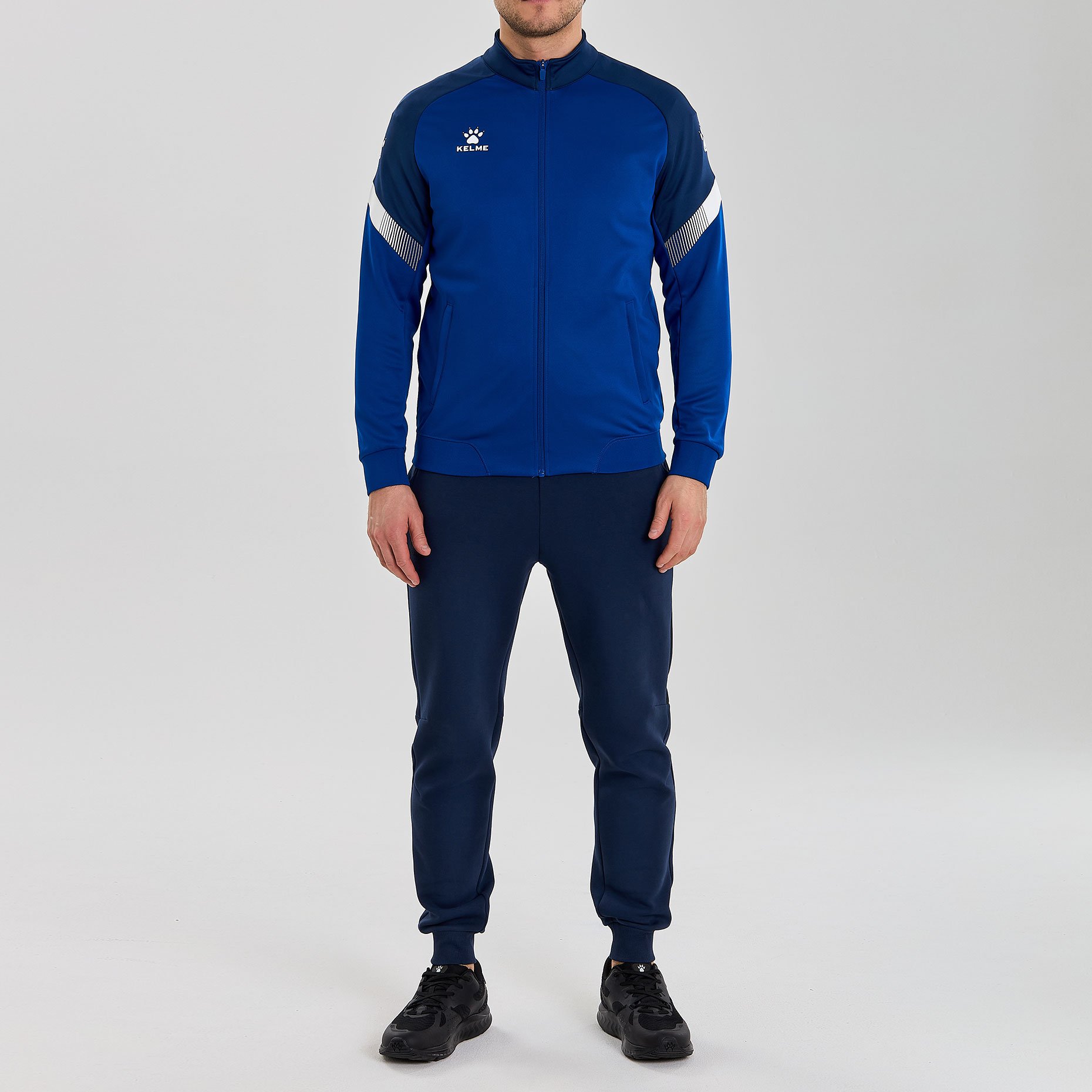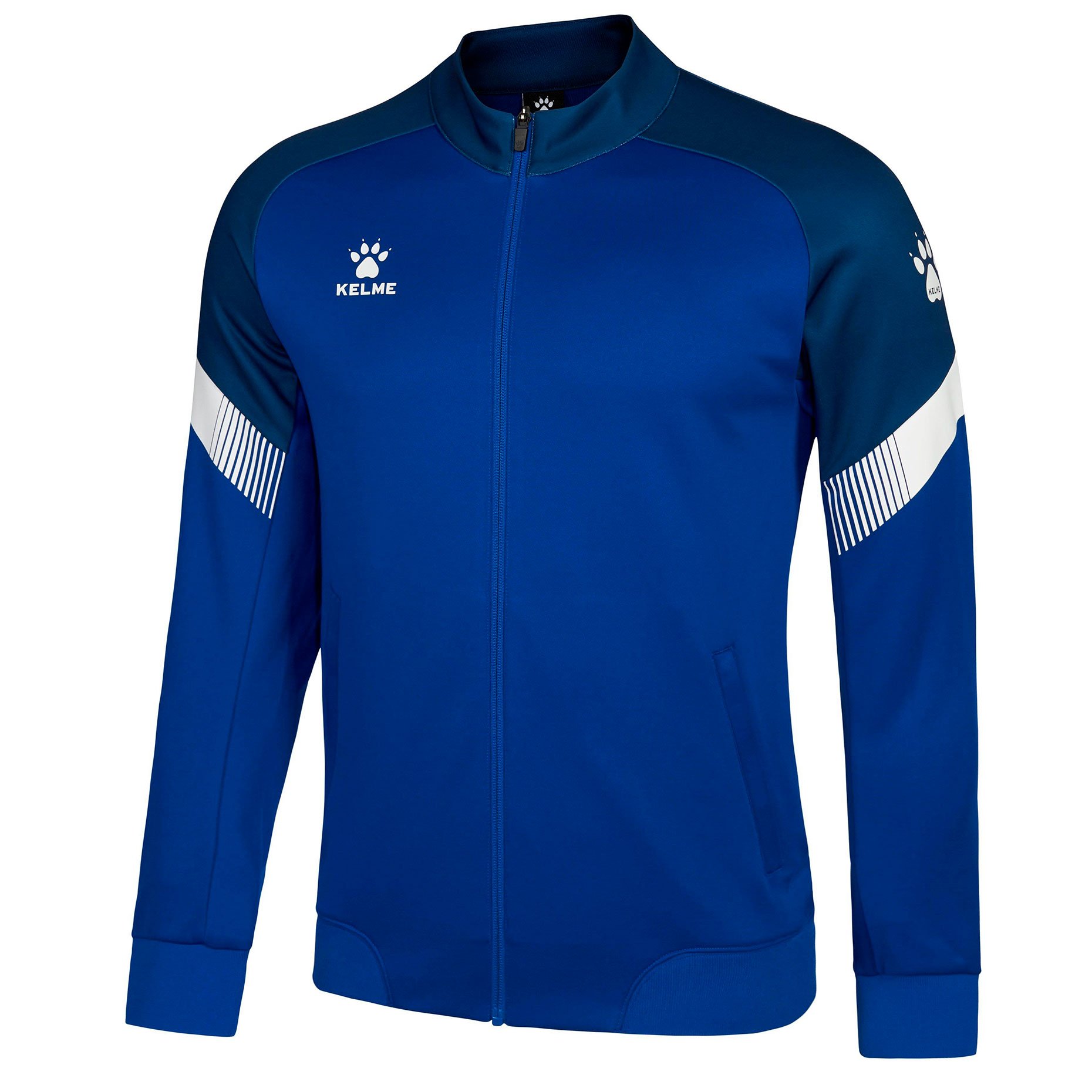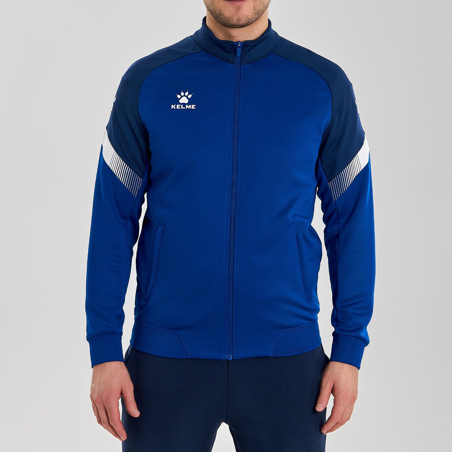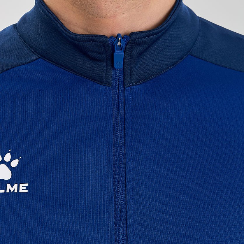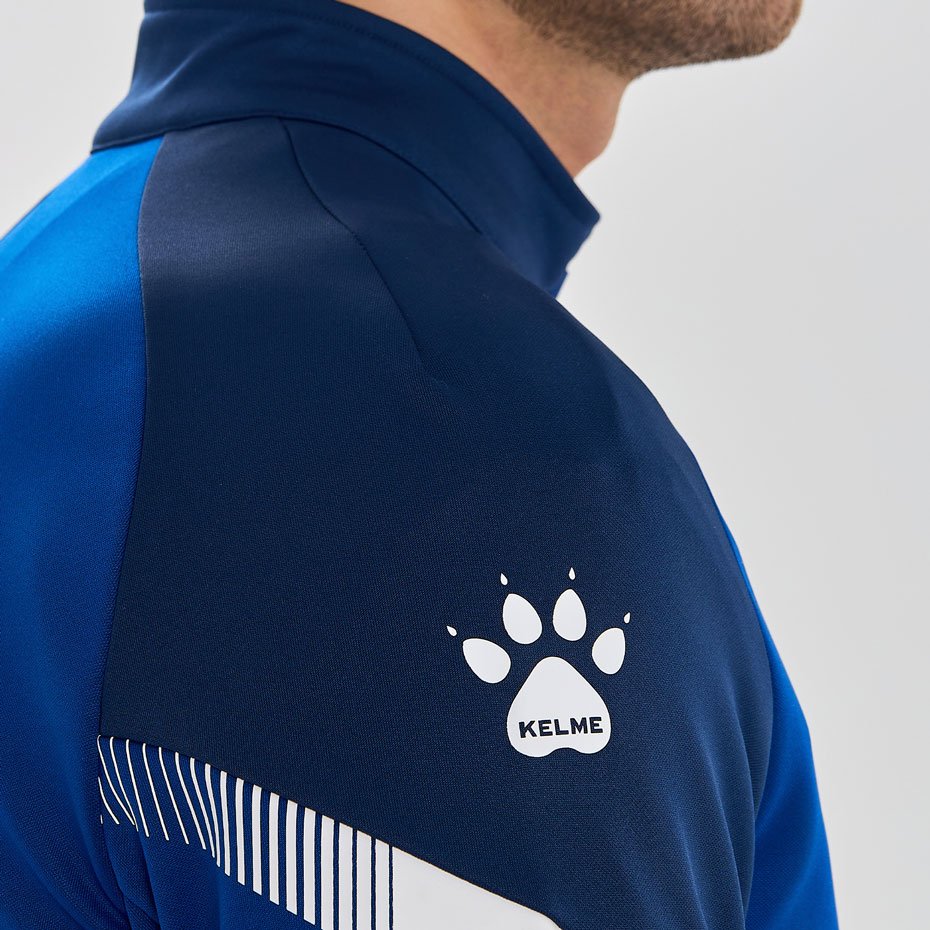 Куртка выполнена из мягкой синтетической ткани, которая обеспечивает комфорт и тепло в прохладную погоду. Ее современный дизайн включает в себя контрастные вставки на рукавах и логотип бренда Kelme на груди, что добавляет куртке дополнительную стильность.