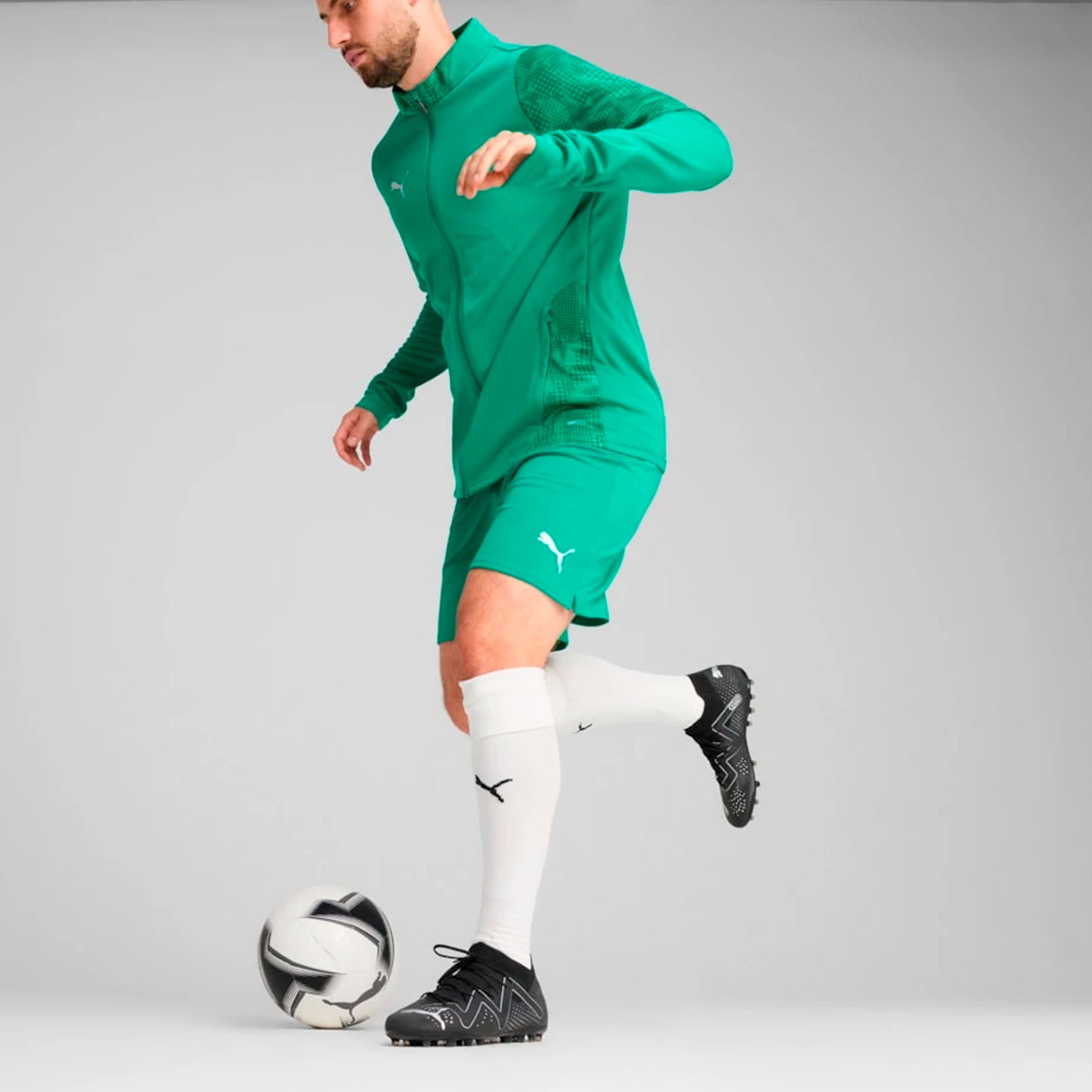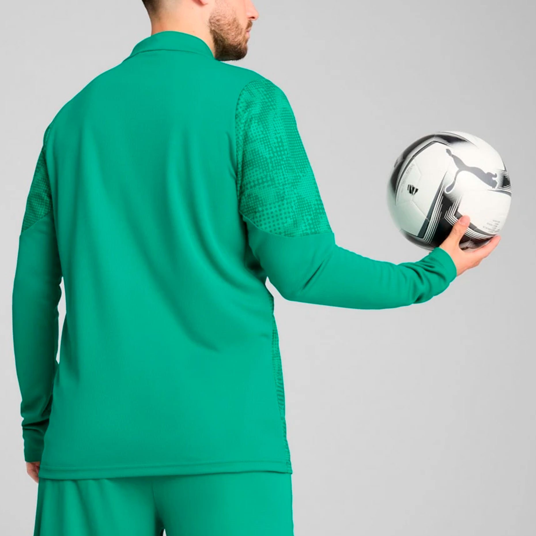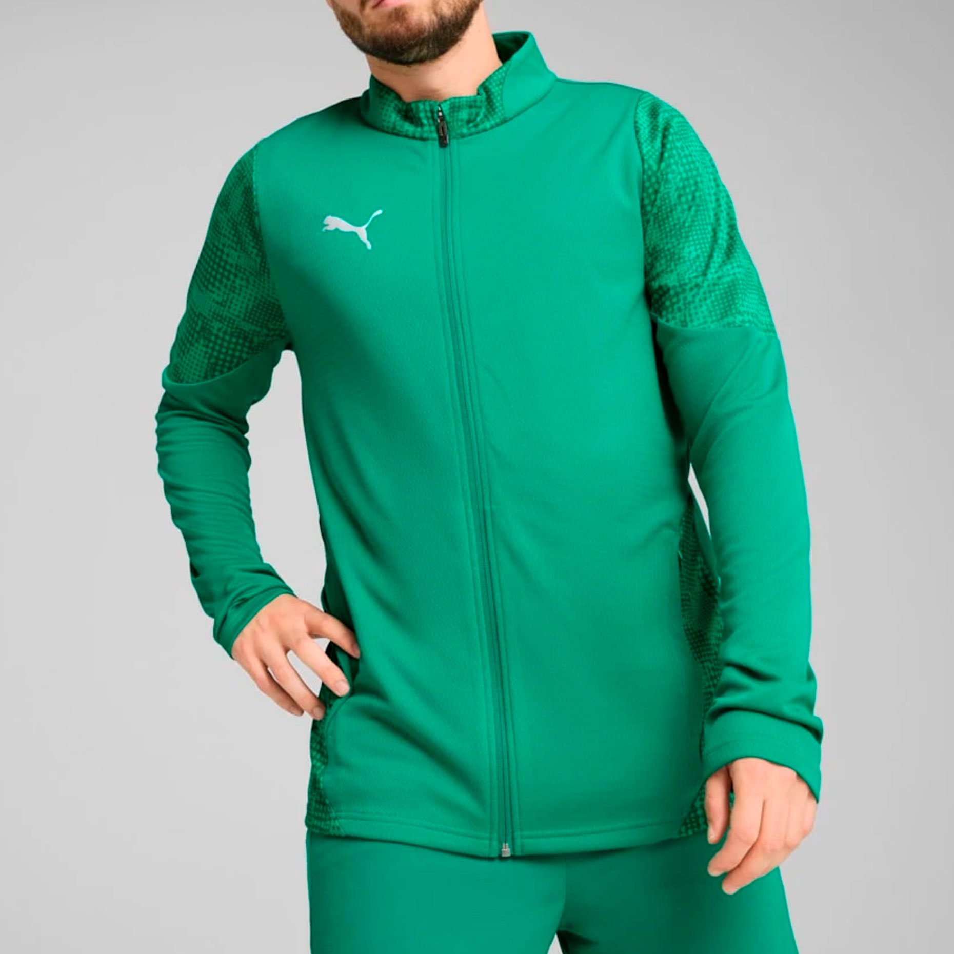 Серебряный логотип PUMA на правой стороне груди подчеркивает стиль бренда, а боковые карманы на молниях обеспечивают практичность. Полная молния позволяет регулировать теплообмен, а невысокий воротник не отвлекает во время тренировок. Уникальный рисунок на рукавах и по бокам является отличительной чертой коллекции, позволяя создать оригинальный тренировочный образ в сочетании с другими предметами из этой же коллекции. Приталенный крой предотвращает излишки ткани, обеспечивая удобство и свободу движений.