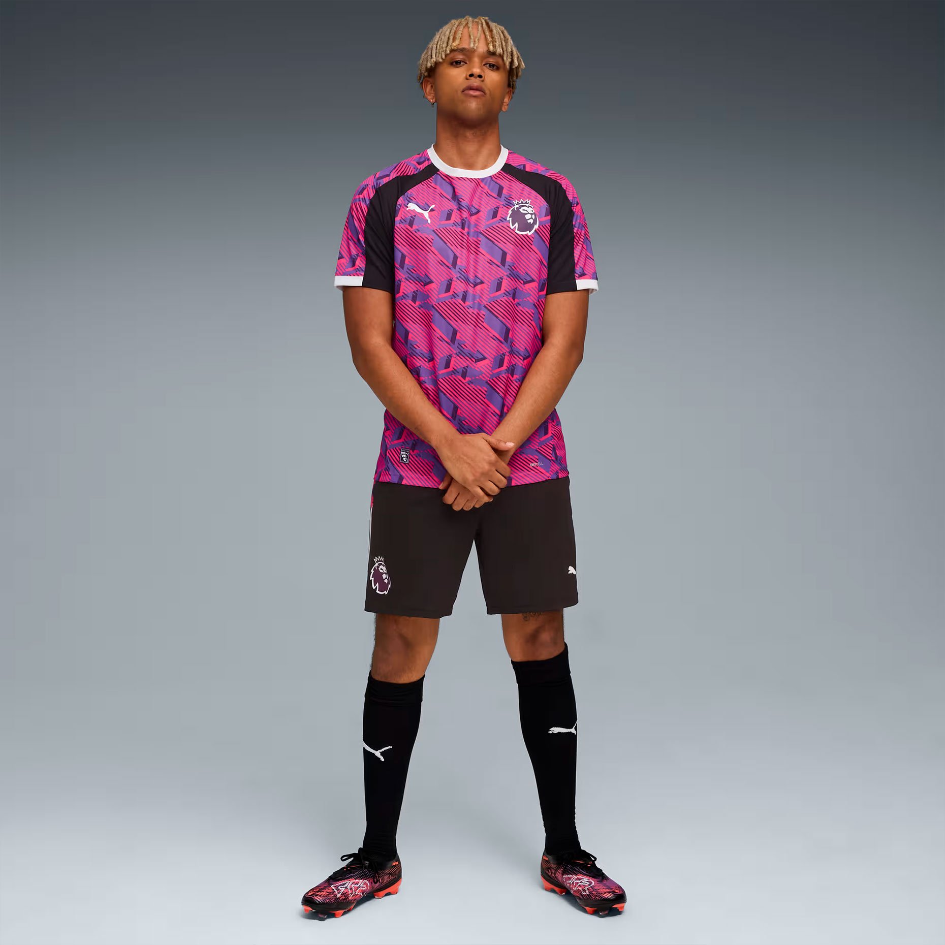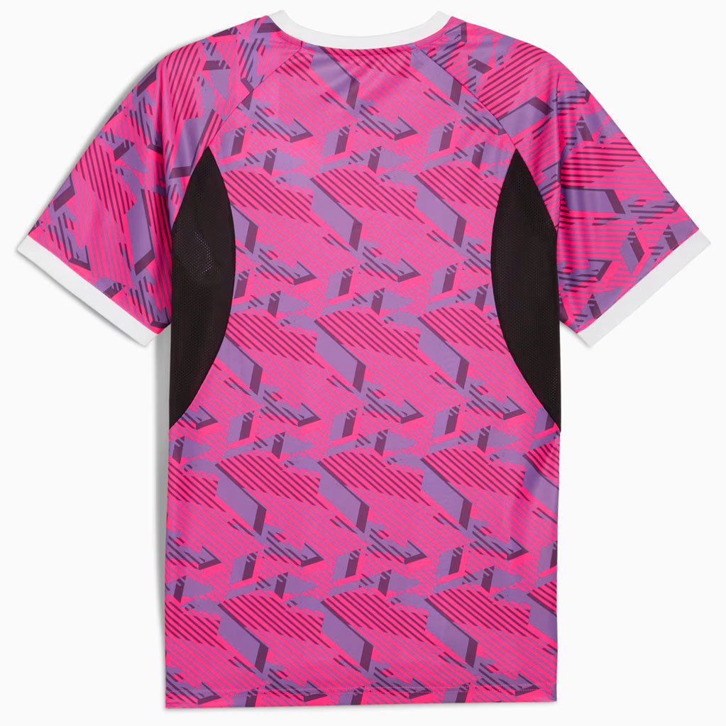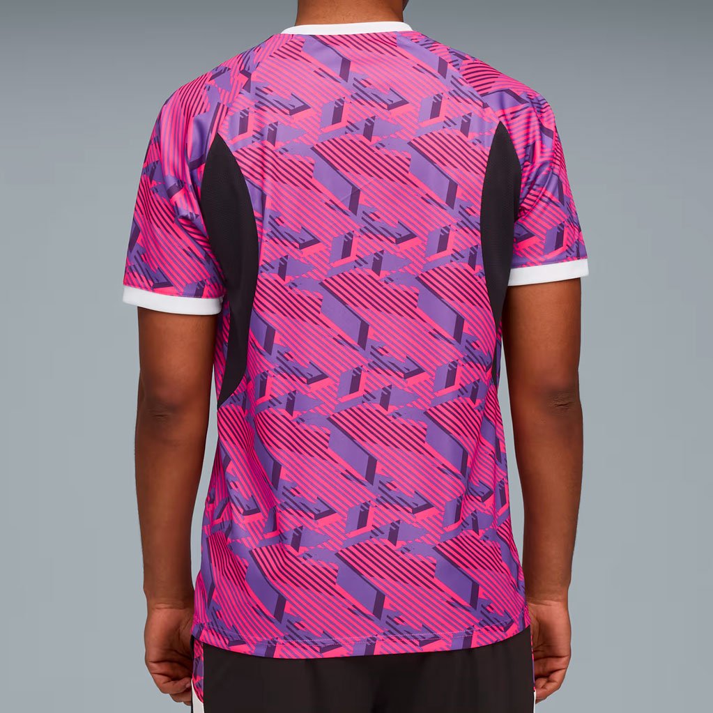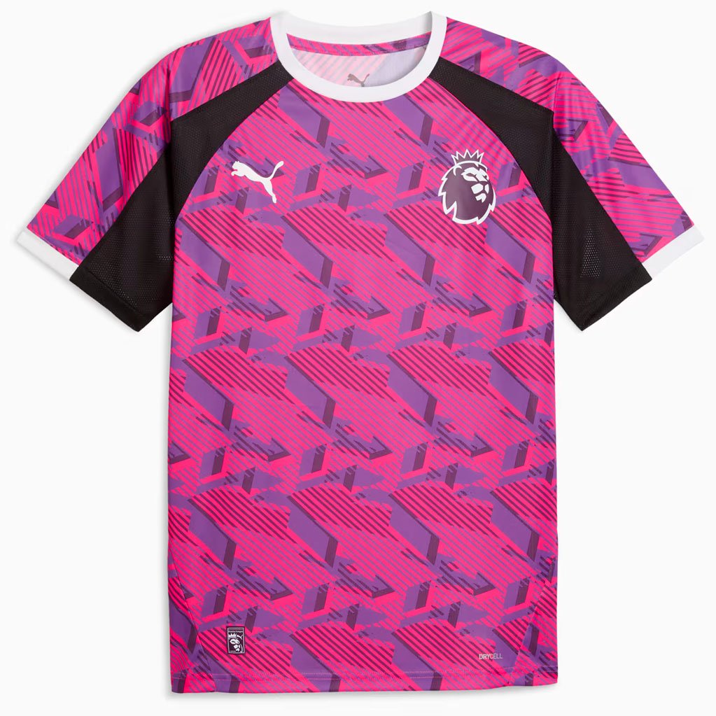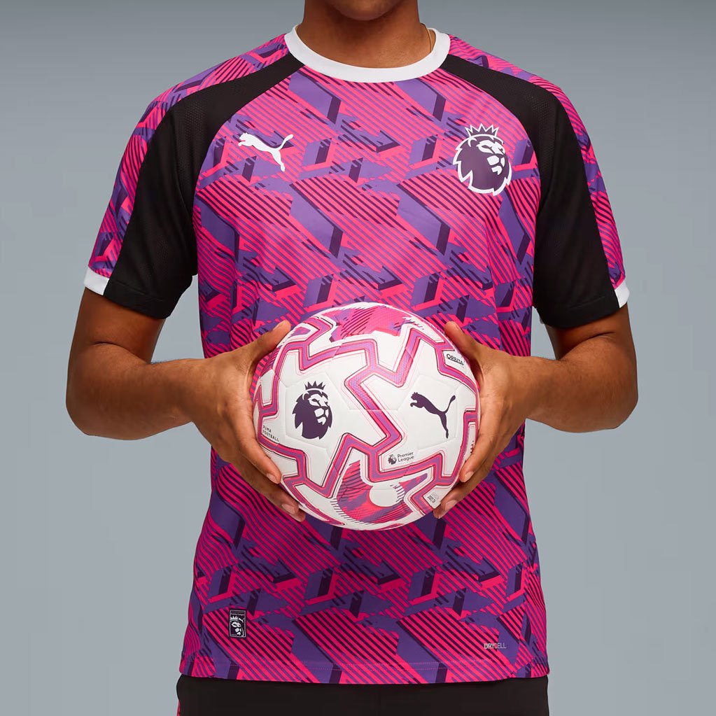 Майка тренировочная Puma Premier League Brilliance Training Jersey — часть совместной коллекции PUMA и Премьер-лиги, посвящённой сезону 2025/26. Модель выделяется ярким дизайном с динамичной графикой «Vivid Brilliance» и стильными контрастными вставками на рукавах, которые гармонично сочетаются с сетчатыми элементами по бокам.