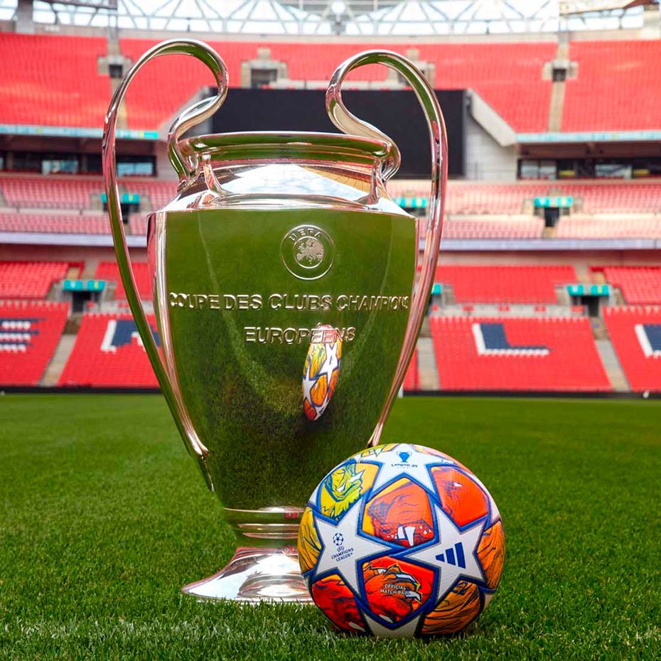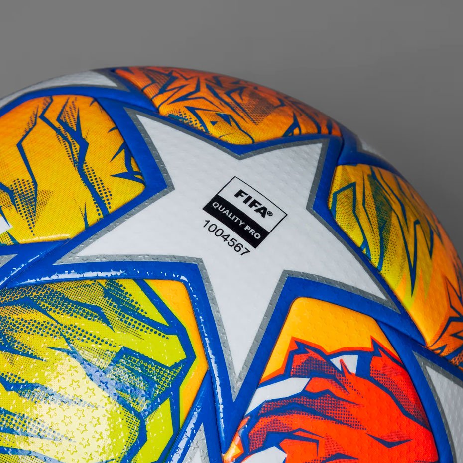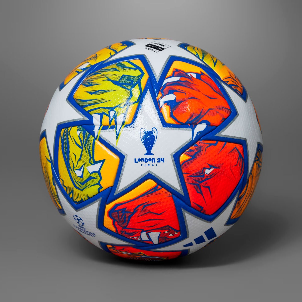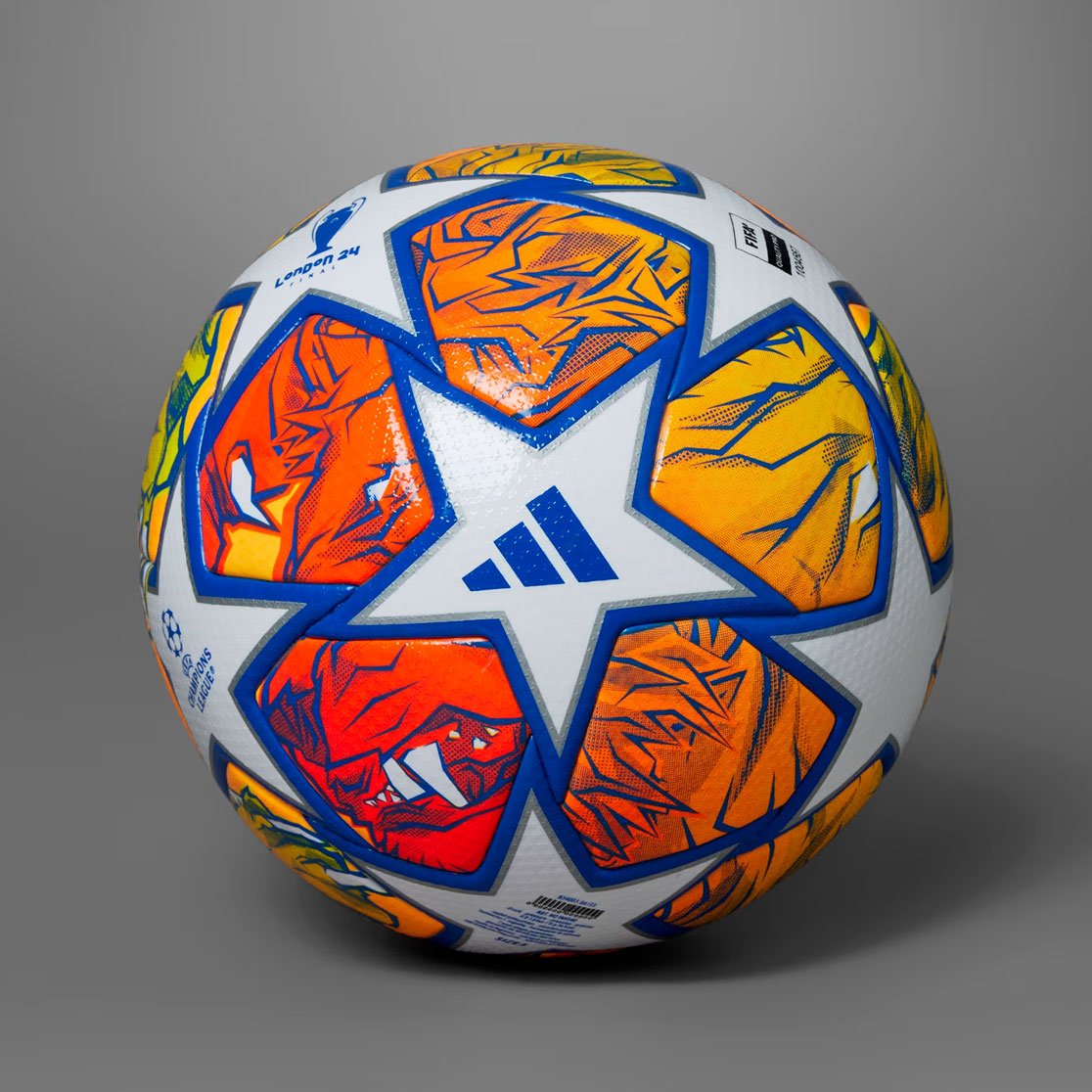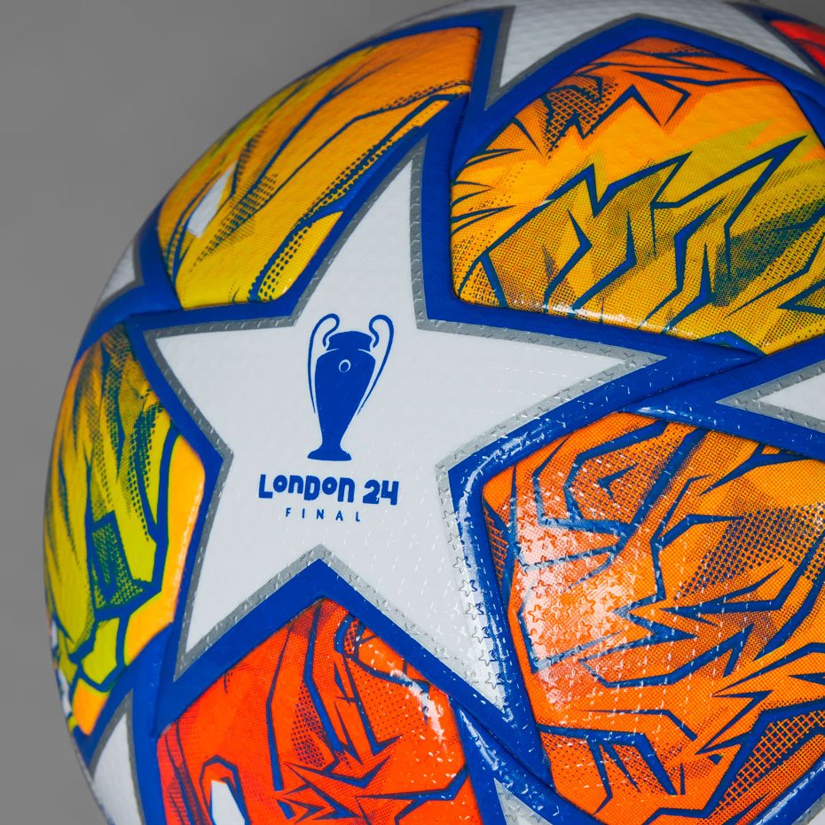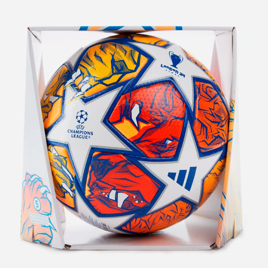 Мяч adidas UEFA Champions League Finale Pro использовался на поле в матчах 1/8 финала и во всех этапах плей-офф Лиги чемпионов УЕФА 2023/24, включая финал. Этот мяч прославляет Лондон, город-хозяин финала, с помощью яркой иллюстрации льва, олицетворяющего богатую историю и культуру Англии. Лев символизировал храбрость и силу, подчеркивая величие трофея Лиги чемпионов.
