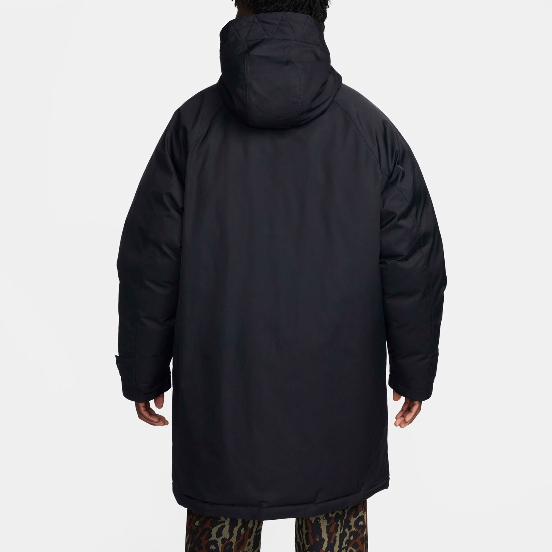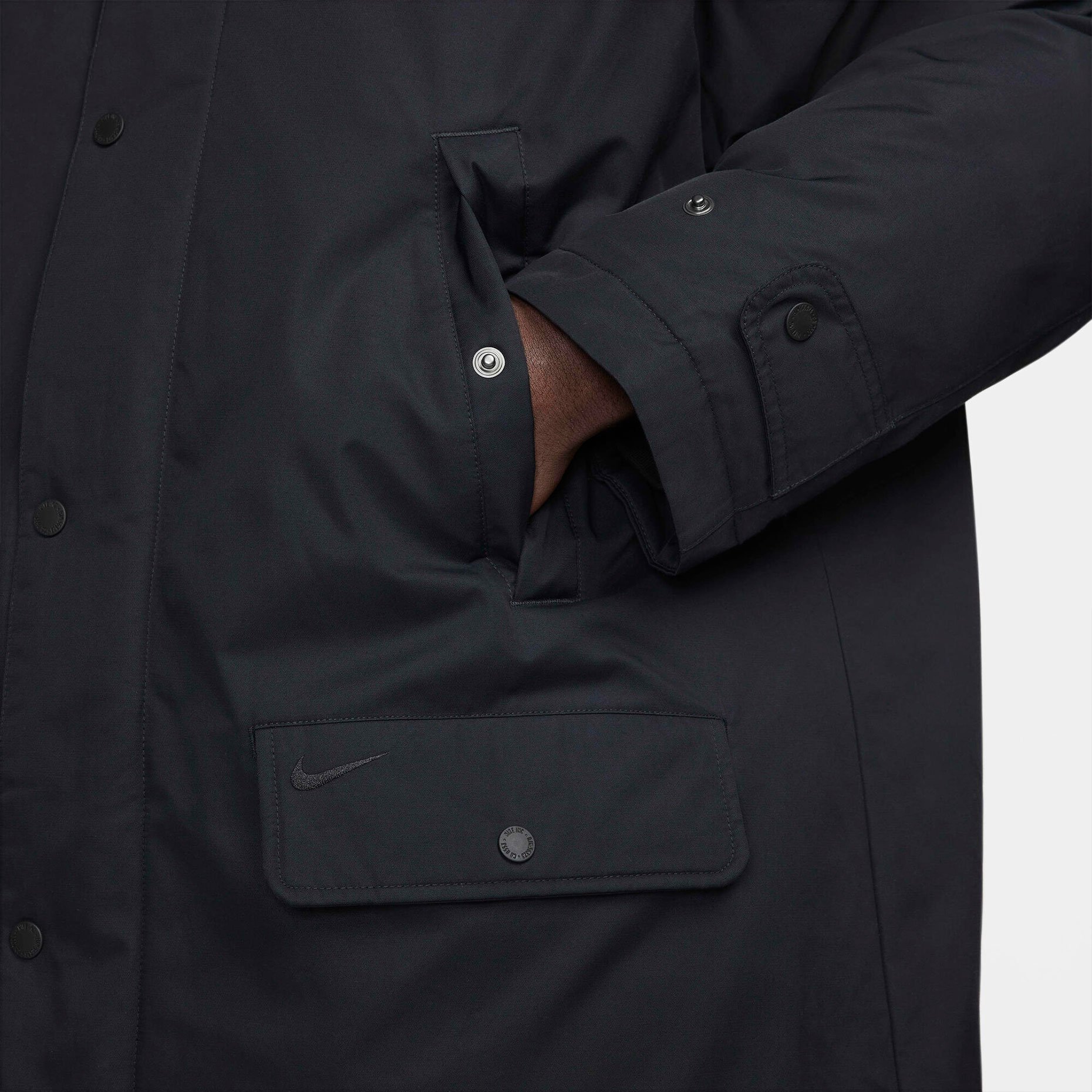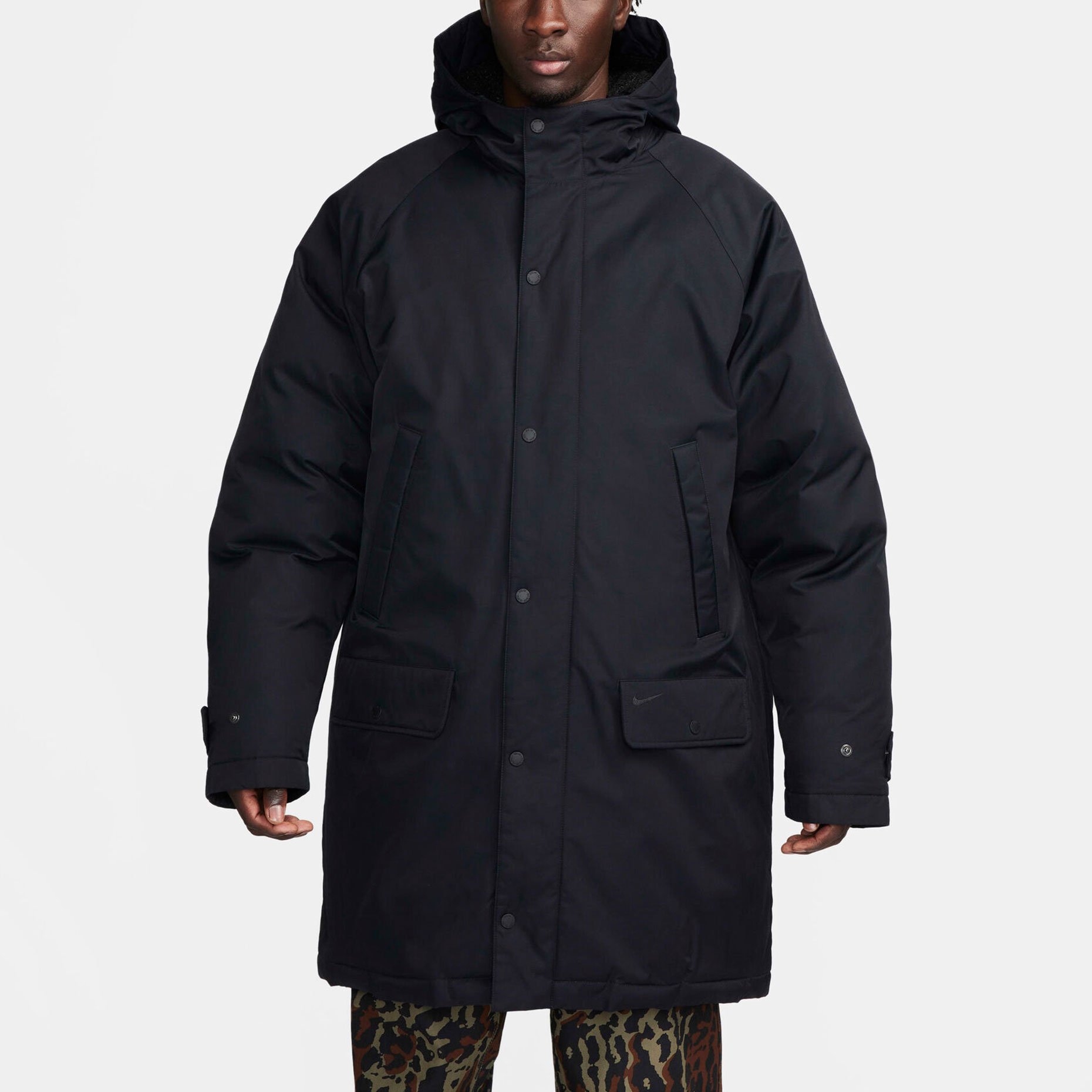 Свободный крой с расширенной посадкой в области плеч и груди позволяет легко надевать парку поверх объёмной одежды, а гладкая подкладка из тафты обеспечивает комфорт и лёгкость при движении. Капюшон отделан ворсистым флисом, который добавляет тепла и защищает голову от холода и ветра. Штормовой клапан по всей длине предотвращает проникновение холодного воздуха, а регулируемые манжеты с застёжками плотно фиксируются на запястьях, удерживая тепло. Для удобства предусмотрены боковые карманы с угловым расположением — их легко использовать даже при сжатых руках, а также два накладных кармана с клапанами для безопасного хранения телефона, ключей или перчаток. Логотип Swoosh на клапане левого кармана — сдержанная деталь, подчёркивающая принадлежность к бренду.