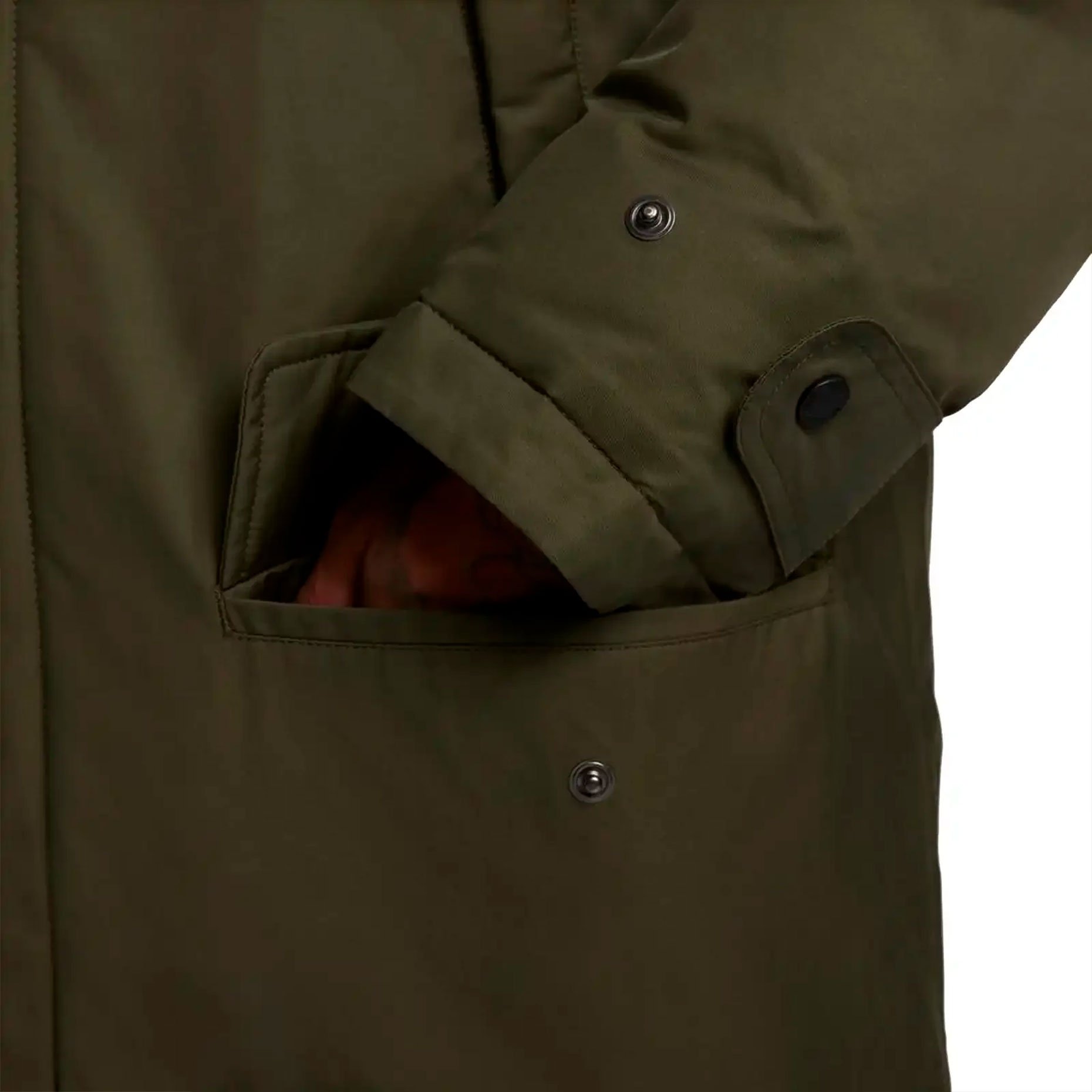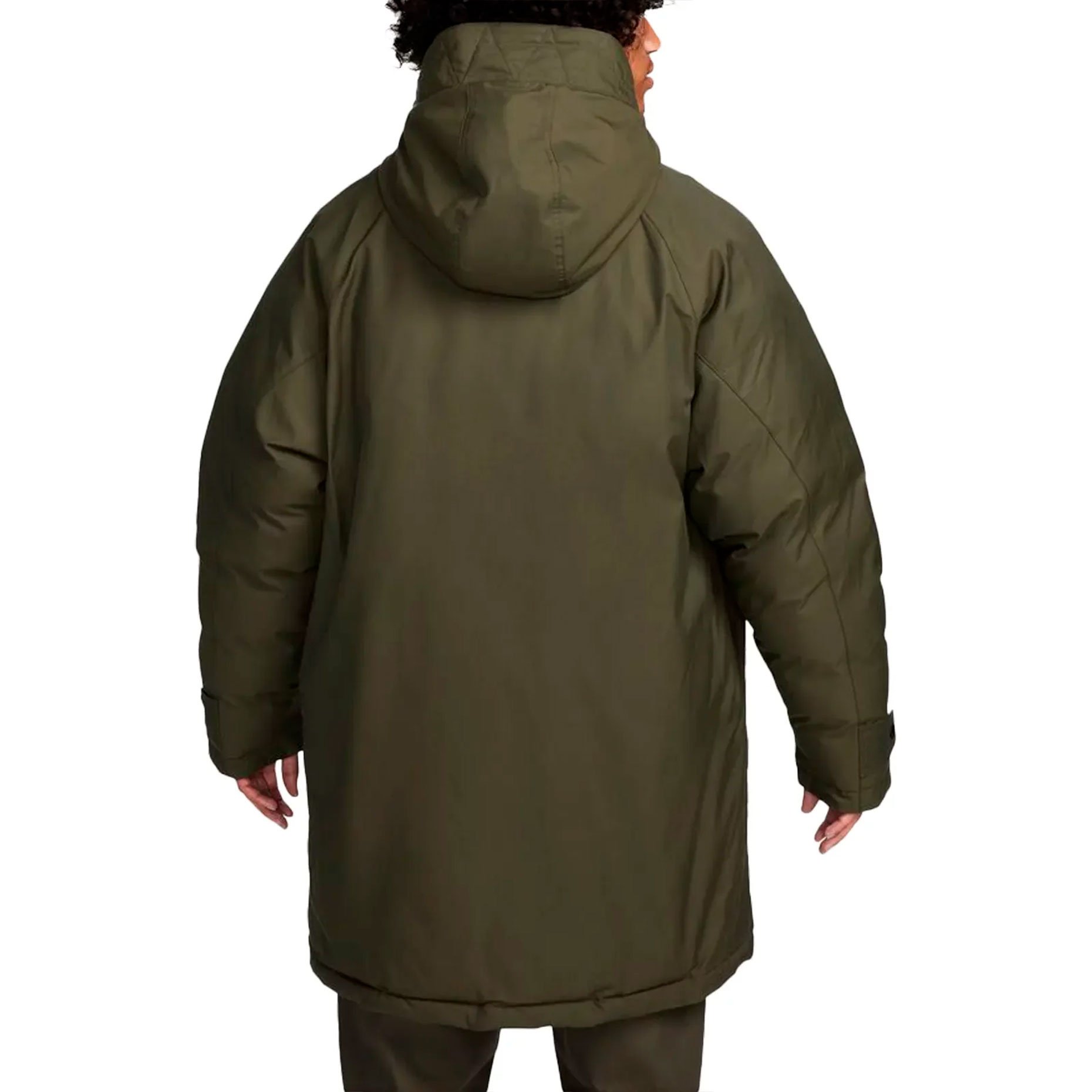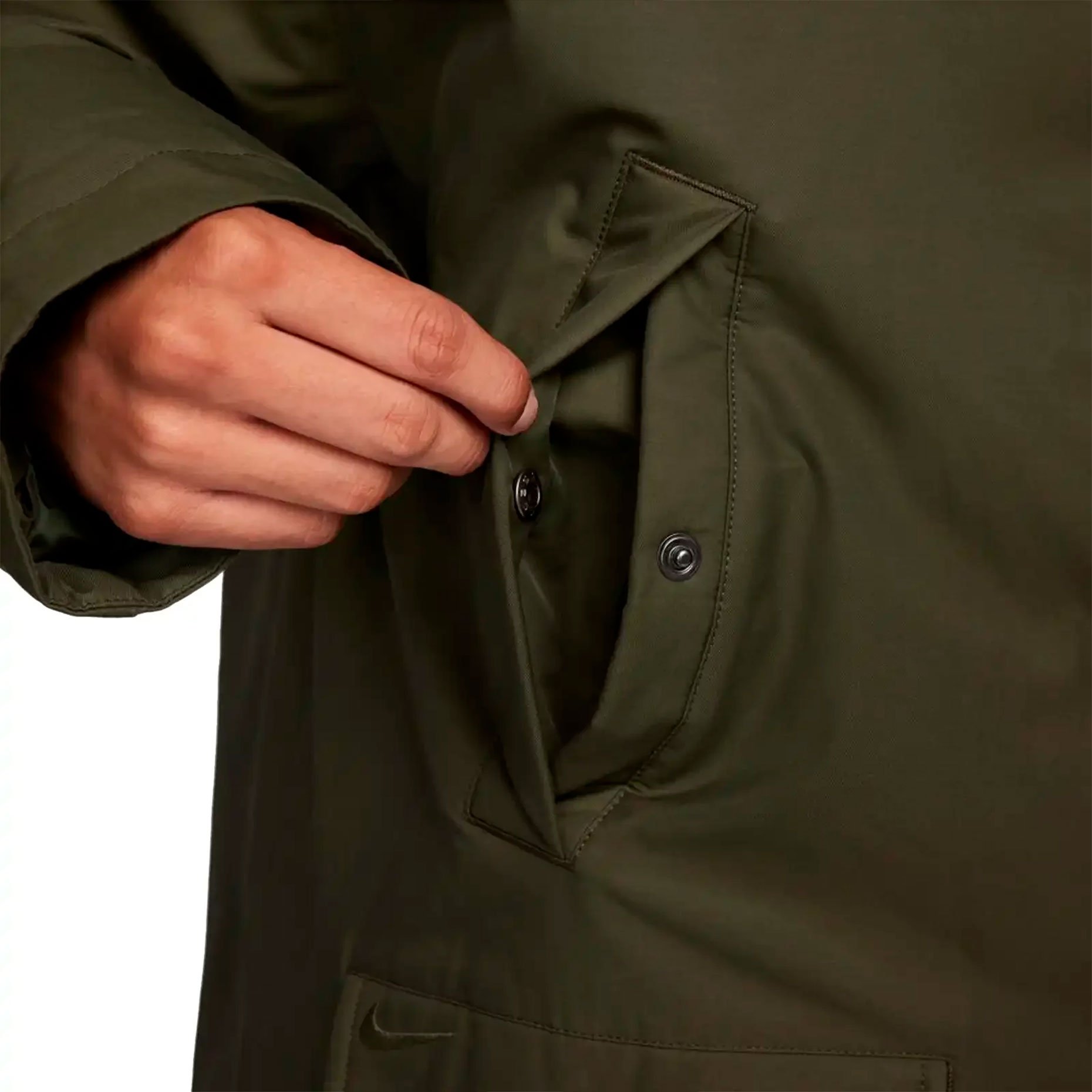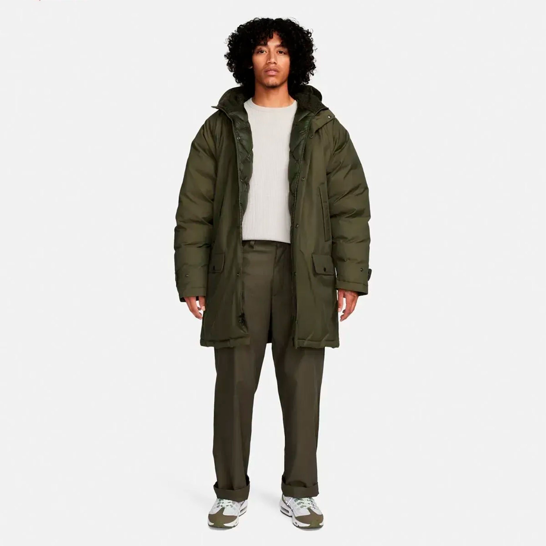 Свободный крой с расширенной посадкой в области плеч и груди позволяет легко надевать парку поверх объёмной одежды, а гладкая подкладка из тафты обеспечивает комфорт и лёгкость при движении. Капюшон отделан ворсистым флисом, который добавляет тепла и защищает голову от холода и ветра. Штормовой клапан по всей длине предотвращает проникновение холодного воздуха, а регулируемые манжеты с застёжками плотно фиксируются на запястьях, удерживая тепло. Для удобства предусмотрены боковые карманы с угловым расположением — их легко использовать даже при сжатых руках, а также два накладных кармана с клапанами для безопасного хранения телефона, ключей или перчаток. Логотип Swoosh на клапане левого кармана — сдержанная деталь, подчёркивающая принадлежность к бренду.