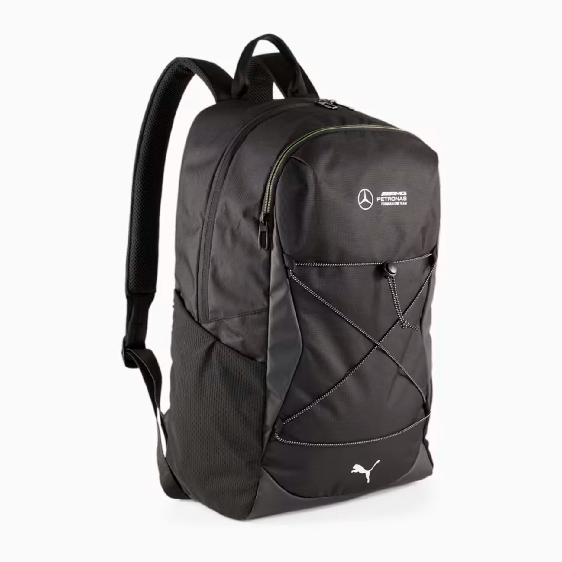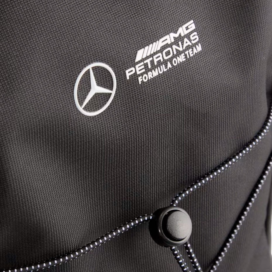 Продуманная конструкция включает специальное отделение для ноутбука, обеспечивающее надежную защиту вашего устройства. Два боковых сетчатых кармана позволяют удобно разместить бутылки с водой или другие необходимые мелочи. Эластичный шнур спереди добавляет функциональности, а премиальные логотипы Mercedes-AMG Petronas Motorsport и PUMA Cat создают стильный спортивный образ. Использование переработанных материалов подчеркивает экологичность модели.