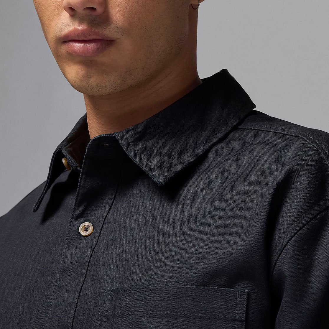 Уникальная текстура ткани с рисунком «елочка» придаёт рубашке изысканный вид, а тональная вышивка добавляет элегантные акценты. Эти детали помогают подчеркнуть индивидуальность стиля и выделяют модель среди других.