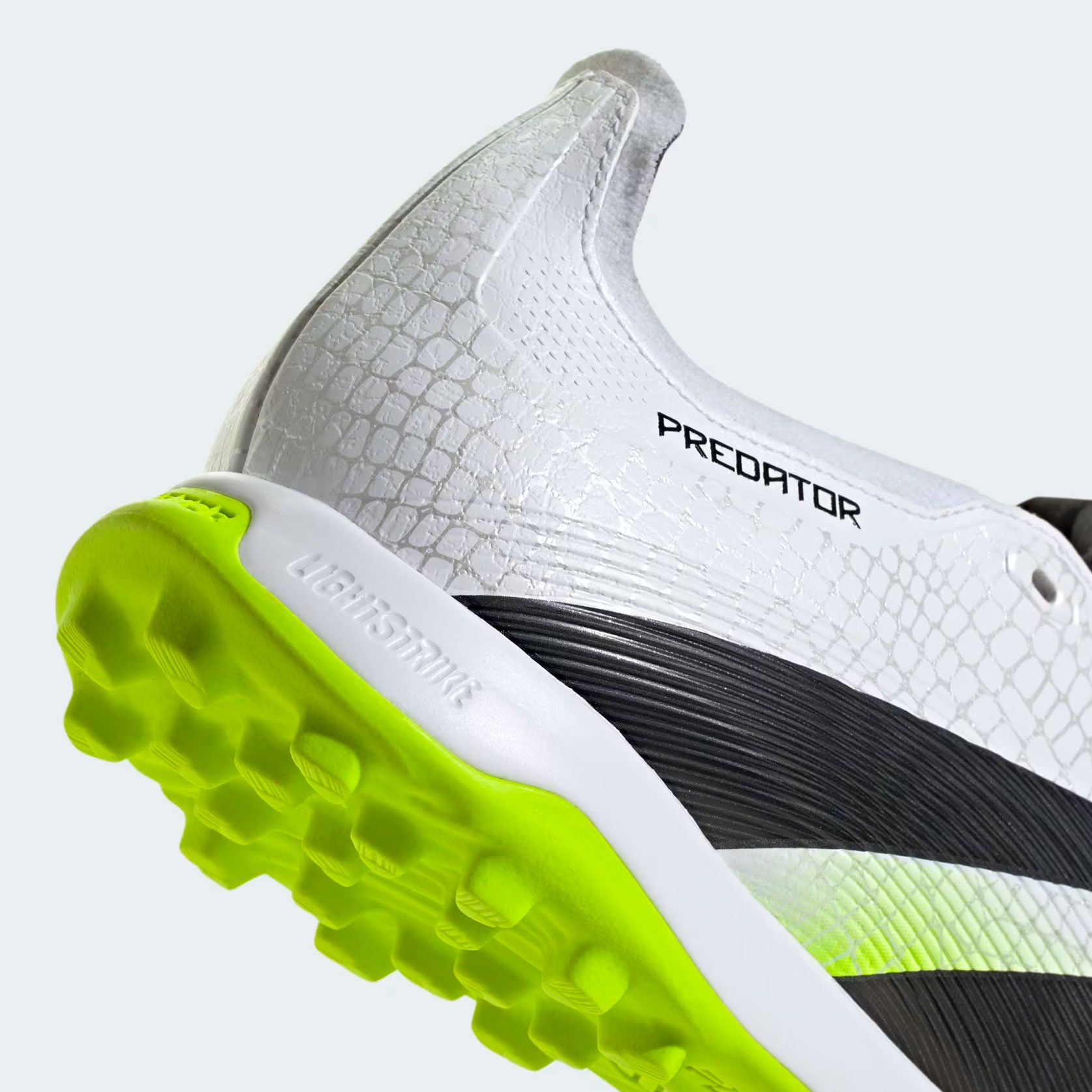 Резиновая подошва с продуманным рисунком шипов гарантирует отличное сцепление и маневренность на искусственной траве. Промежуточная подошва Lightstrike обеспечивает мгновенный отклик при движениях, а низкий профиль способствует максимальной подвижности игрока. Экологичность модели подтверждается использованием не менее 20% переработанных материалов в производстве.