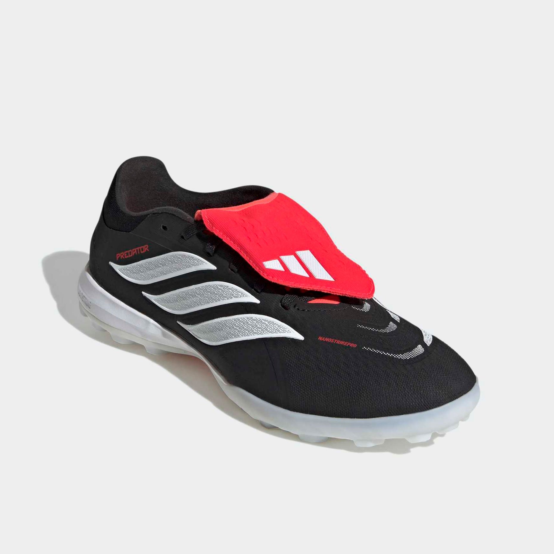 Шиповки adidas Predator Pro FT TF — это профессиональная модель, созданная для игроков высокого уровня, которым важны точность, мощь и полный контроль на полях с искусственным газоном. Эта версия продолжает эволюцию легендарной серии Predator, объединяя наследие бренда с передовыми технологиями нового поколения. Верх из инновационного материала NANOSTRIKEPRO обеспечивает исключительную мягкость, лёгкость и плотное прилегание к стопе, а интегрированные резиновые элементы на внутренней поверхности создают максимальное сцепление с мячом. Отказ от традиционных плавников StrikeSkin позволил получить более чистую и ровную зону контакта, что особенно важно при точных передачах, ударах и ведении в условиях высокой скорости игры.