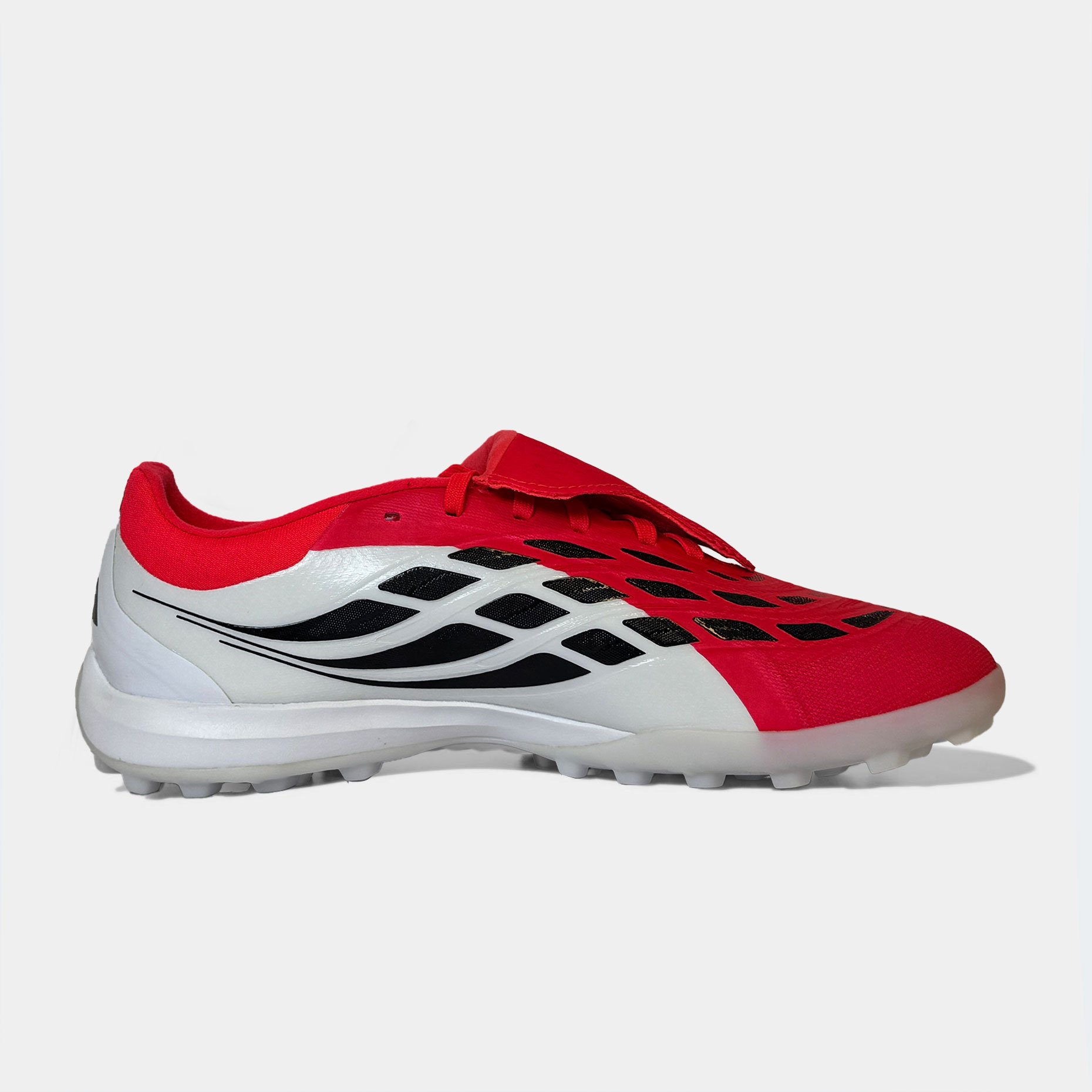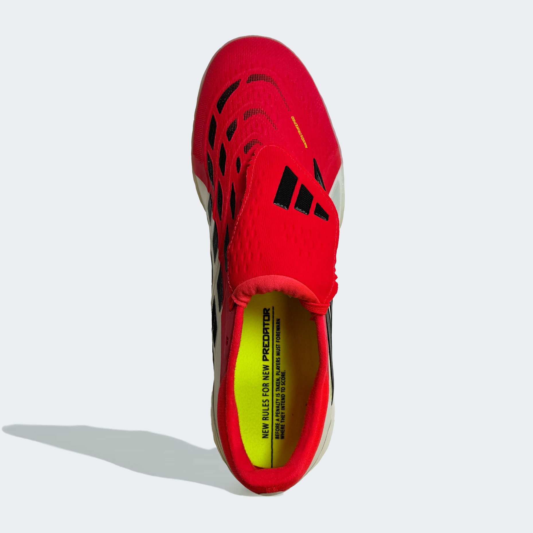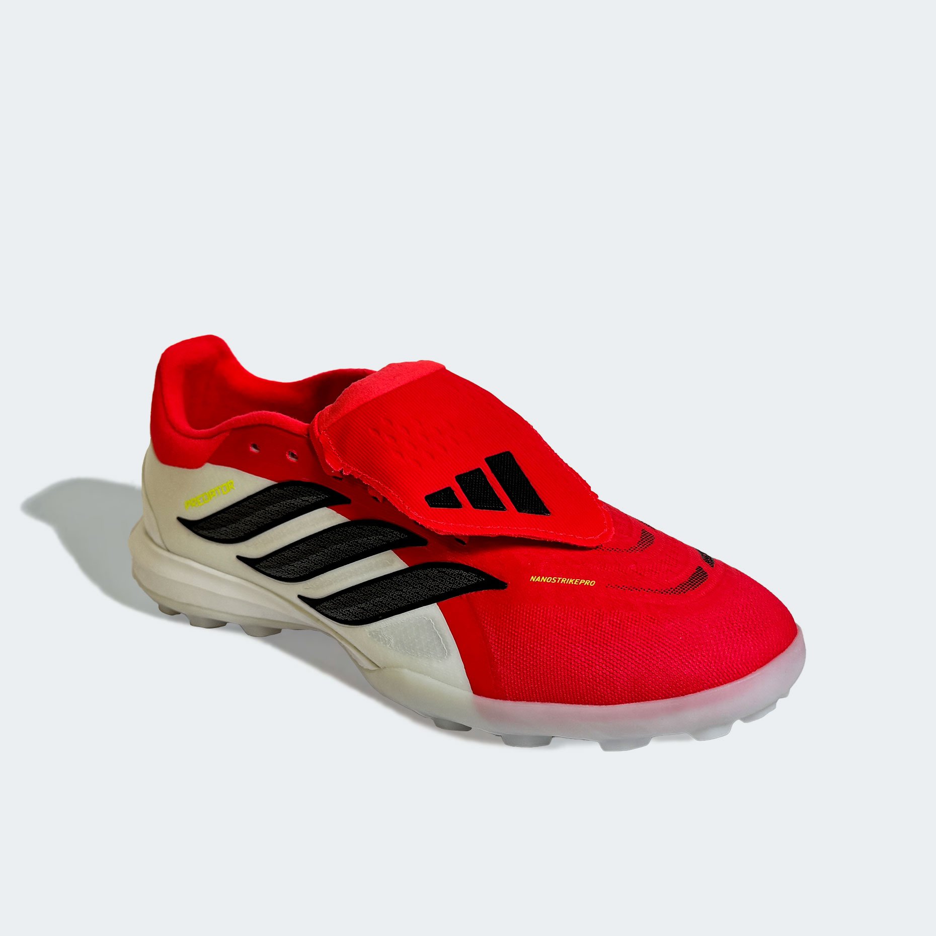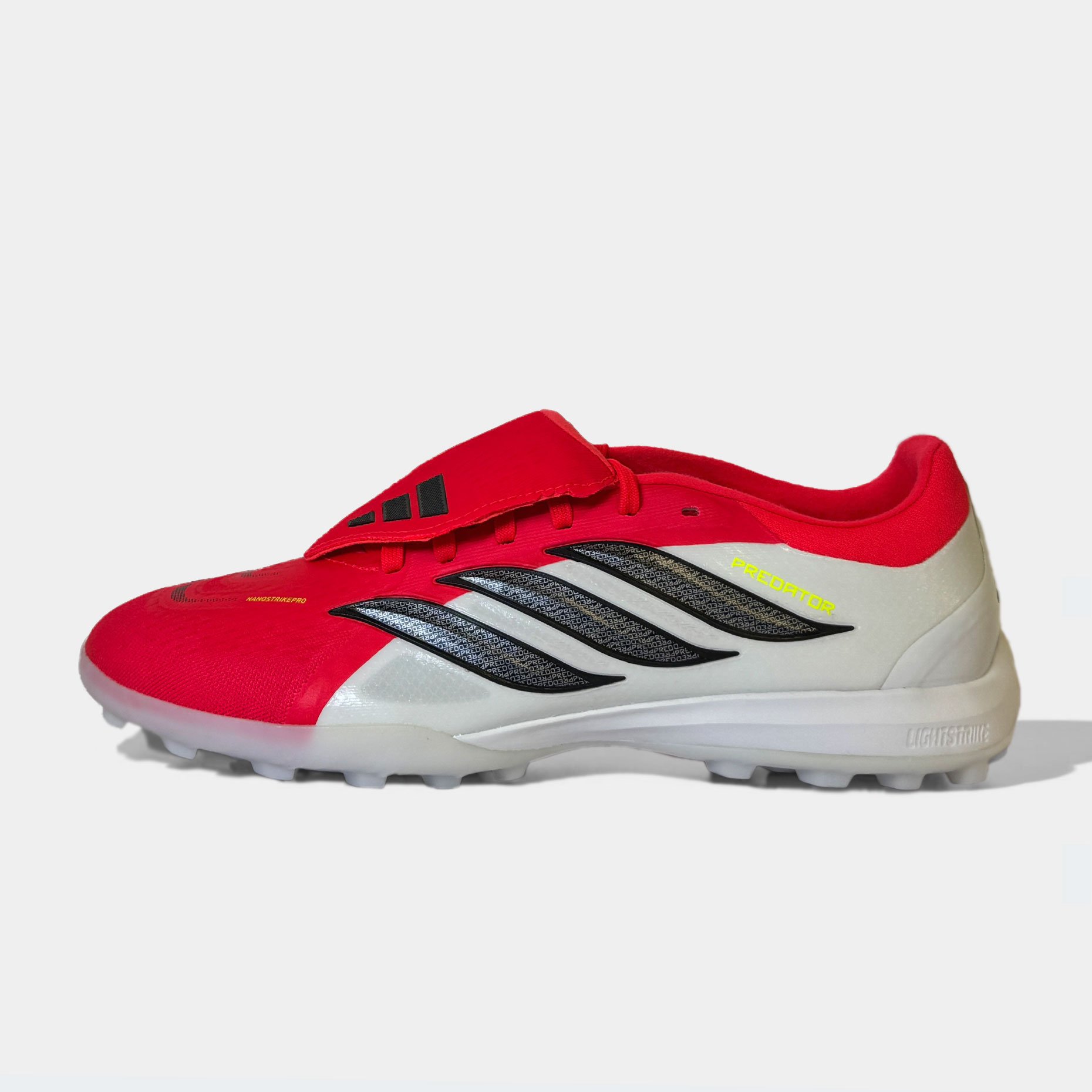 Шиповки adidas Predator Pro FT TF — это профессиональная модель, созданная для игроков высокого уровня, которым важны точность, мощь и полный контроль на полях с искусственным газоном. Эта версия продолжает эволюцию легендарной серии Predator, объединяя наследие бренда с передовыми технологиями нового поколения. Верх из инновационного материала NANOSTRIKEPRO обеспечивает исключительную мягкость, лёгкость и плотное прилегание к стопе, а интегрированные резиновые элементы на внутренней поверхности создают максимальное сцепление с мячом. Отказ от традиционных плавников StrikeSkin позволил получить более чистую и ровную зону контакта, что особенно важно при точных передачах, ударах и ведении в условиях высокой скорости игры.