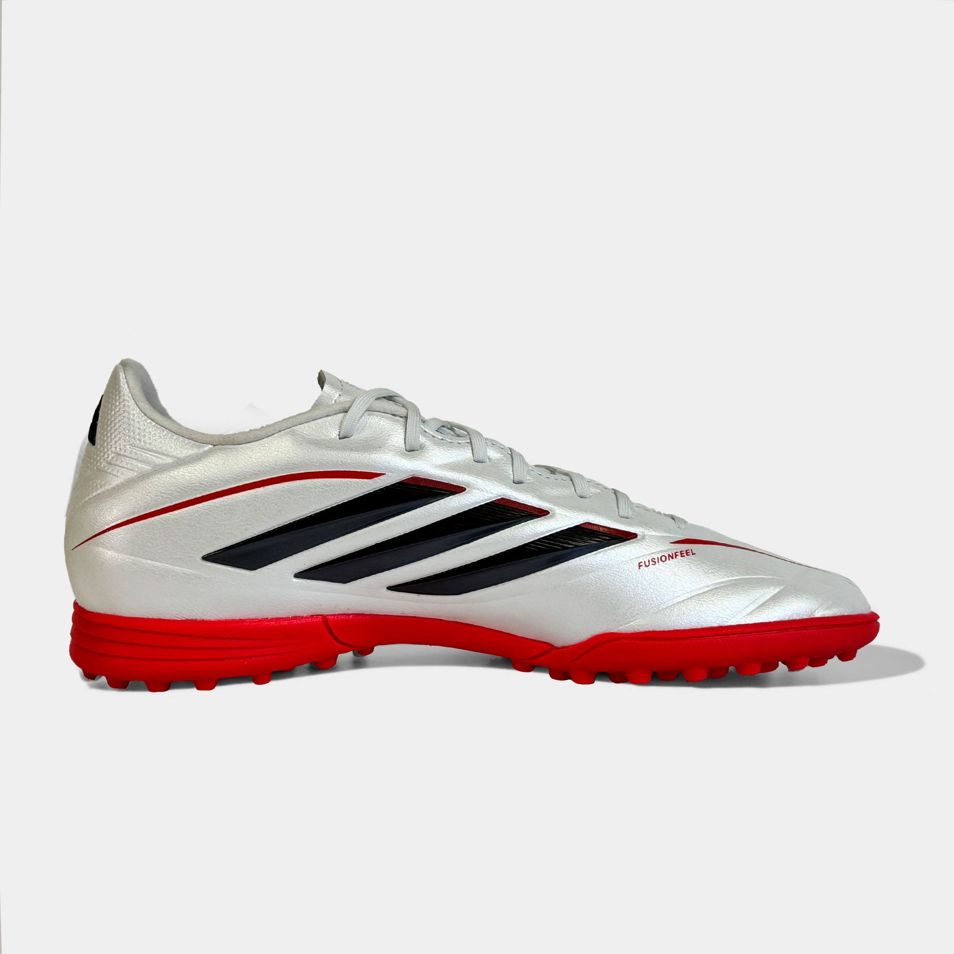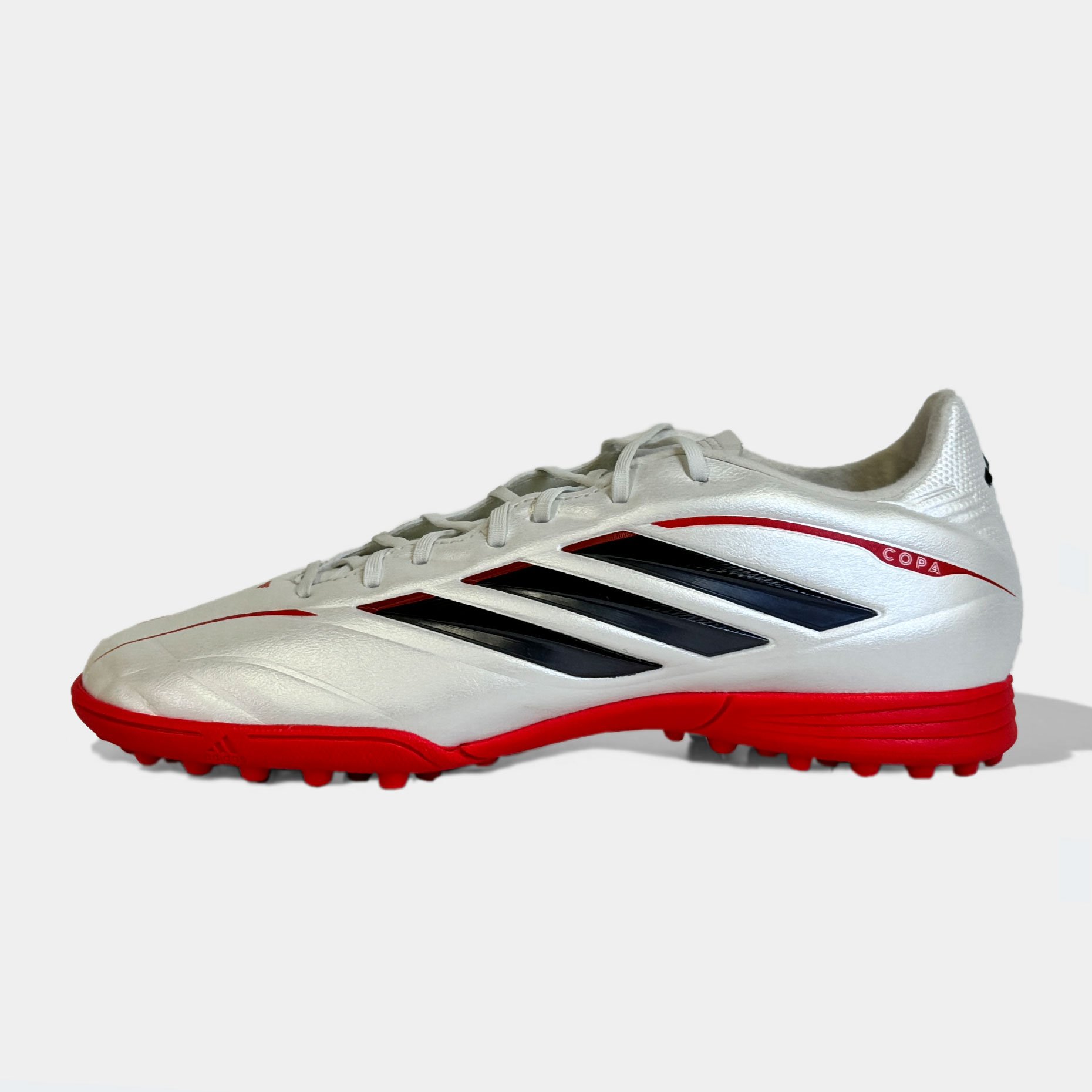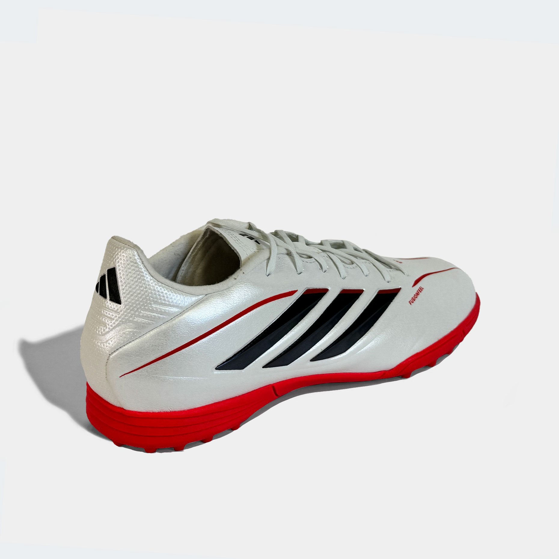 Детские шиповки adidas Copa Pure IV League TF — это обновлённая тренировочная модель, созданная для юных футболистов, для игры на твёрдых покрытиях с искусственным газоном и коротким ворсом. Эта версия продолжает традиции легендарной серии Copa, сочетая классический стиль с современными технологиями. Верх из синтетического материала Fusionfeel имитирует ощущение натуральной кожи — он мягкий, гибкий и идеально облегает стопу, обеспечивая превосходную тактильную чувствительность при контакте с мячом. Плавные линии дизайна подчёркивают элегантность модели, а плоские шнурки создают ровную зону удара, позволяя точнее контролировать пасы и удары.