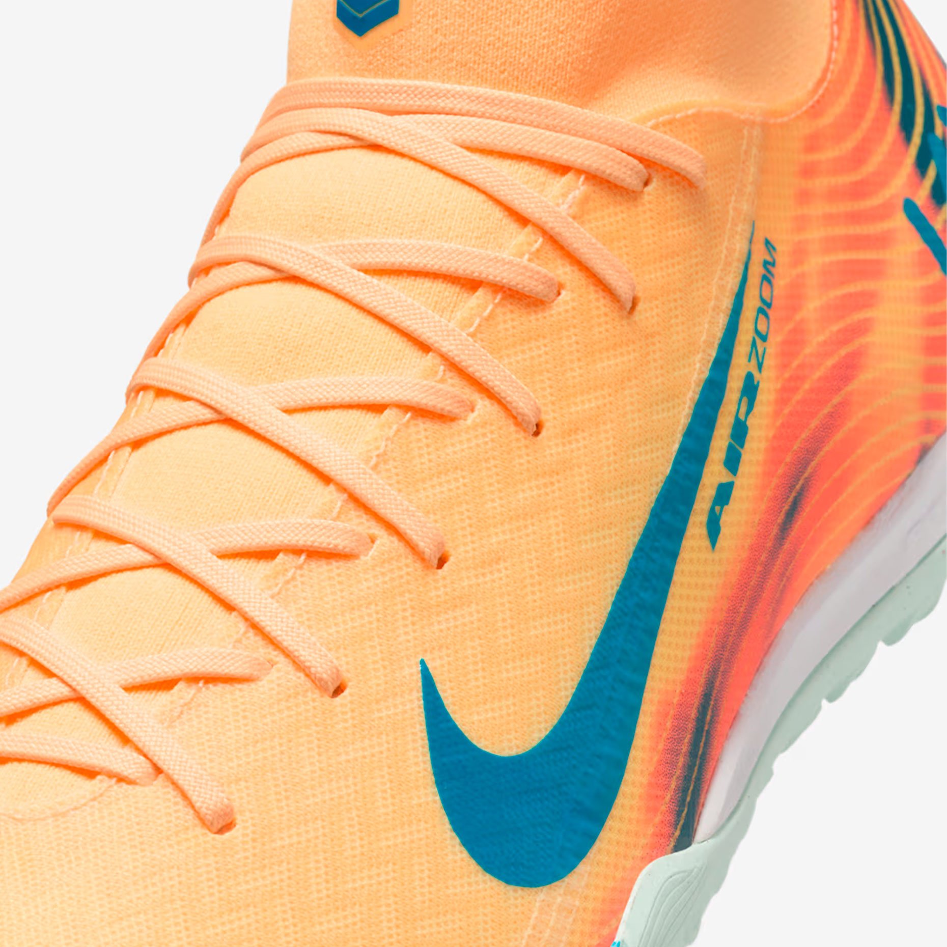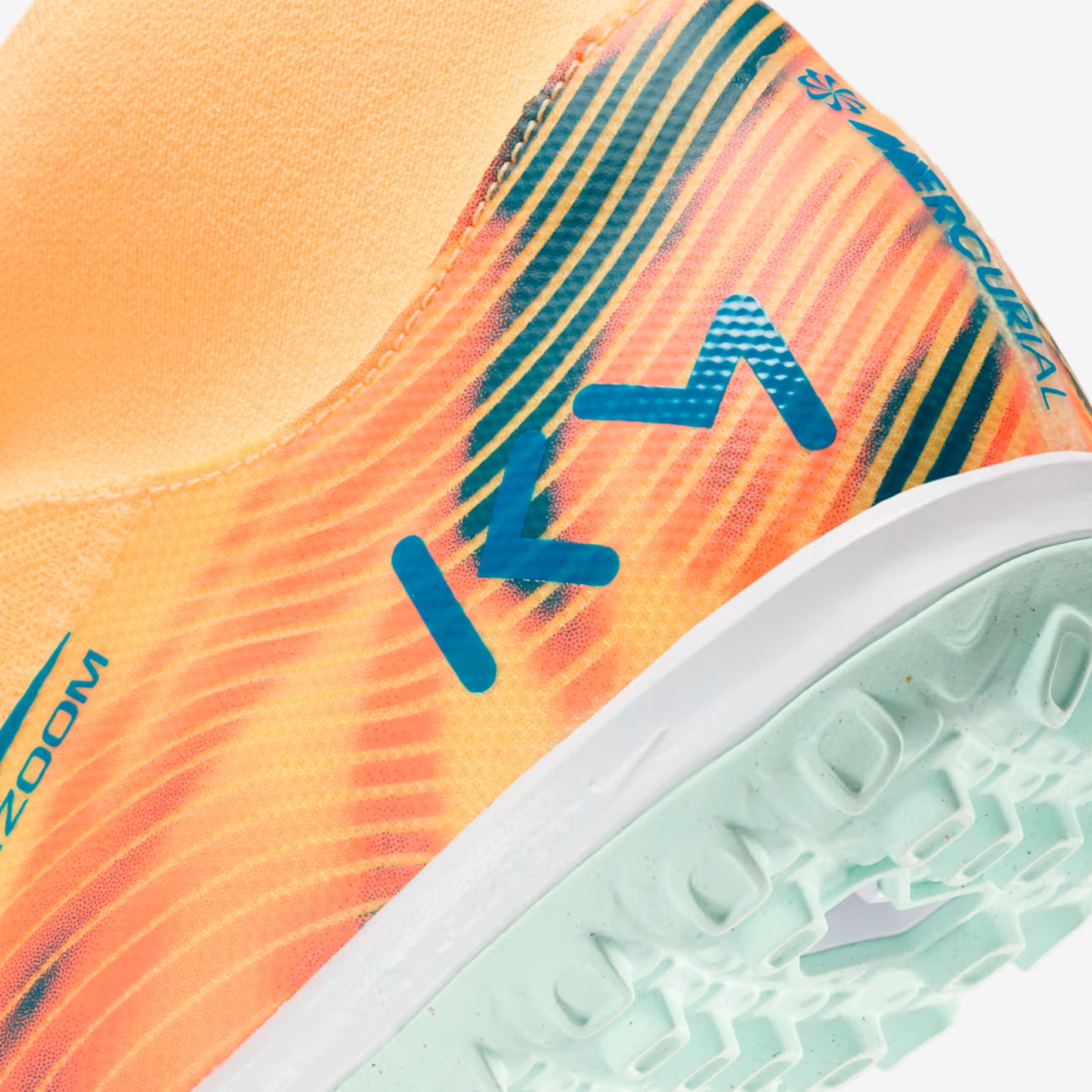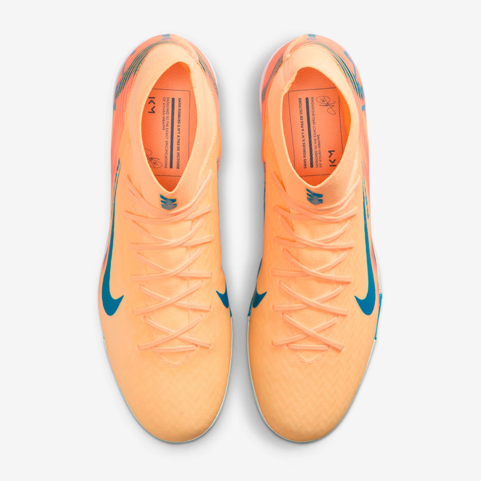 Дизайн получил уникальную расцветку: верх выполнен в ярком оранжевом оттенке Melon Tint, а контрастные акценты в бледно‑голубом цвете использованы на логотипе Swoosh и подошве. Внутри бутс размещено вдохновляющее послание на французском: «SANS RISQUES IL N’Y A PAS DE VICTOIRE» («Без риска нет победы»).