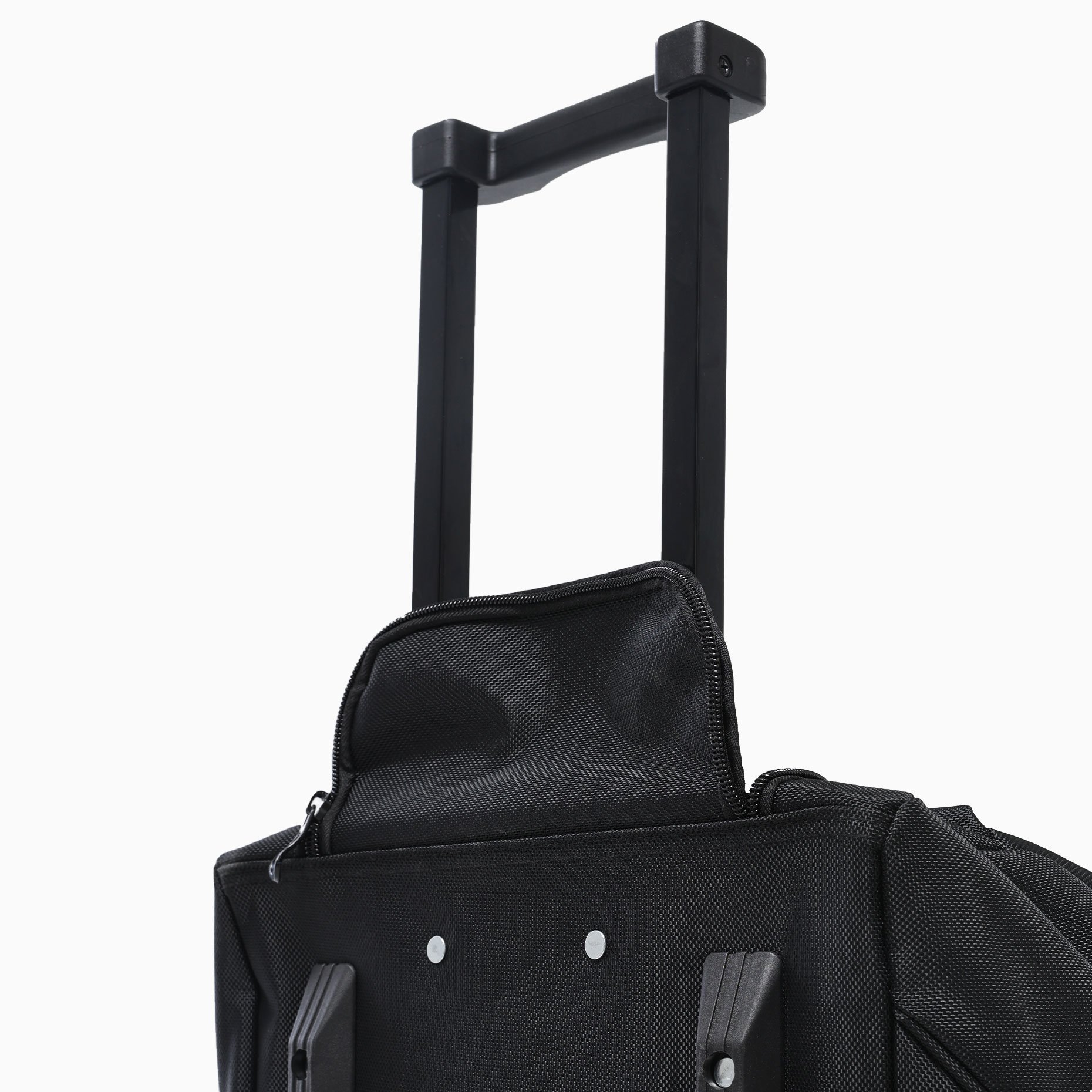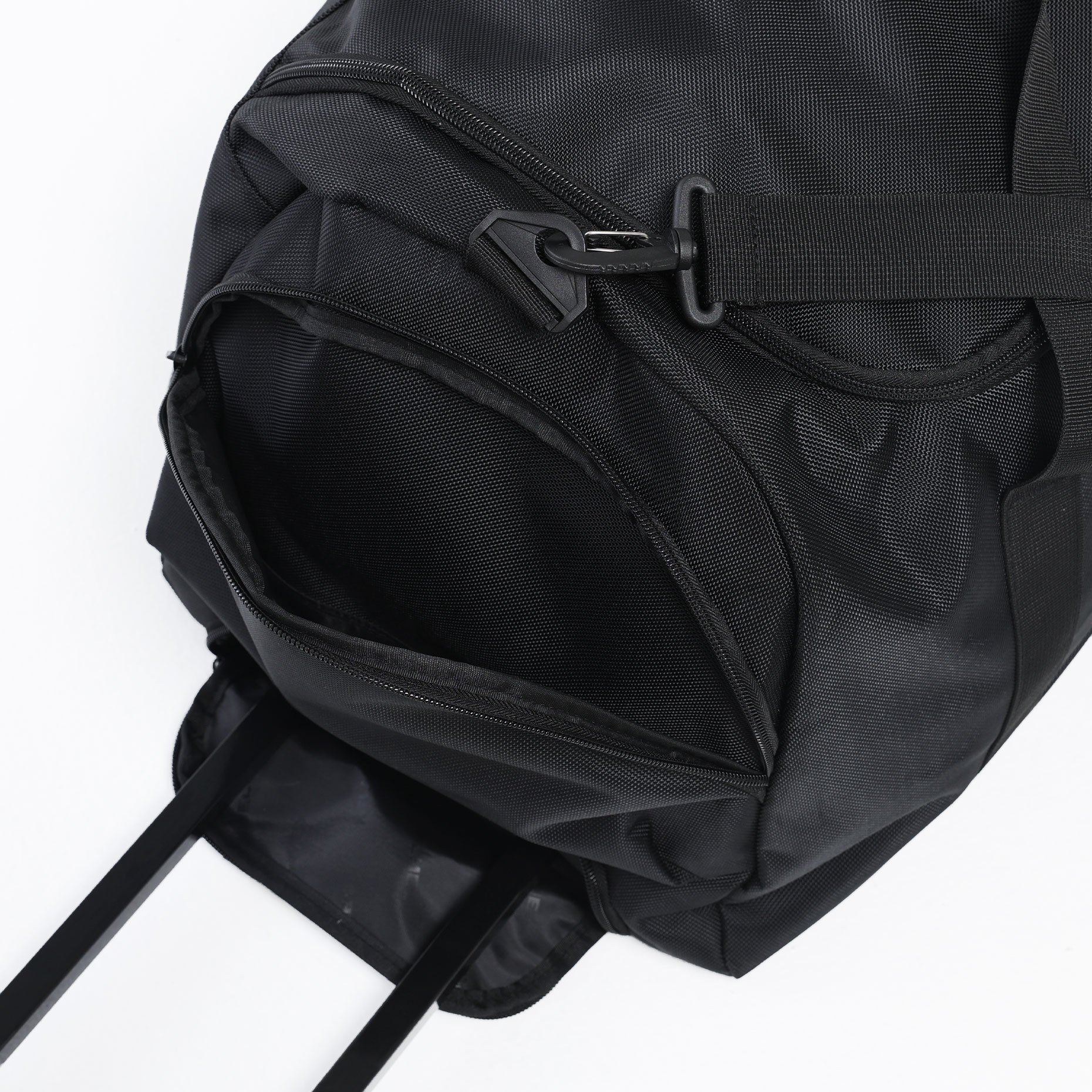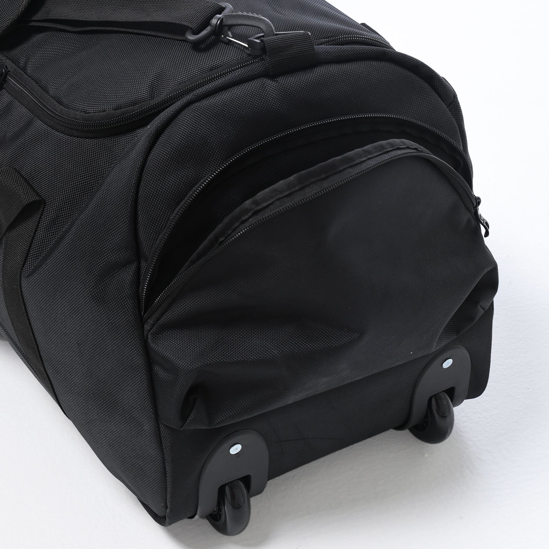 Внутри предусмотрено одно большое отделение для основной экипировки и два боковых кармана на замках — для хранения мелочей и быстрого доступа к ним. Две отдельные ручки можно соединить фиксатором на липучке, что упрощает переноску сумки в руках. Резиновые ножки на дне защищают материал от загрязнений при постановке на землю, а износостойкие колёса гарантируют плавное перемещение даже при полной загрузке.