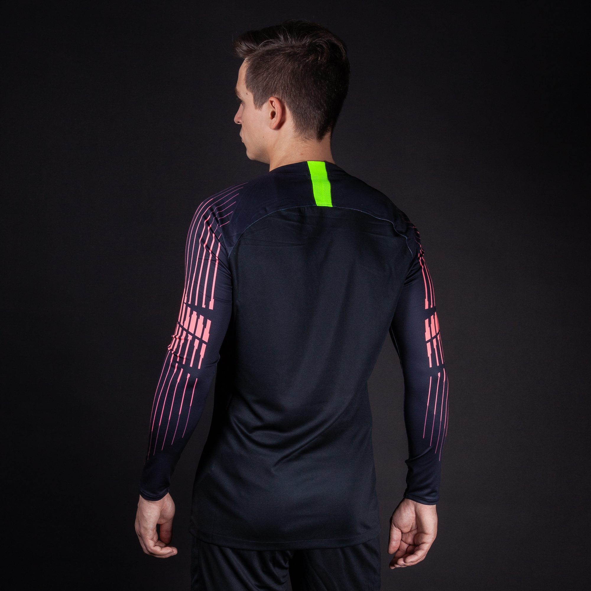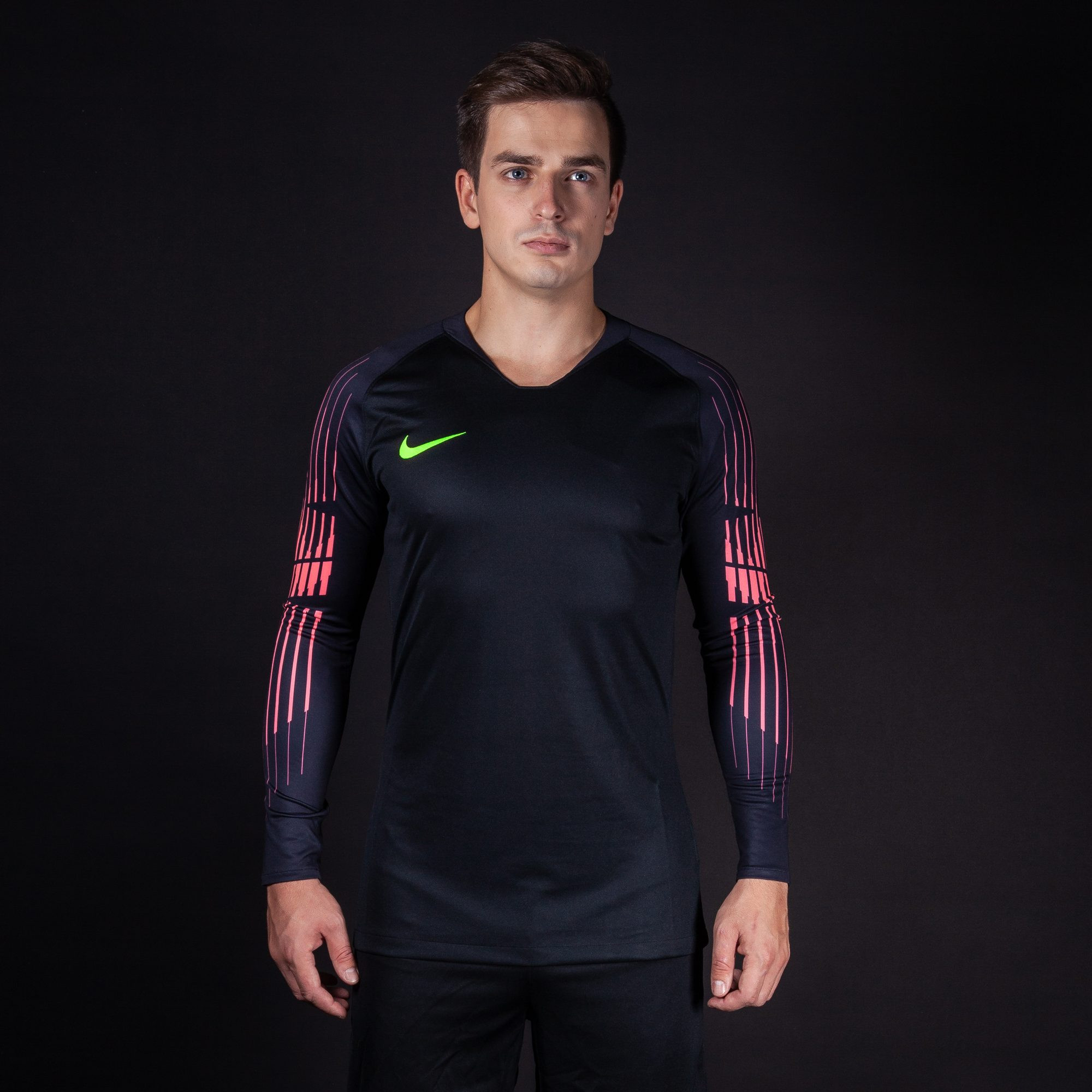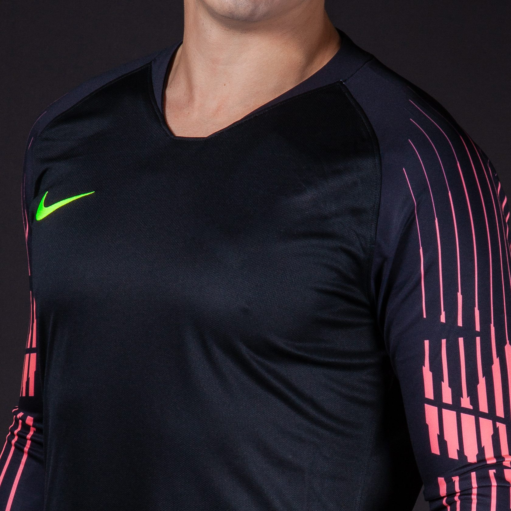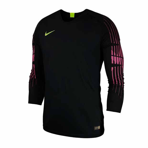 Свитер вратаря Найк черного цвета украшен прерывистыми полосами на рукавах и фирменным логотипом компании на груди. Он поможет спортсмену создать стильный образ.