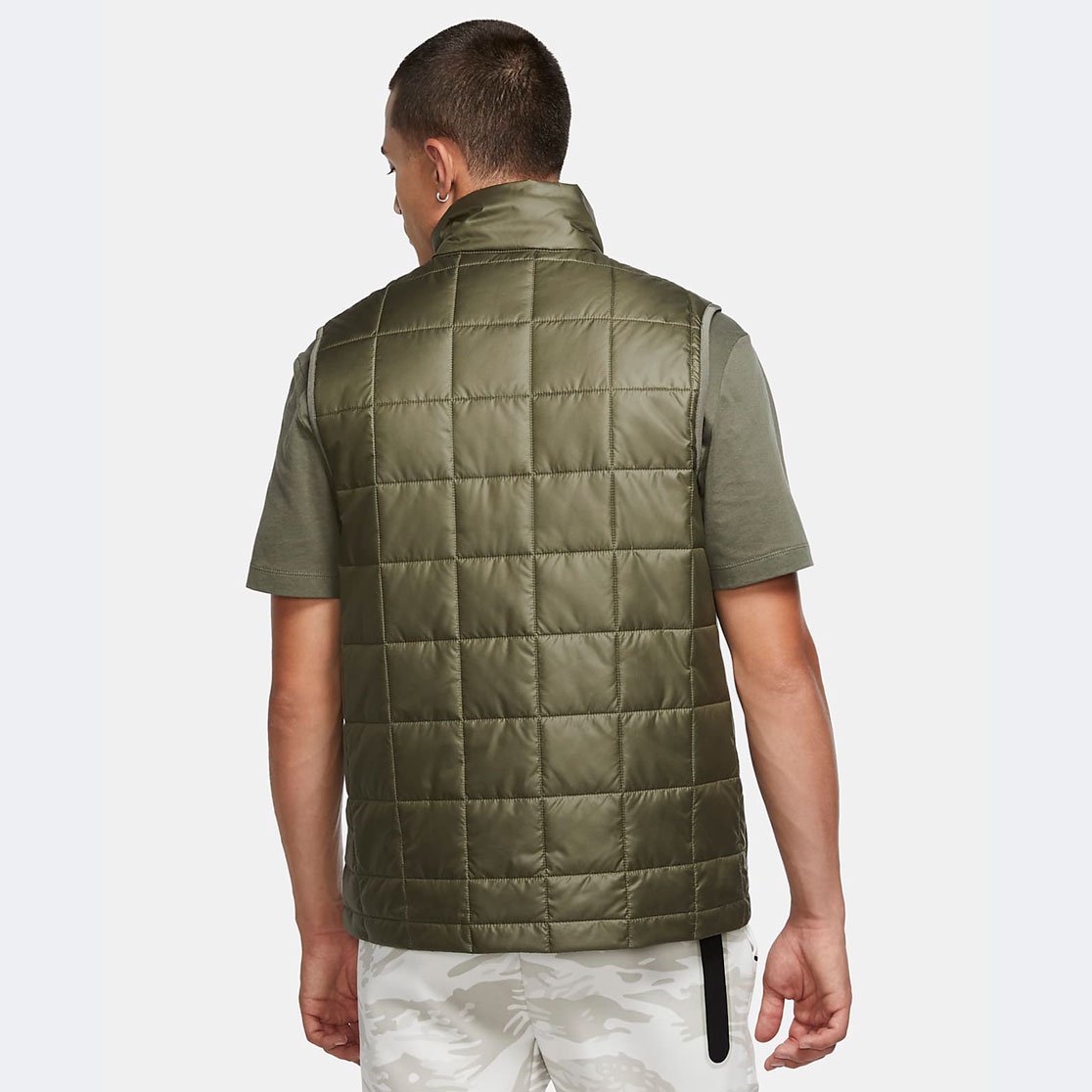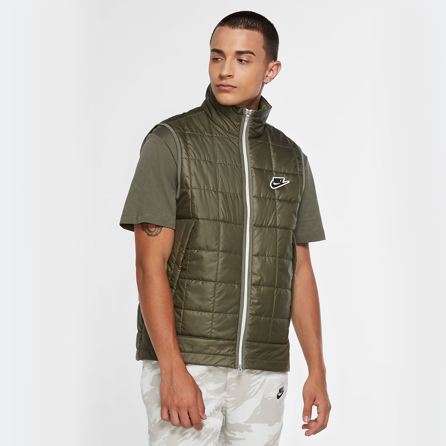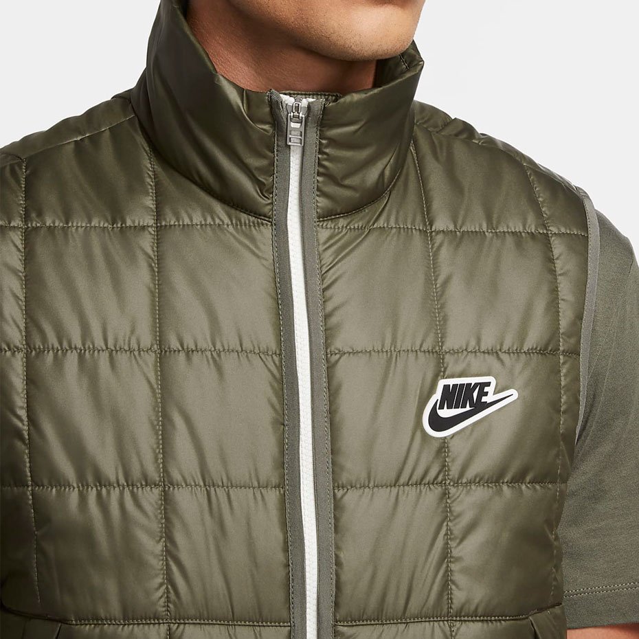 Утепленный мужской жилет Nike с воротником-стойкой. Можно носить и летом с футболкой, и в прохладное время года – со свитшотом или водолазкой. Стильный цвет хаки и логотип Nike на груди.